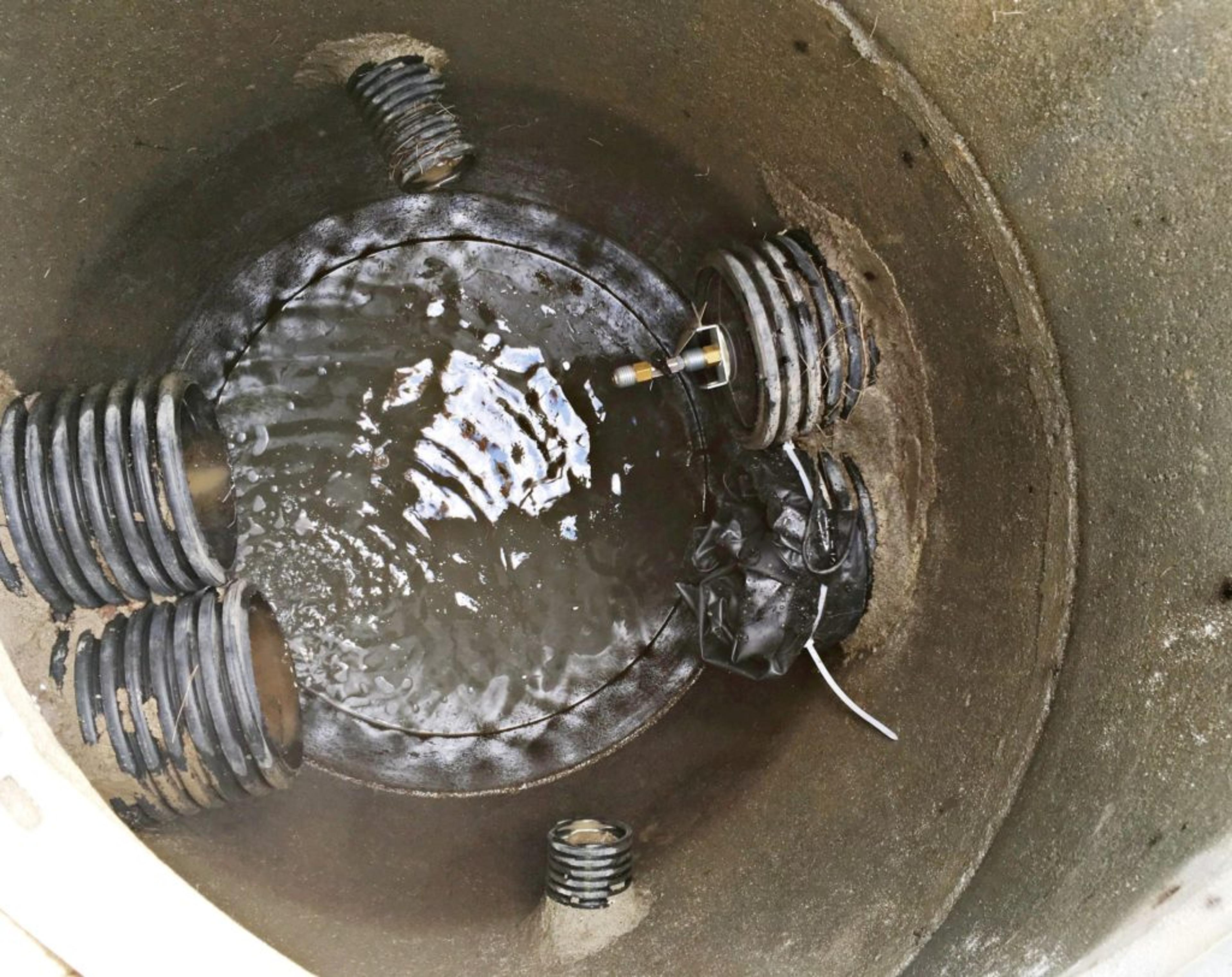 PLUGGA: For å hindre mer forurensning i å nå Storelva ble utløpene (til høyre på bildet) i kummen plugga. Foto: VIB.