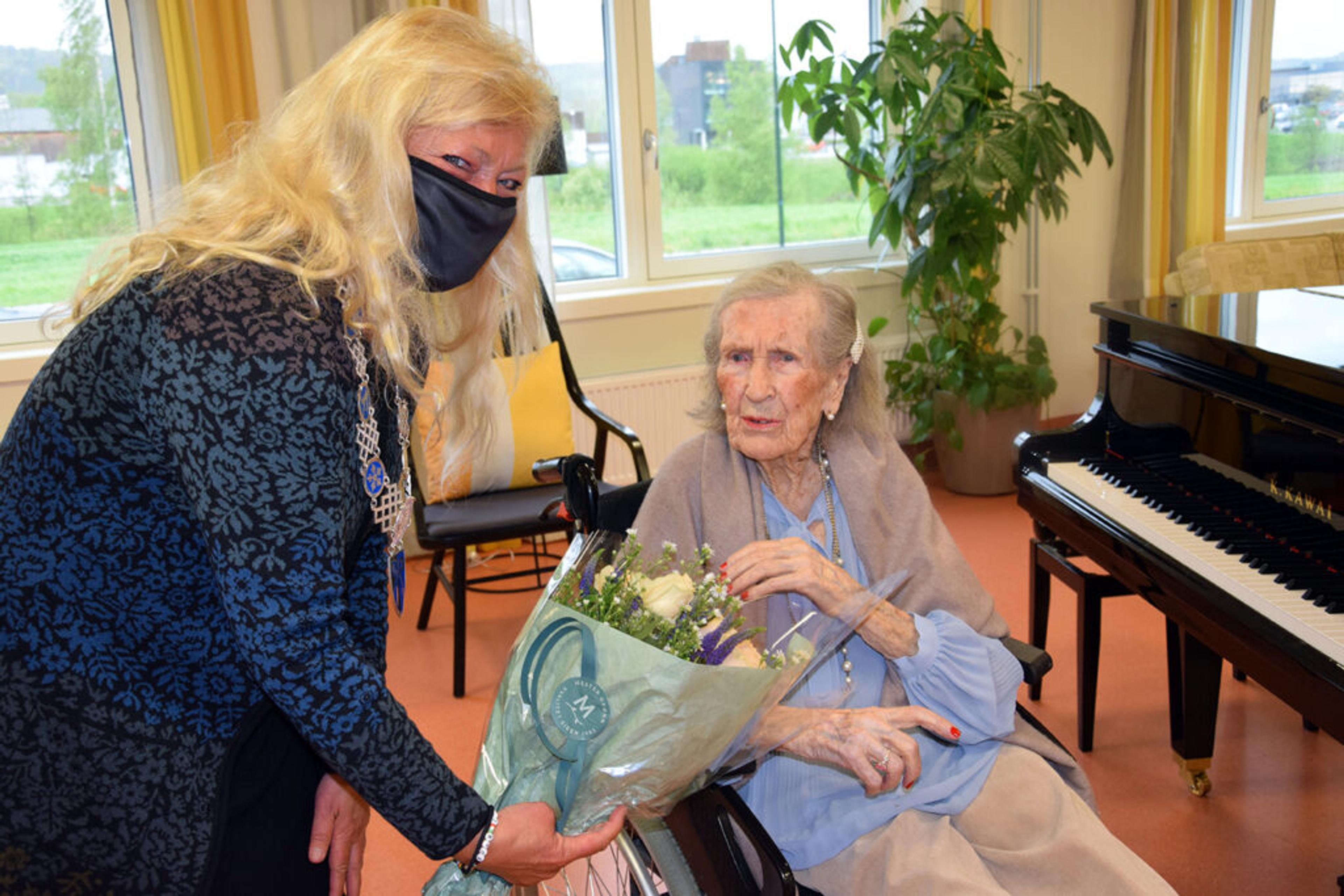 Onsdag 26. mai var ordfører Anne Rygh Pedersen på plass på Re helsehus med en stor blomsterbukett, som hun overrakte 100-årsjubilanten Anne Josephine Grundt.