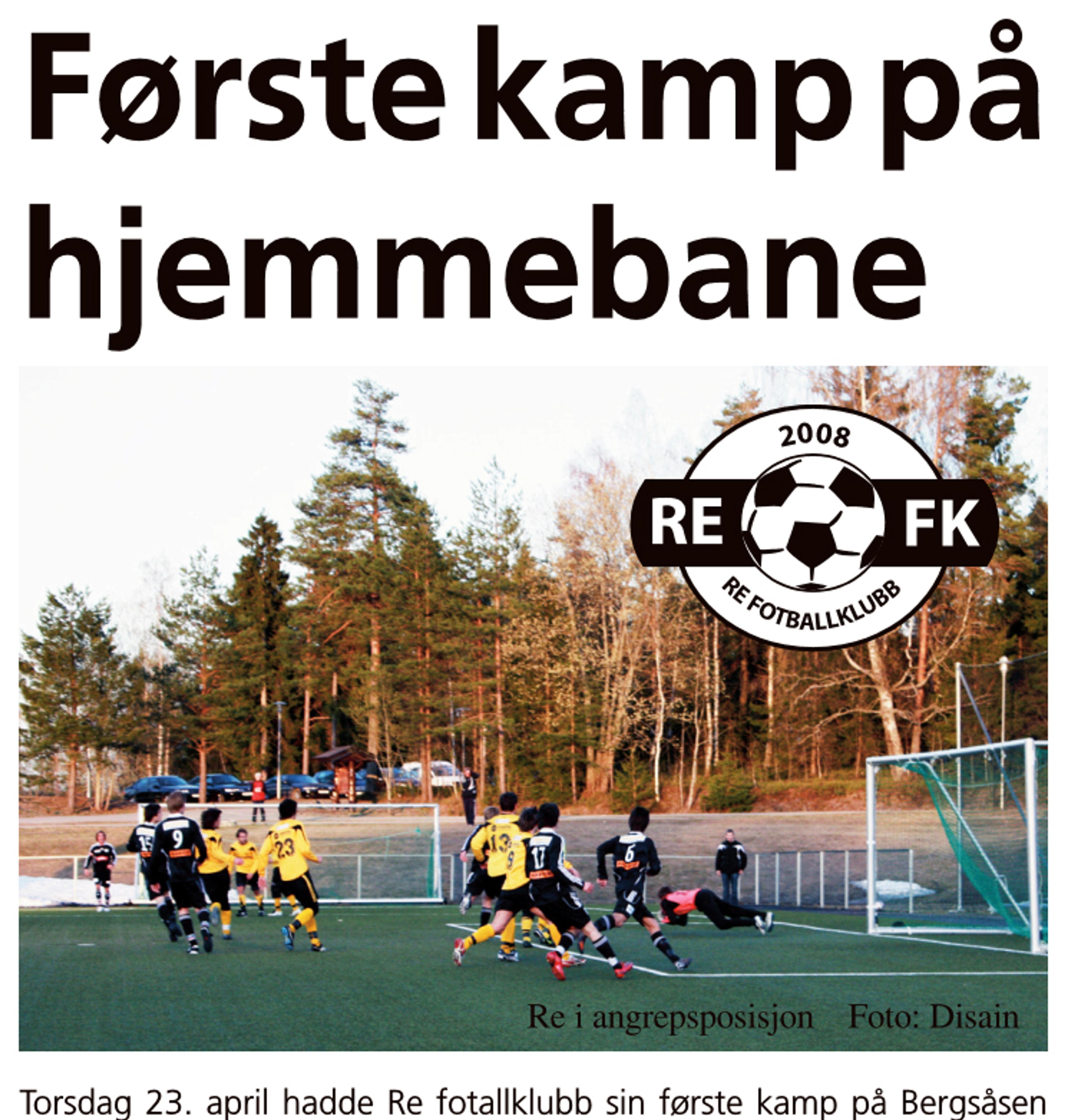 FØRSTE RE FK-REPORTASJE: Re FK ble starta opp i 2008, og våren 2009 var det klart for første hjemmekamp. Der kom også Re FK sin første scoring. Og ReAvisa på plass, selvfølgelig. Faksimile: ReAvisa, april 2009.