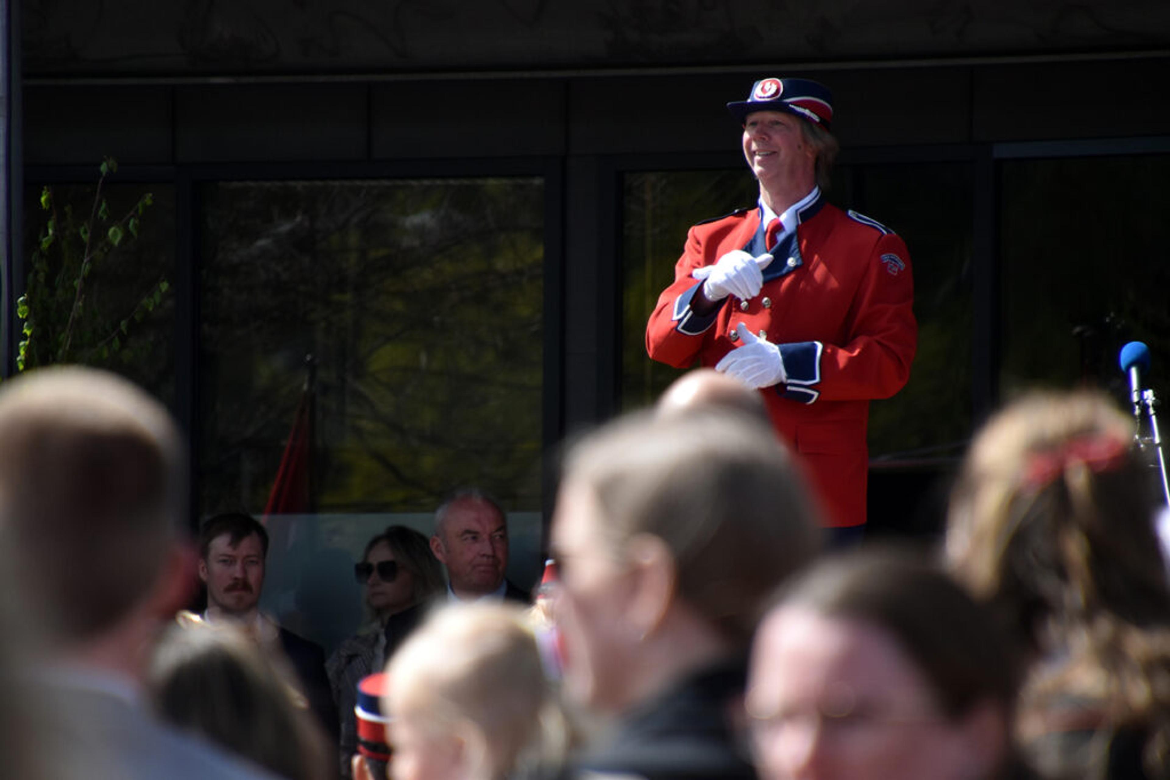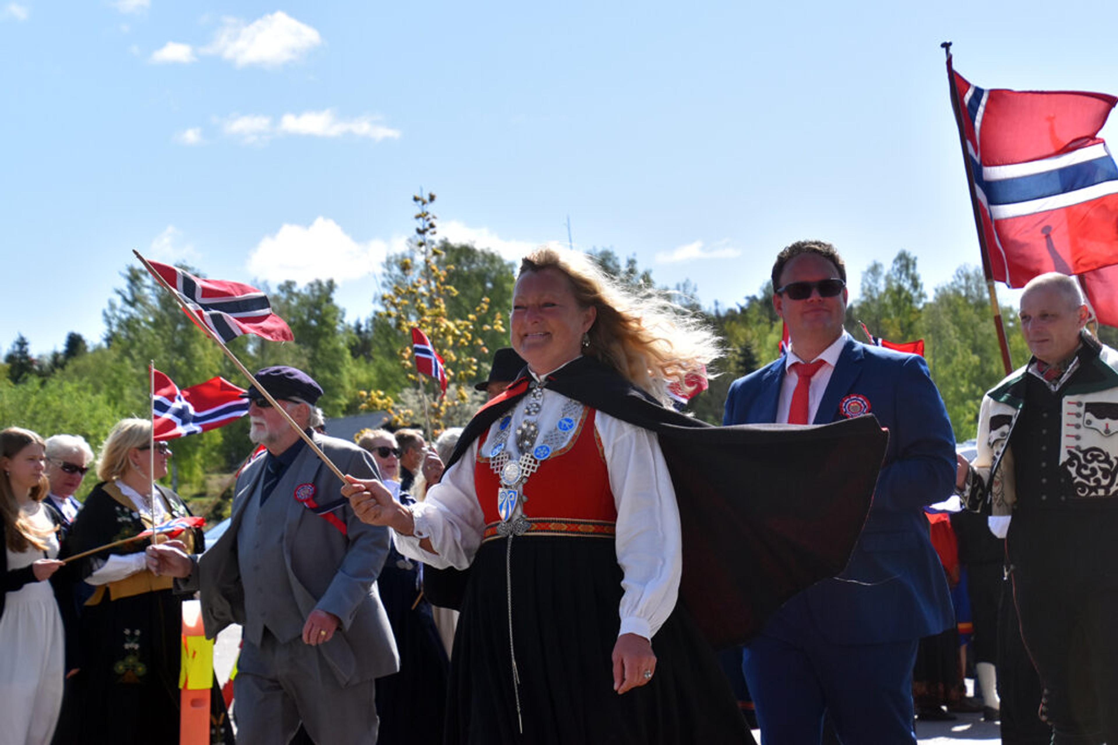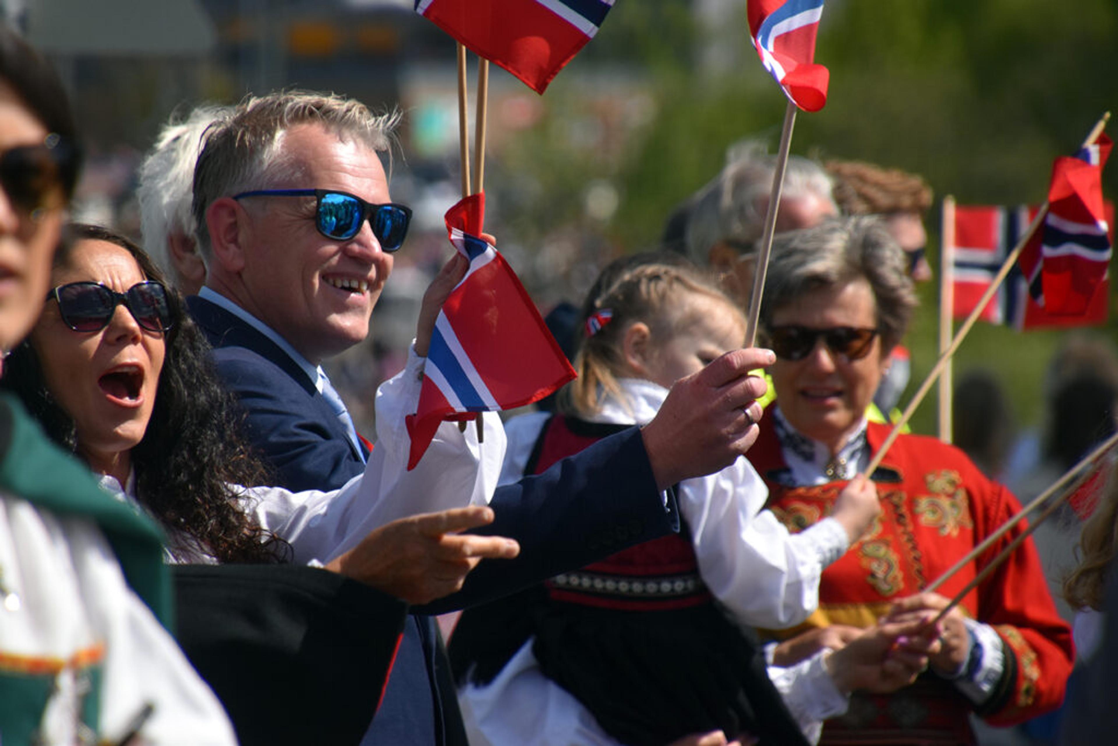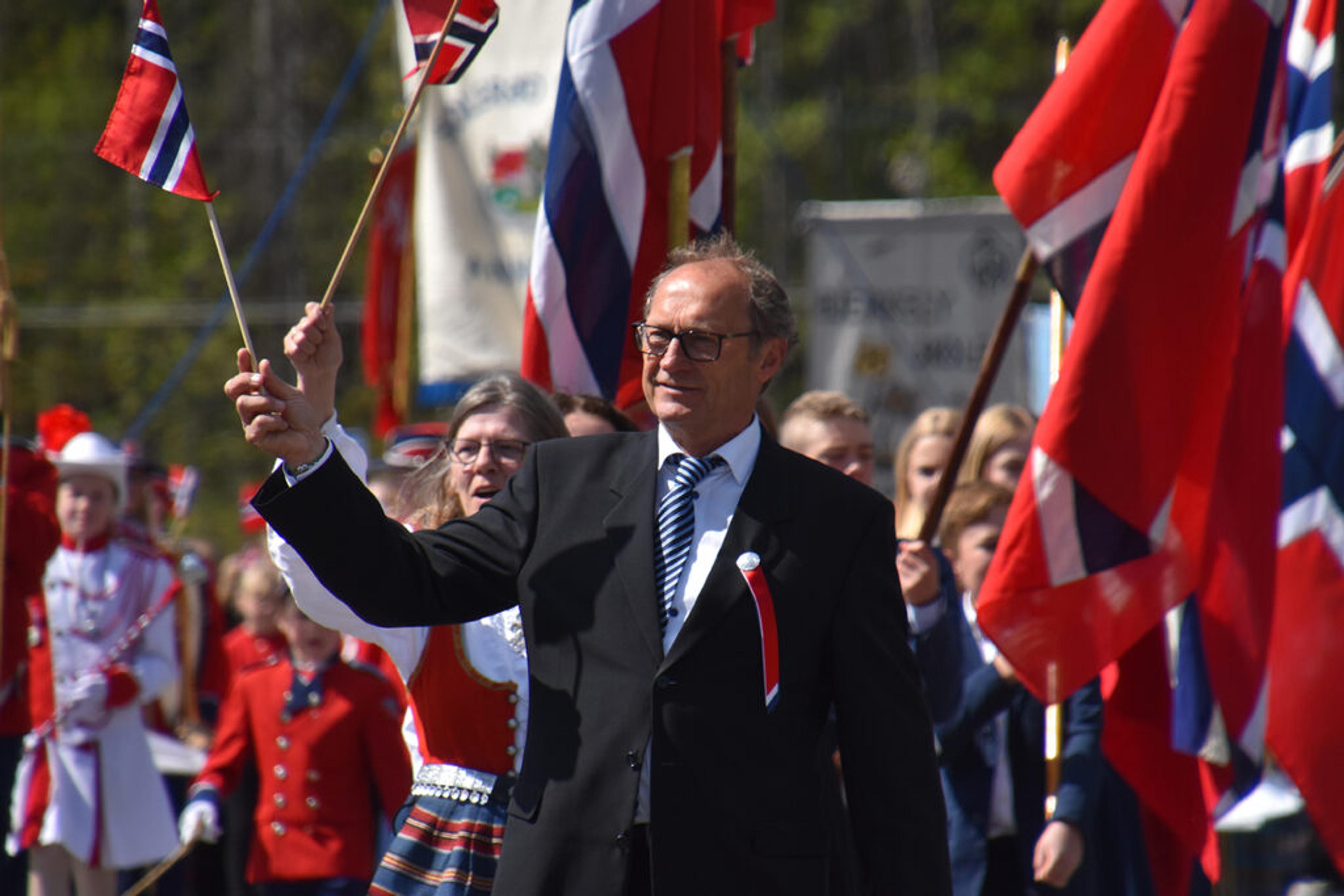 VARAORDFØRER: Steinar Solum hilser folkemengden med flagget. Foto: Stian Ormestad, ReAvisa.
