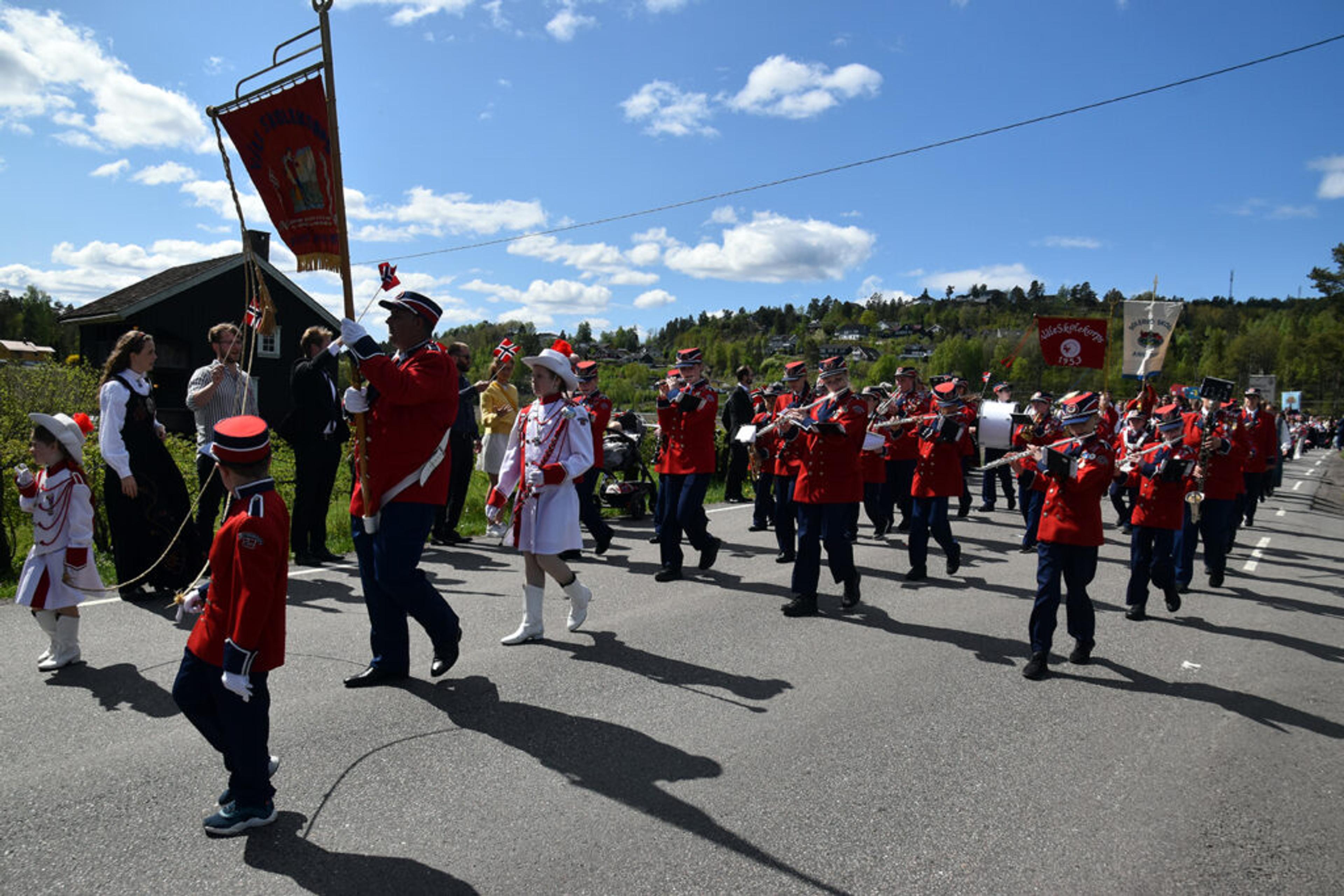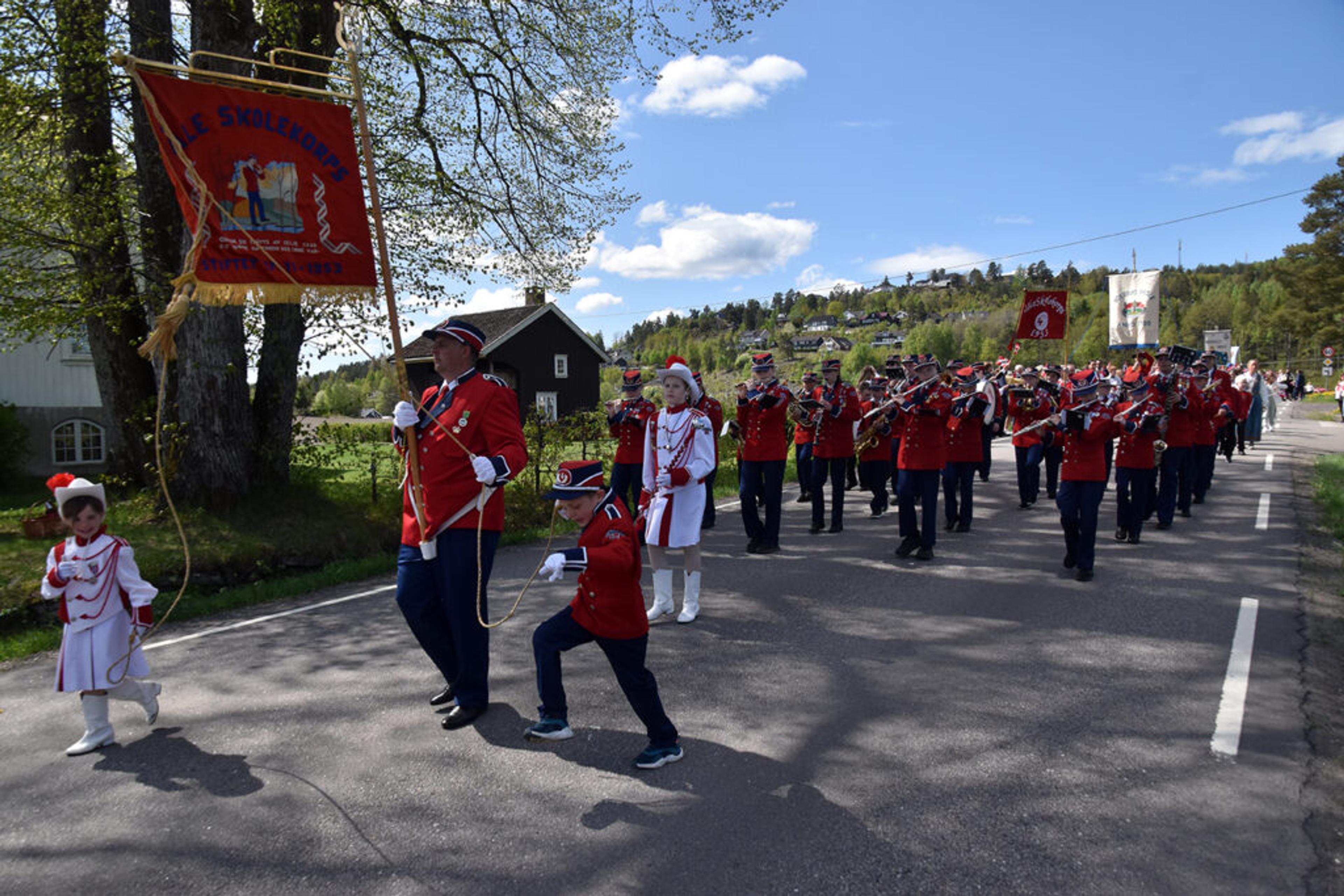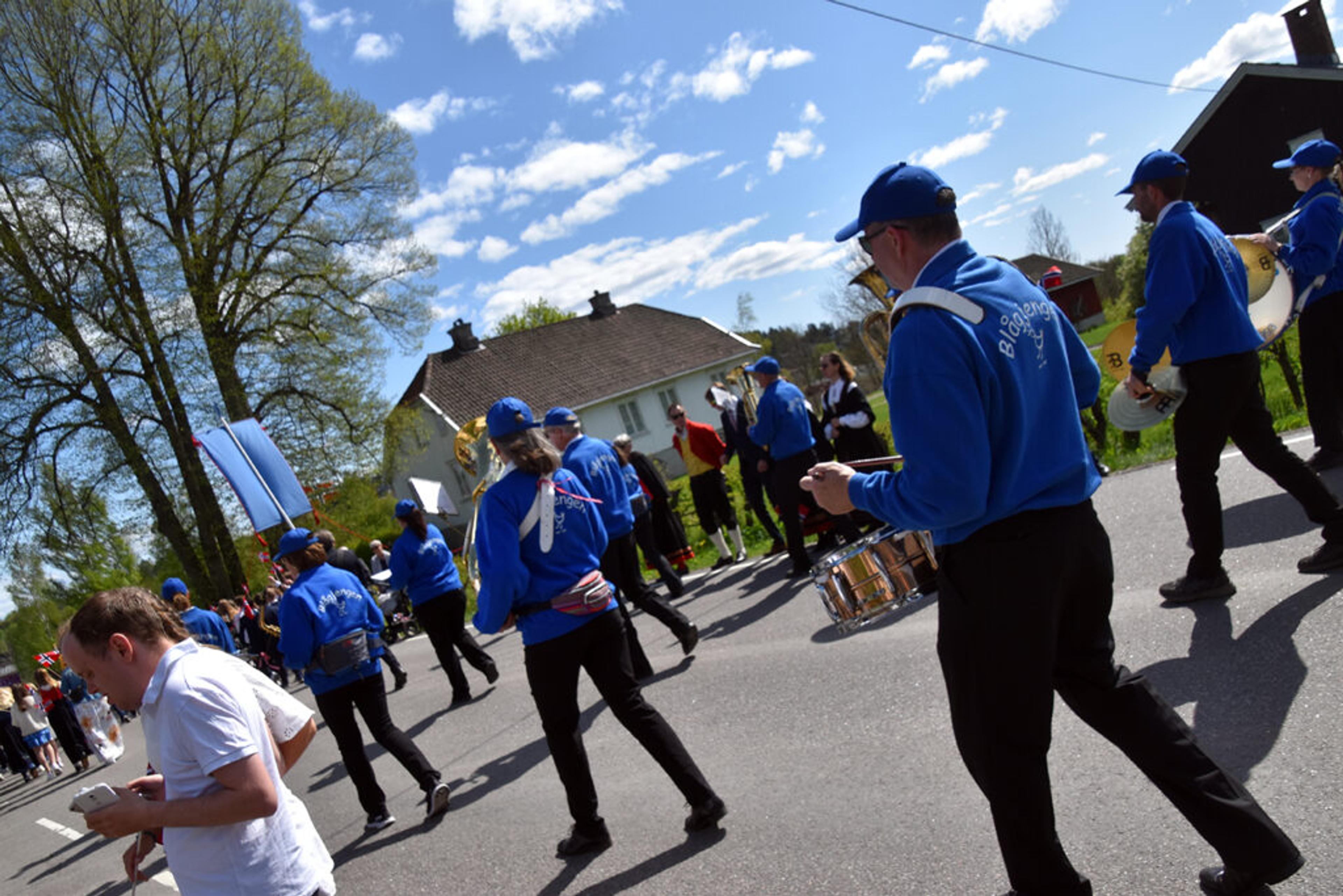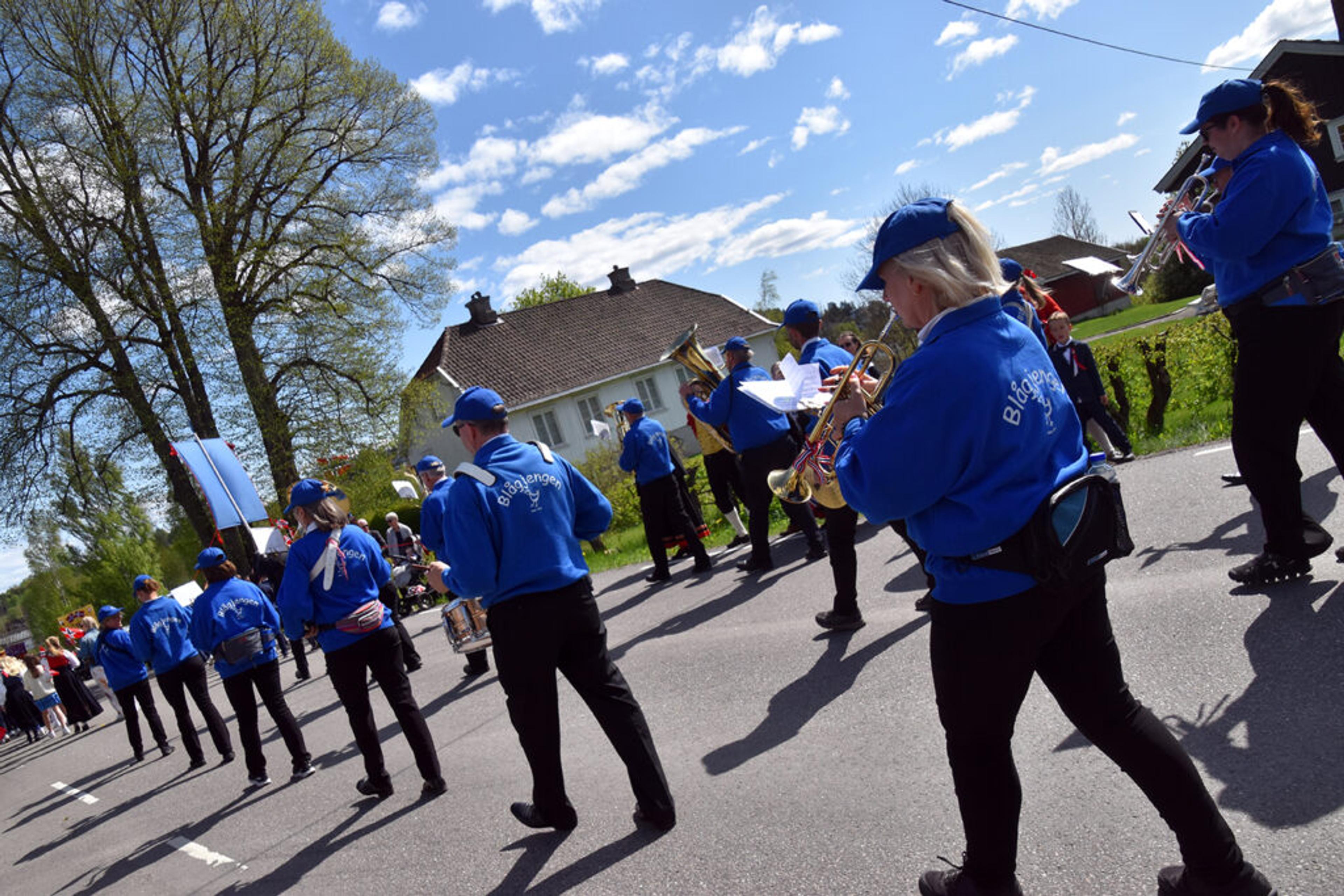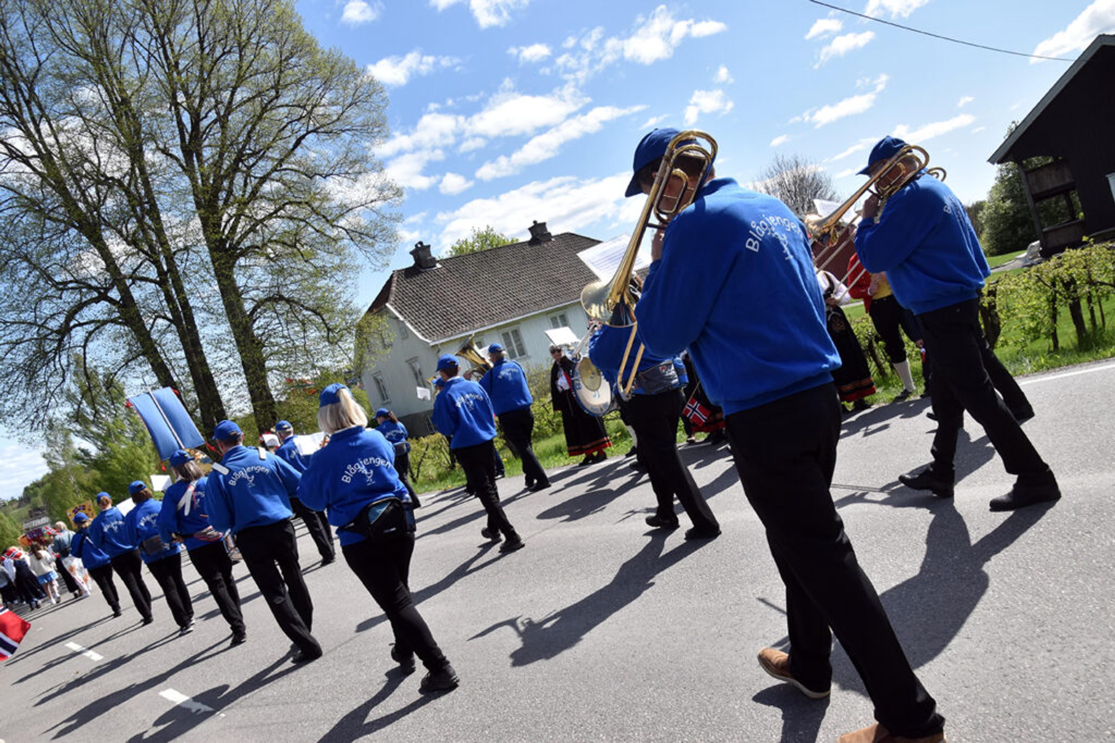 BLÅGJENGEN: Ett av to voksenkorps i bygda, og med to skolekorps i tillegg er det hele fire korps i 17. mai-toget her i Re. Foto: Stian Ormestad, ReAvisa.