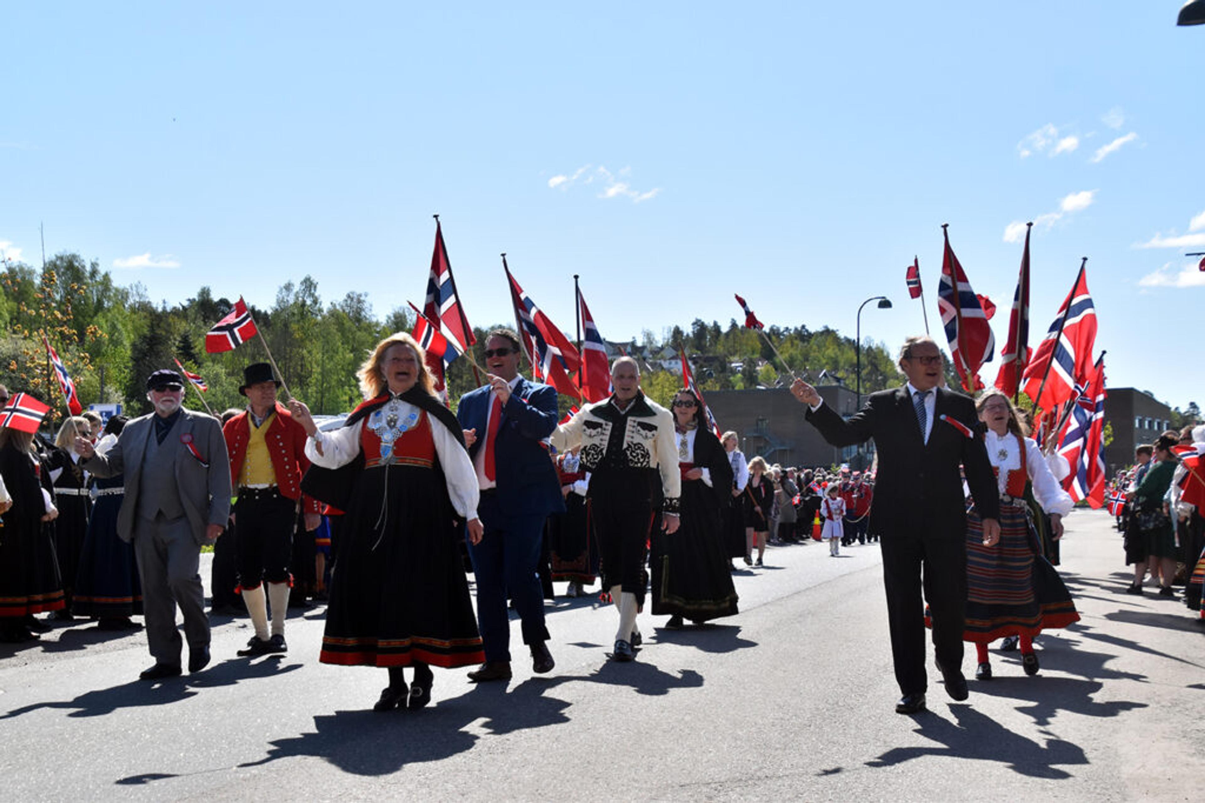 FOLKEVALGTE FØRST: Helt fremst i 17. mai-toget går de folkevalgte, og helt først ordfører Anne Rygh Pedersen. Foto: Stian Ormestad, ReAvisa.