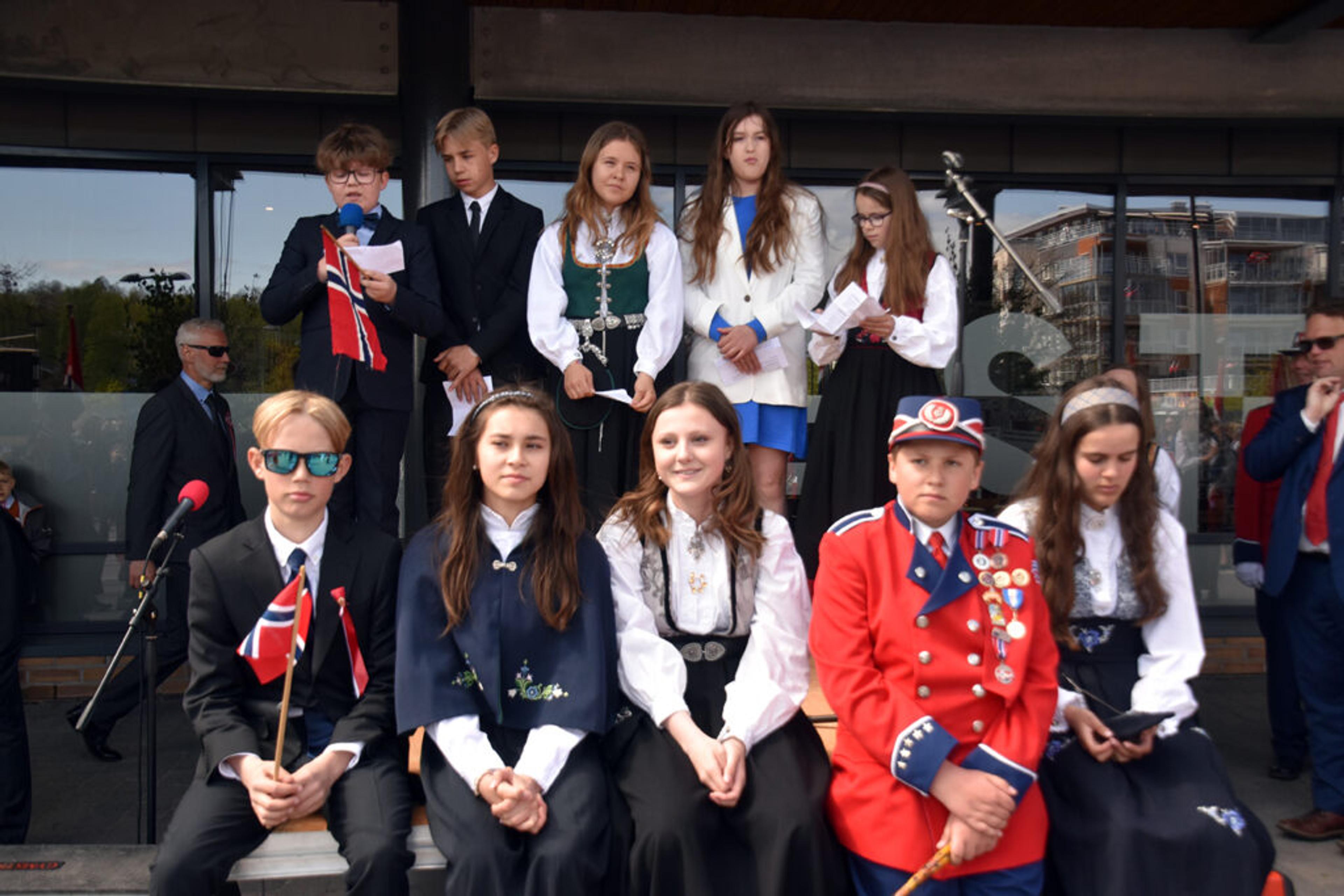 TALERE: Fra Solerød skole Matilde Aurora Sande-Larsen og vara Jamila Bougicha, fra Bjerkely skole Jørgen Marinius Silseth og vara Martin Kaasa, fra Ramnes skole William Fagerheim Bjørang og vara Aron Leander Grønvold, fra Røråstoppen skole Ingrid Bøe Røste og vara Theodor Eia Linnestad, fra Kirkevoll skole Evestina Baceviciute og vara Mathea Victoria Gjøstøl Solberg. Foto: Stian Ormestad, ReAvisa.