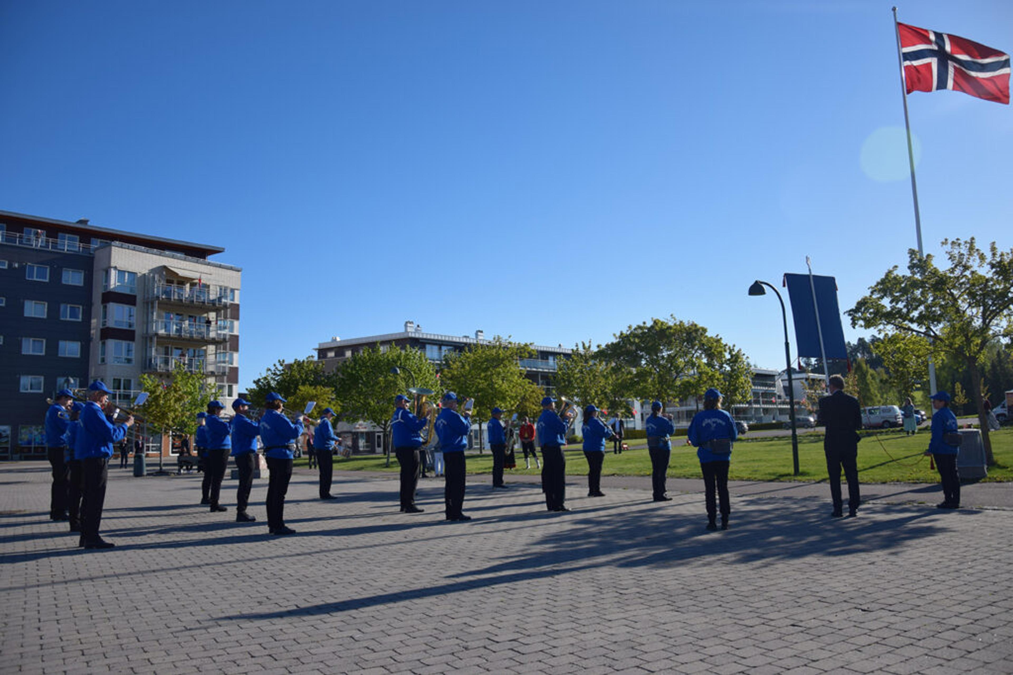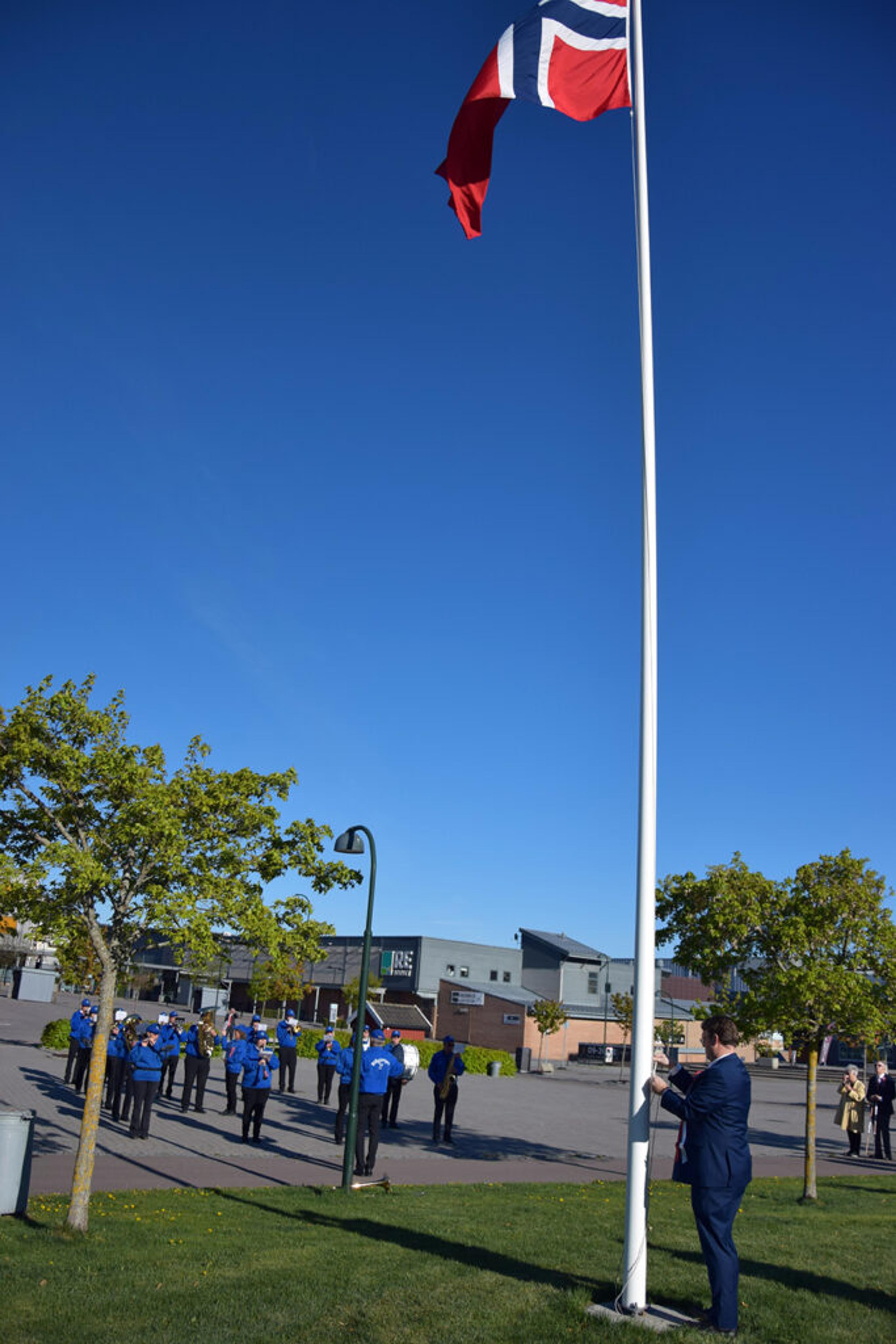 FLAGGHEIS: Blågengen spiller mens flagget heises i Revetalparken. Foto: Håkon Westby.