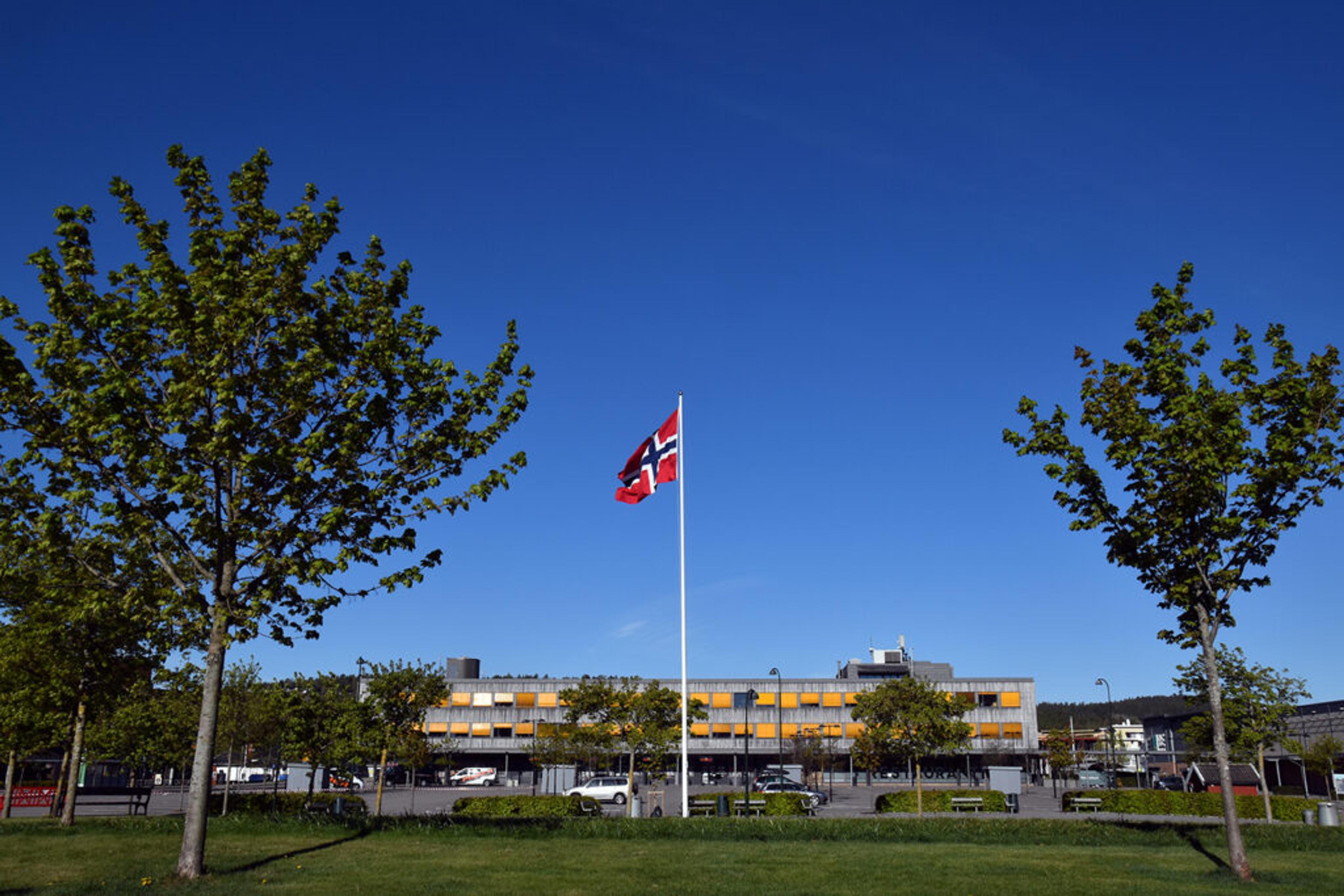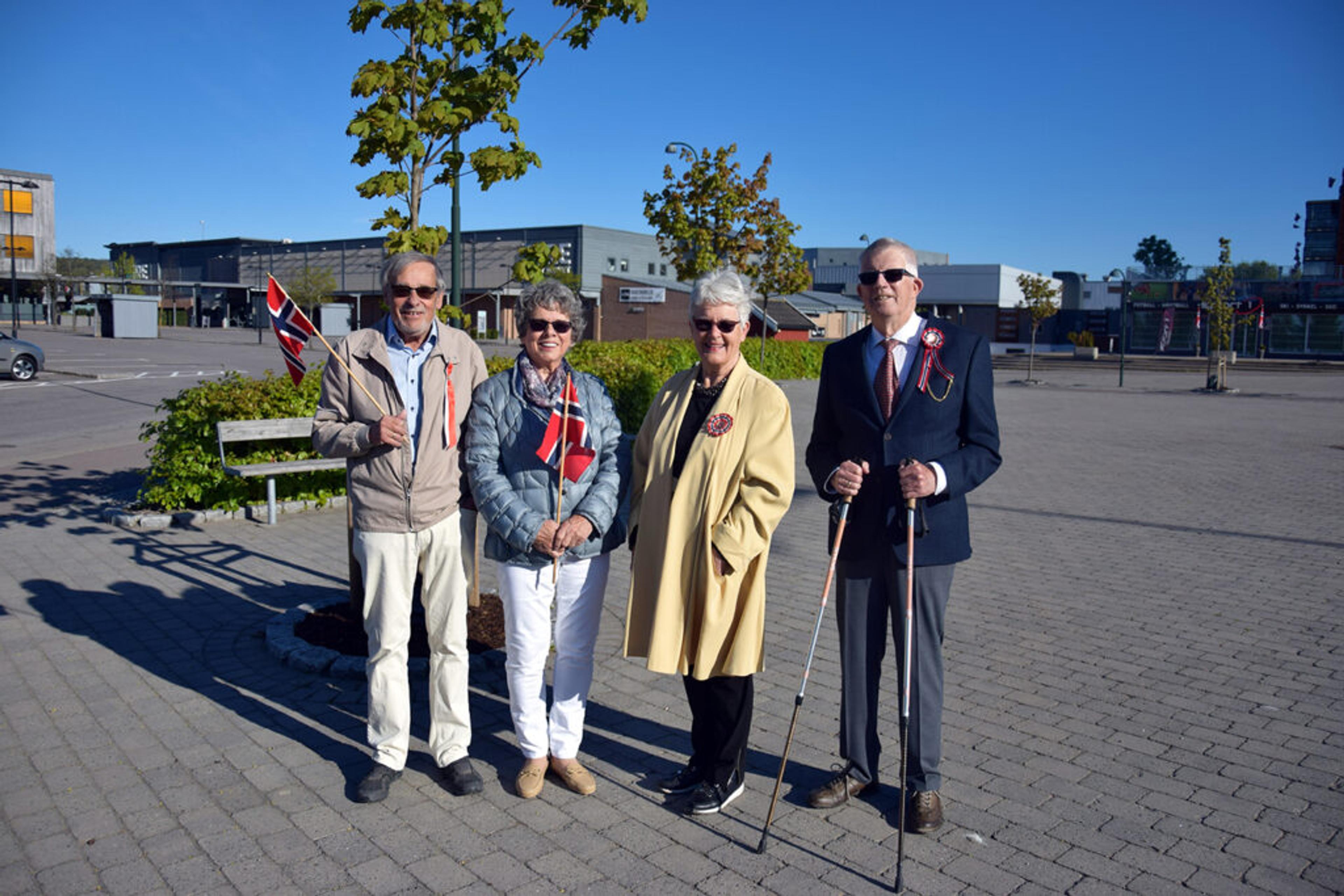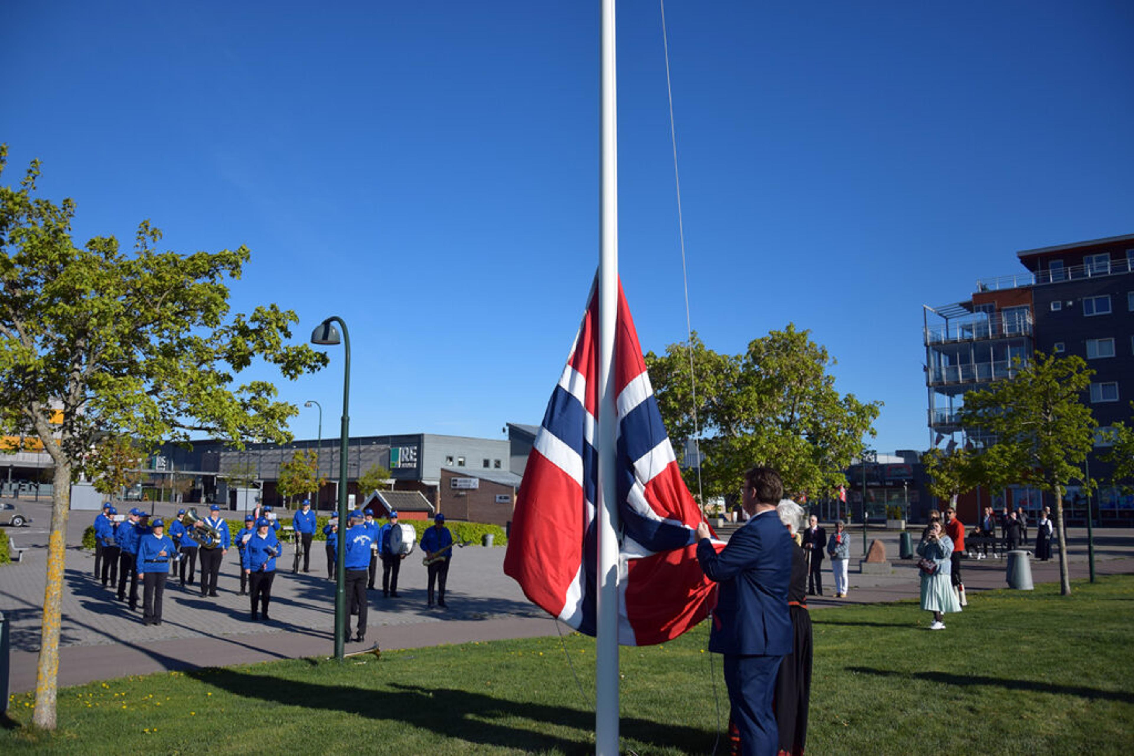 FLAGGHEIS: Lars Jørgen Ormestad, assistert av Kirsten Ormestad, sto for flaggheising i Revetalparken. Foto: Håkon Westby.