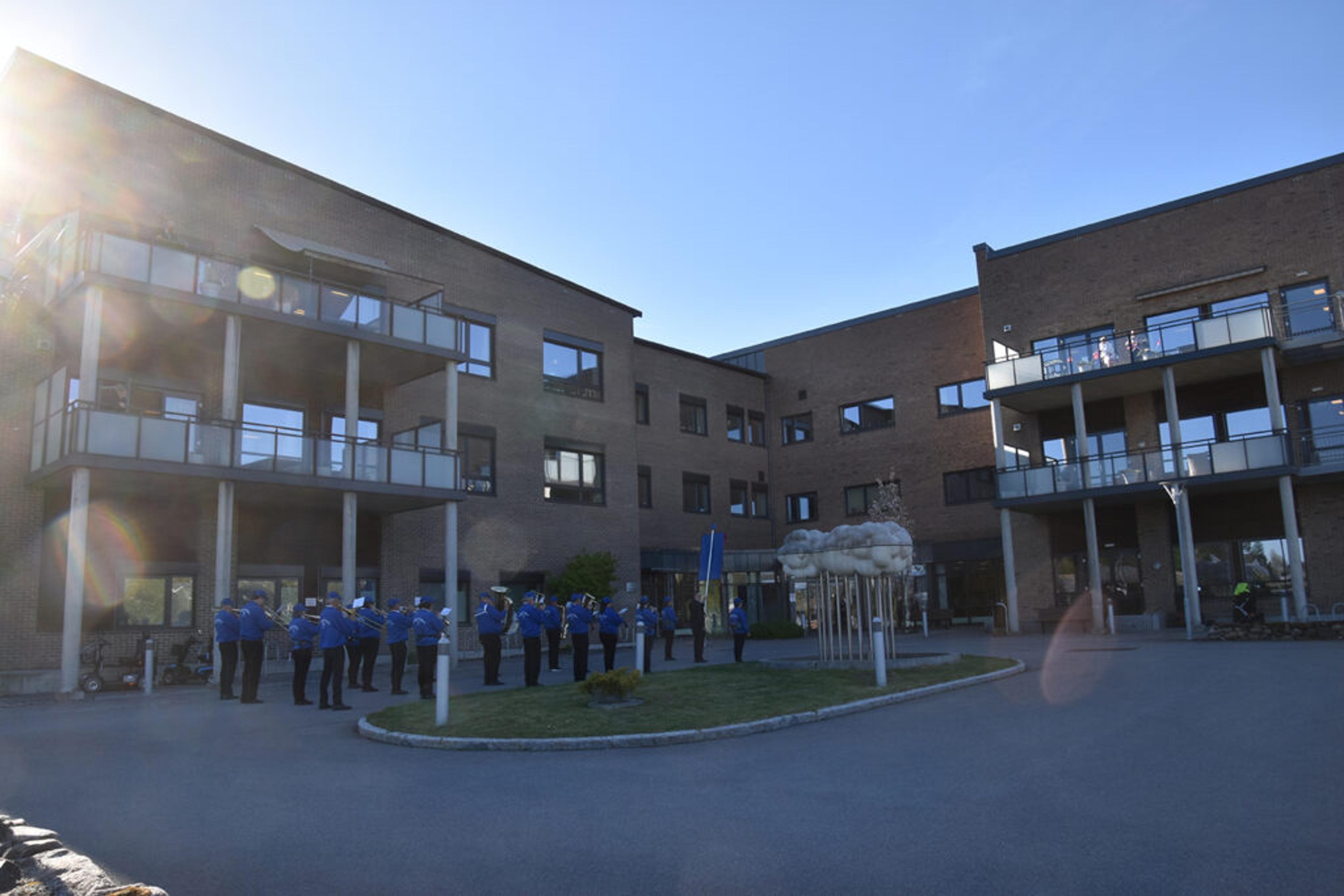 NORGE I RØDT, HVITT OG BLÅTT: Alltid fint å se gleden på balkongene av å få Blågjengen på besøk på 17. mai-morgen på Re helsehus. Foto: Stian Ormestad.