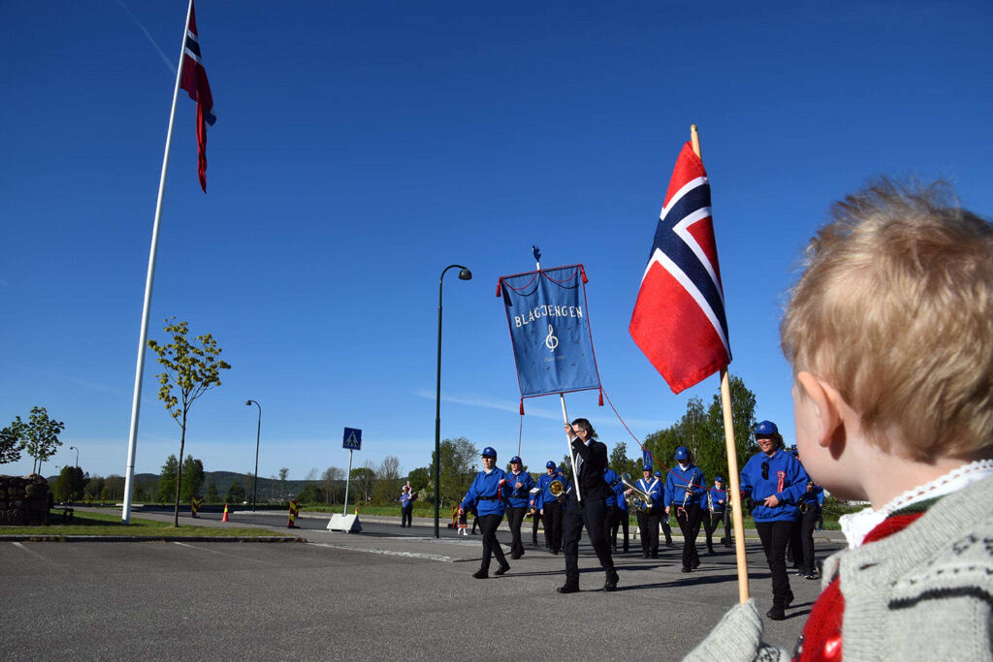 HIPP HURRA! Blågjengen tok seg en god runde på Revetal etter flaggheising i Revetalparken og konsert utafor Re helsehus. Foto: Stian Ormestad.