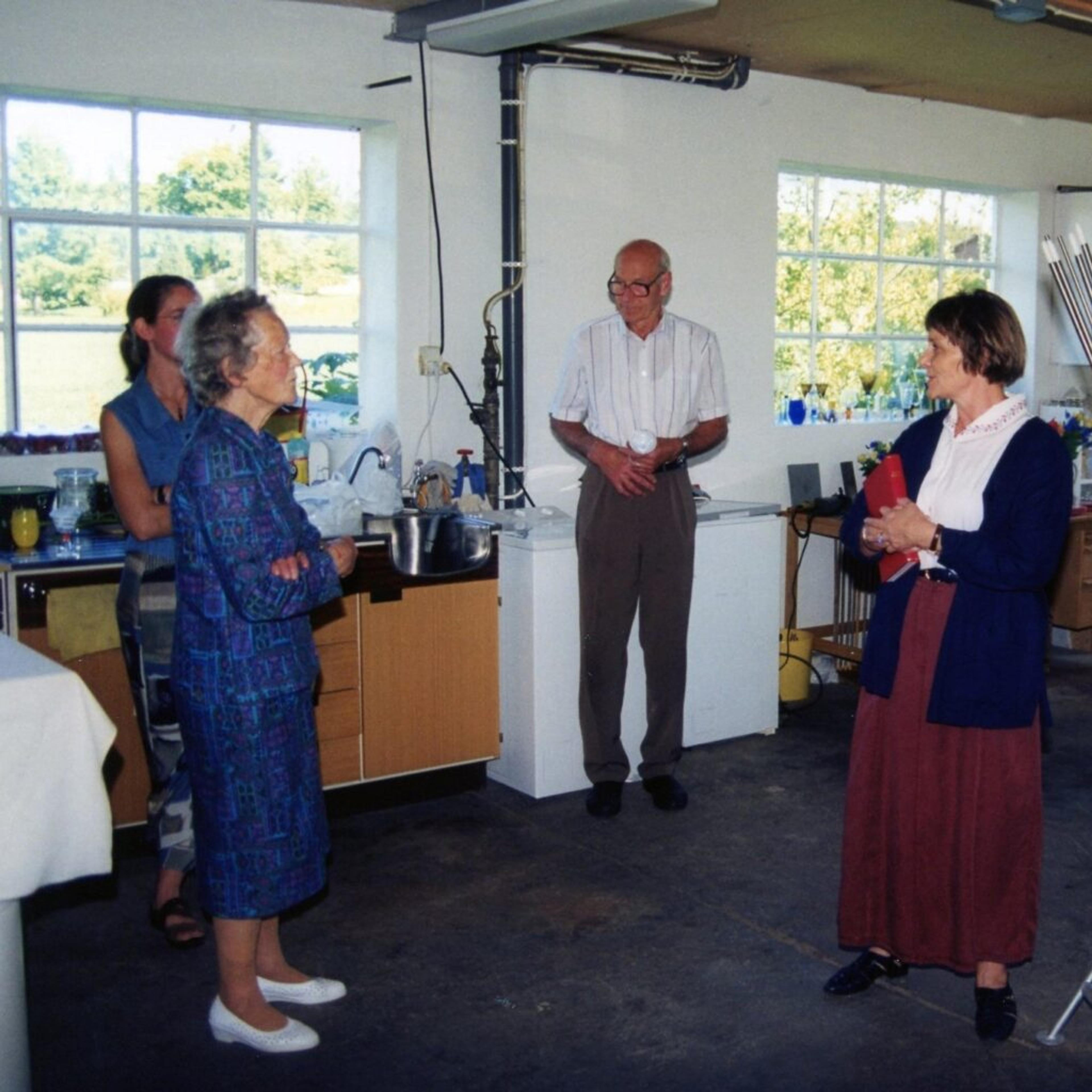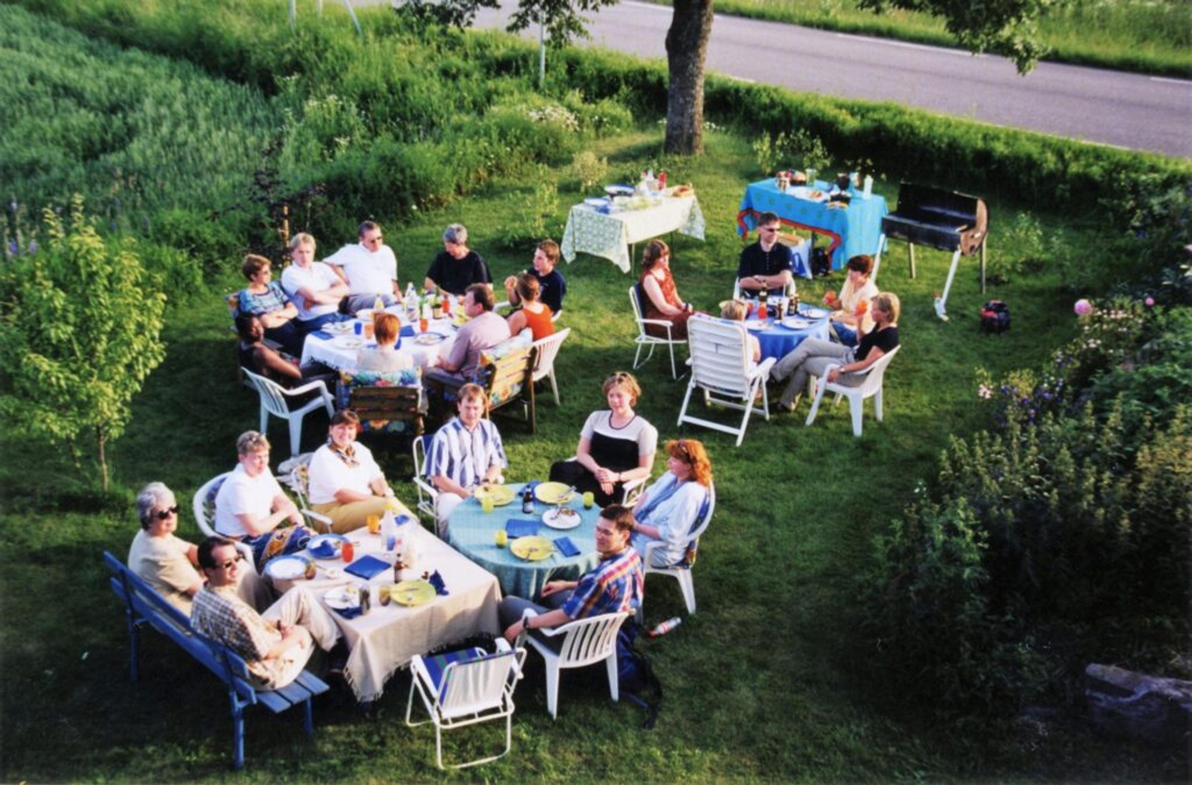 HAGEFEST: Den offisielle åpningsdagen ble til slutt feira med en liten hagefest for venner og kolleger i glassblåserfaget. Foto: Privat.