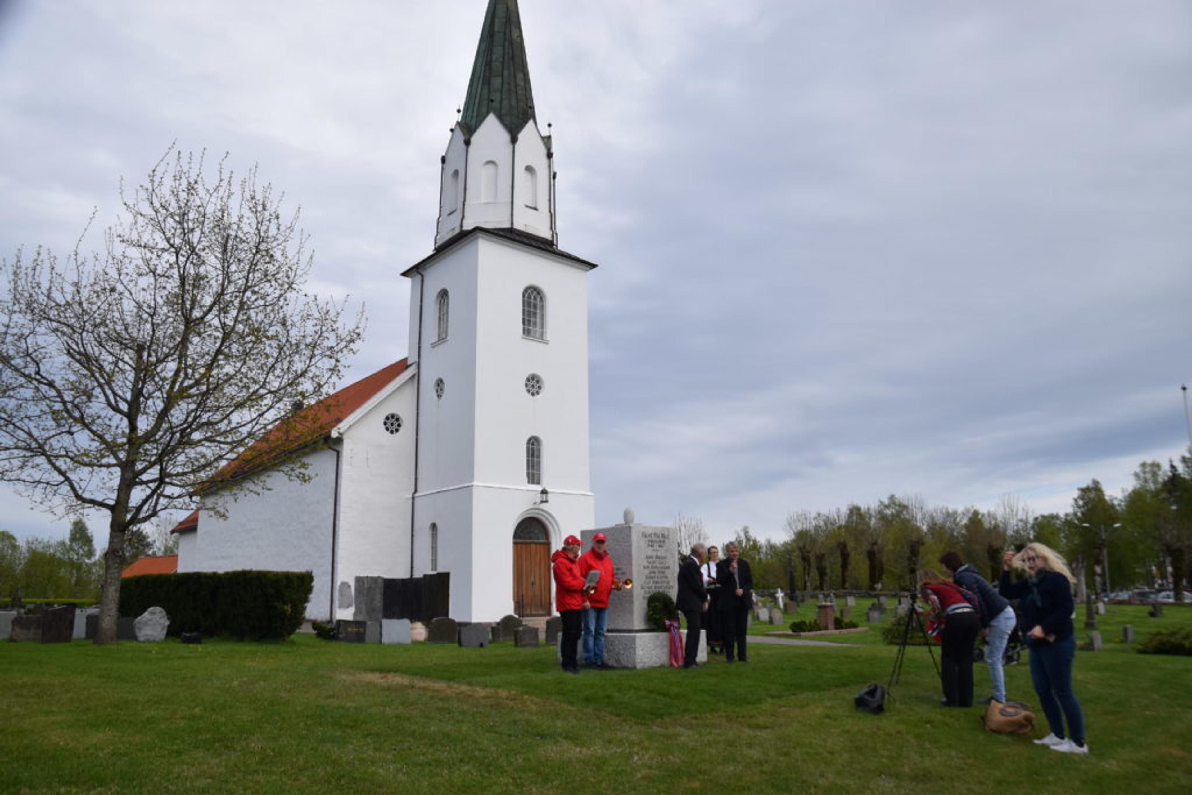 VÅLE KIRKE: En av tre middelalderkirker i Re. Her i forkant av fjorårets 17. mai-feiring, med kransenedleggelse ved bautaen. Foto: Stian Ormestad.