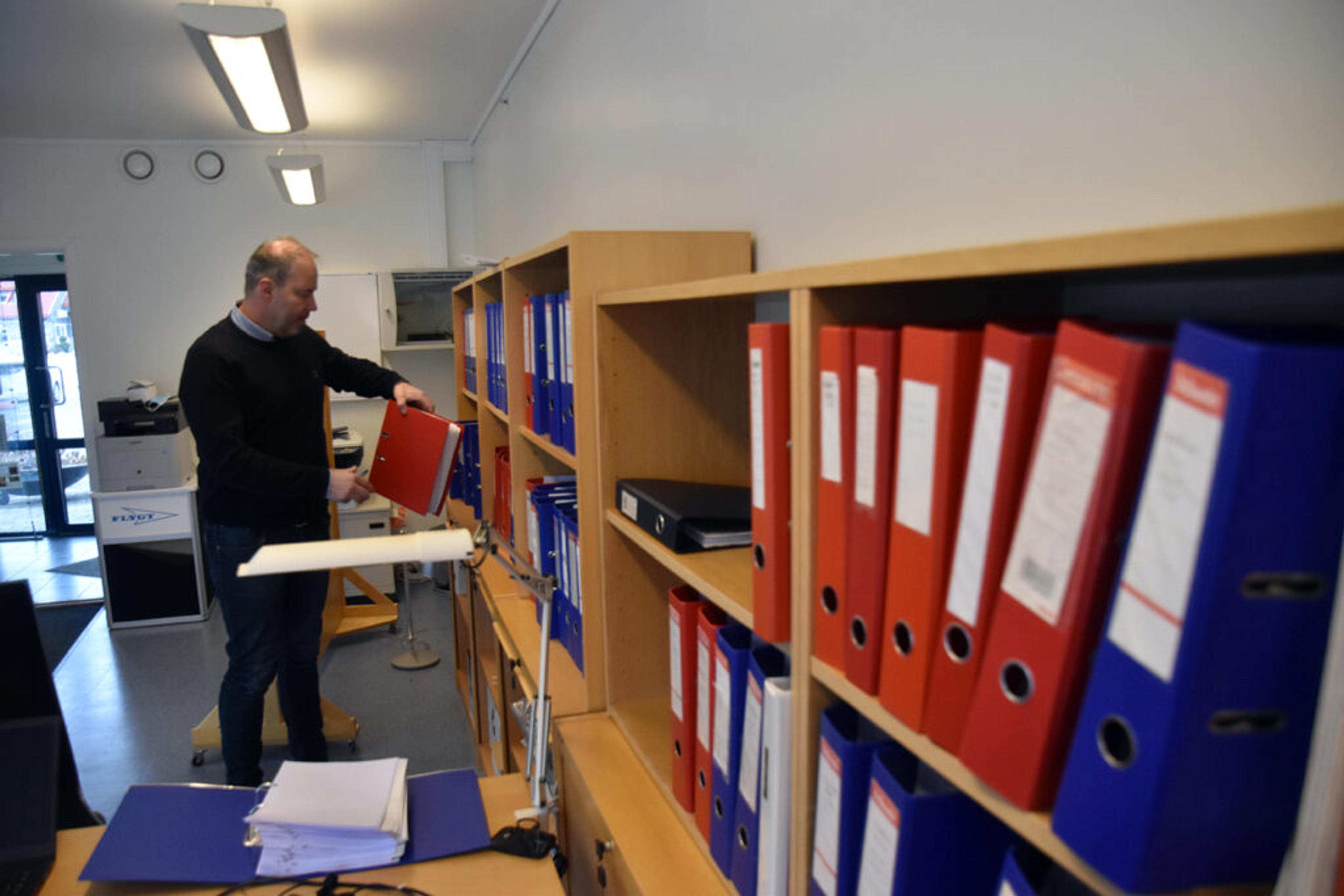 ALT ER ARKIVERT: Hver eneste gjødselport er laga på mål, og alle har sin lille bunke med papirer – Geir finner tilbake til alle spesifikasjoner for alt som er blitt produsert opp gjennom åra. Foto: Stian Ormestad, ReAvisa.