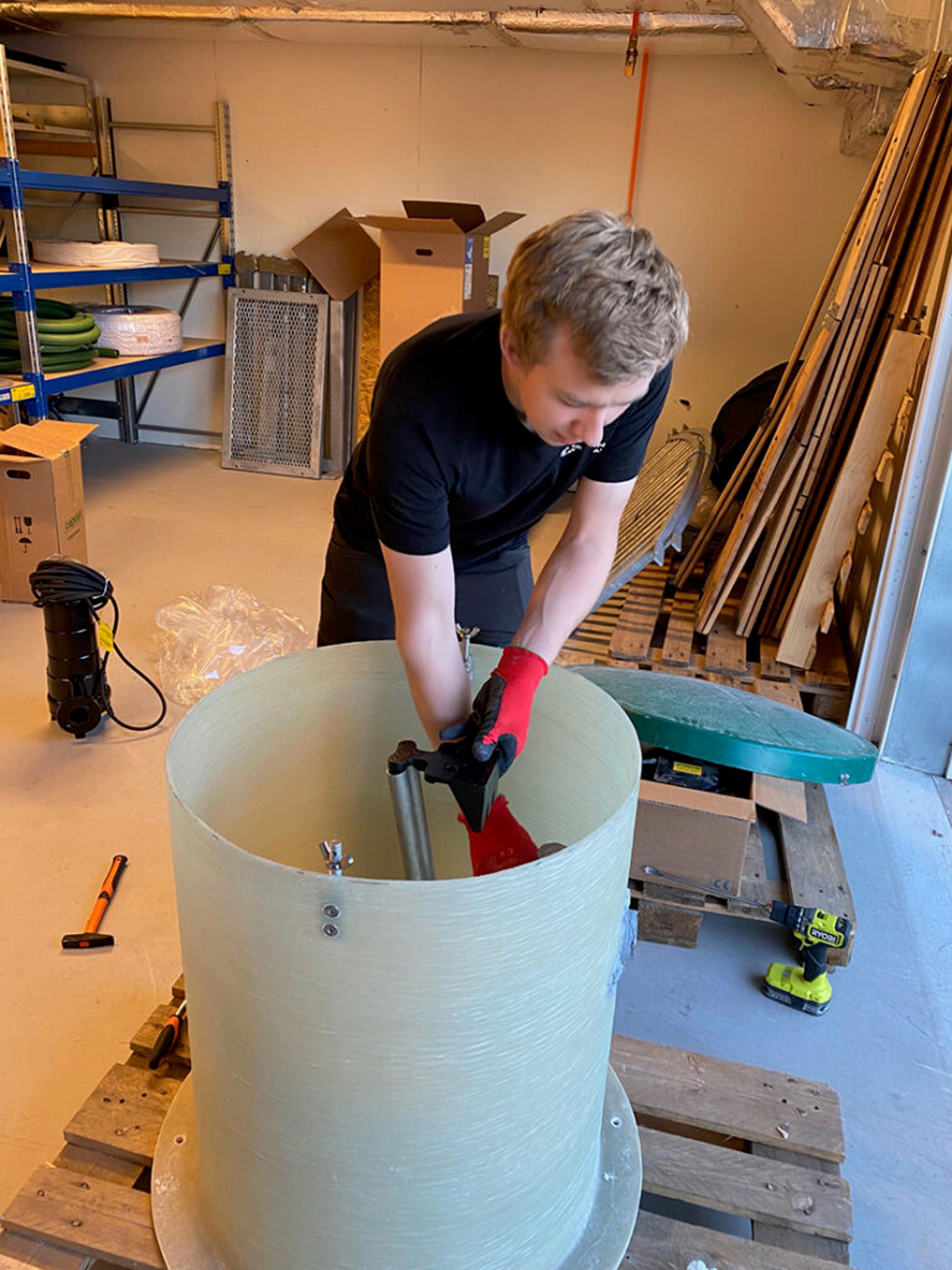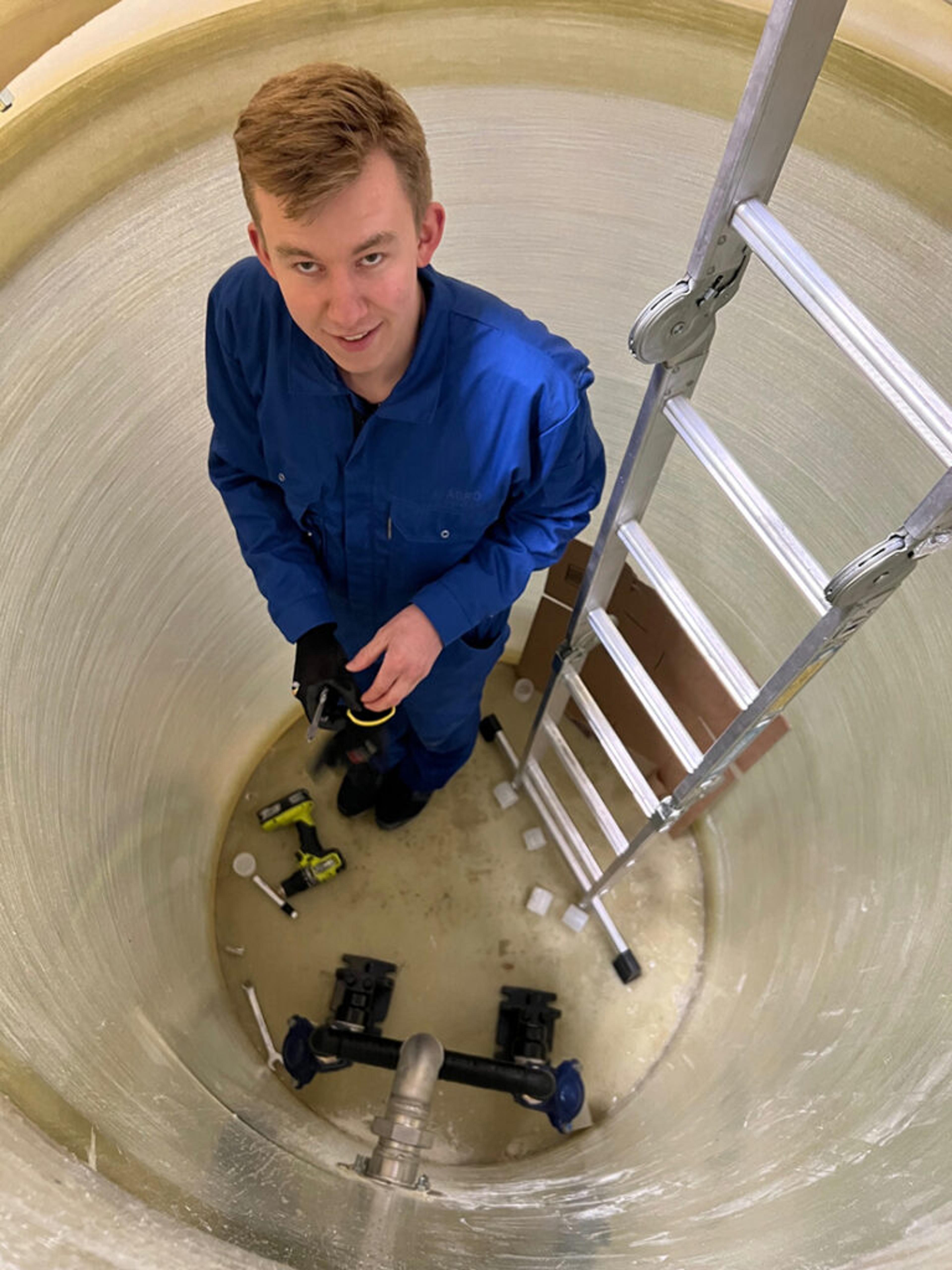 NØYE: Hermann Melvold (22) gjør en grundig og god jobb, så alt er på stell når pumpene skal gjøre en viktig jobb. Foto: Privat.