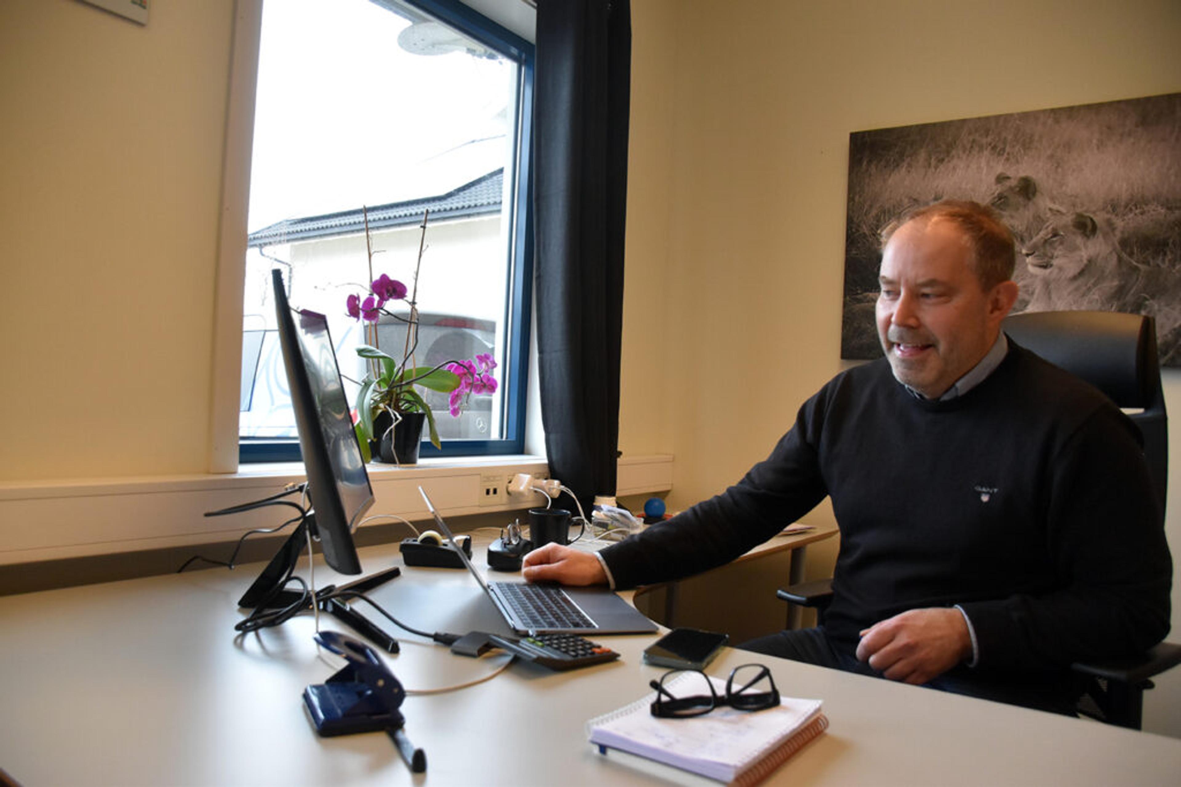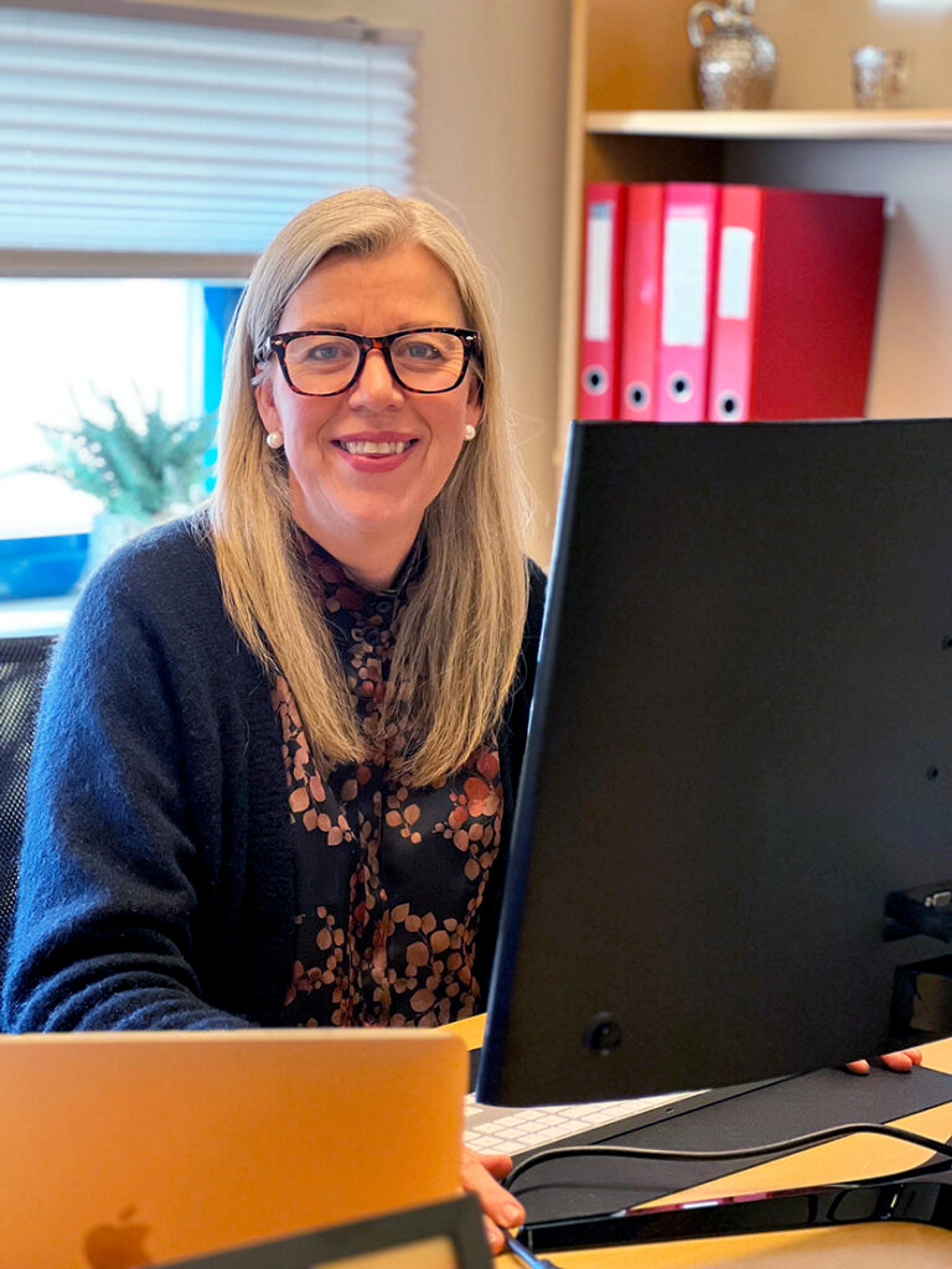 PÅ KONTOR: Ellen Melvold (52) hjelper til på kontoret på Revetal, lengst nord langs Bispeveien. Foto: Privat.