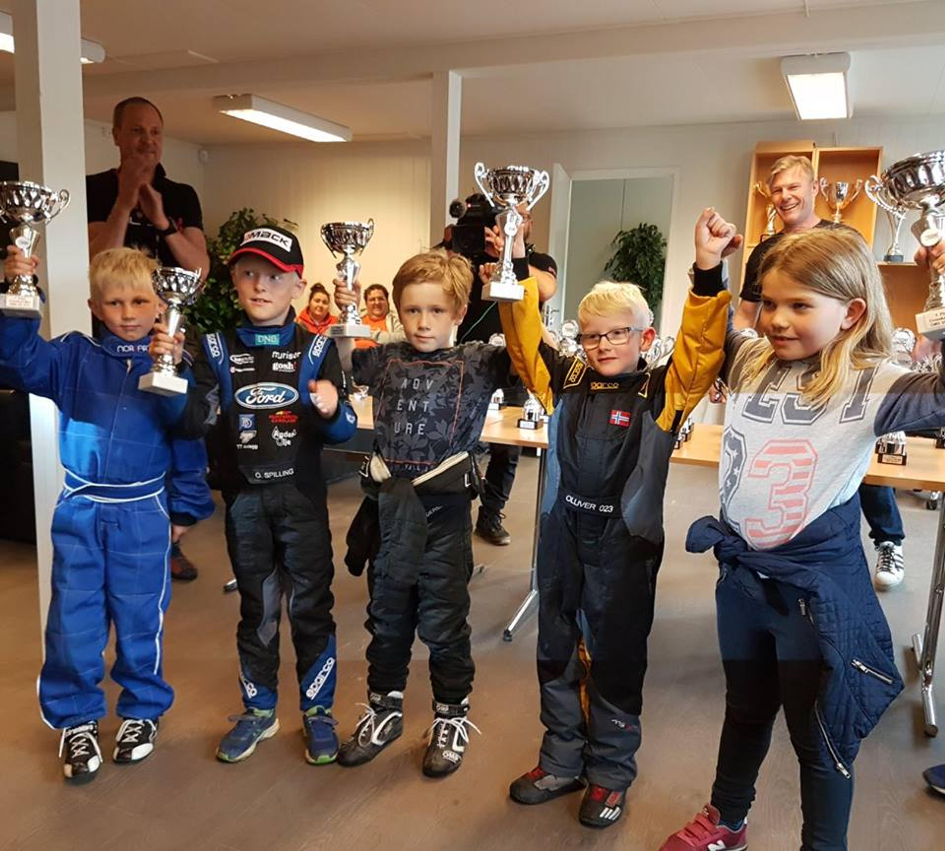 POKAL: Lauritz Heum (7) i midten – med pokal for 3. plassen og deltakerbevis fra sitt andre løp. Foto: NBF Bilsport.