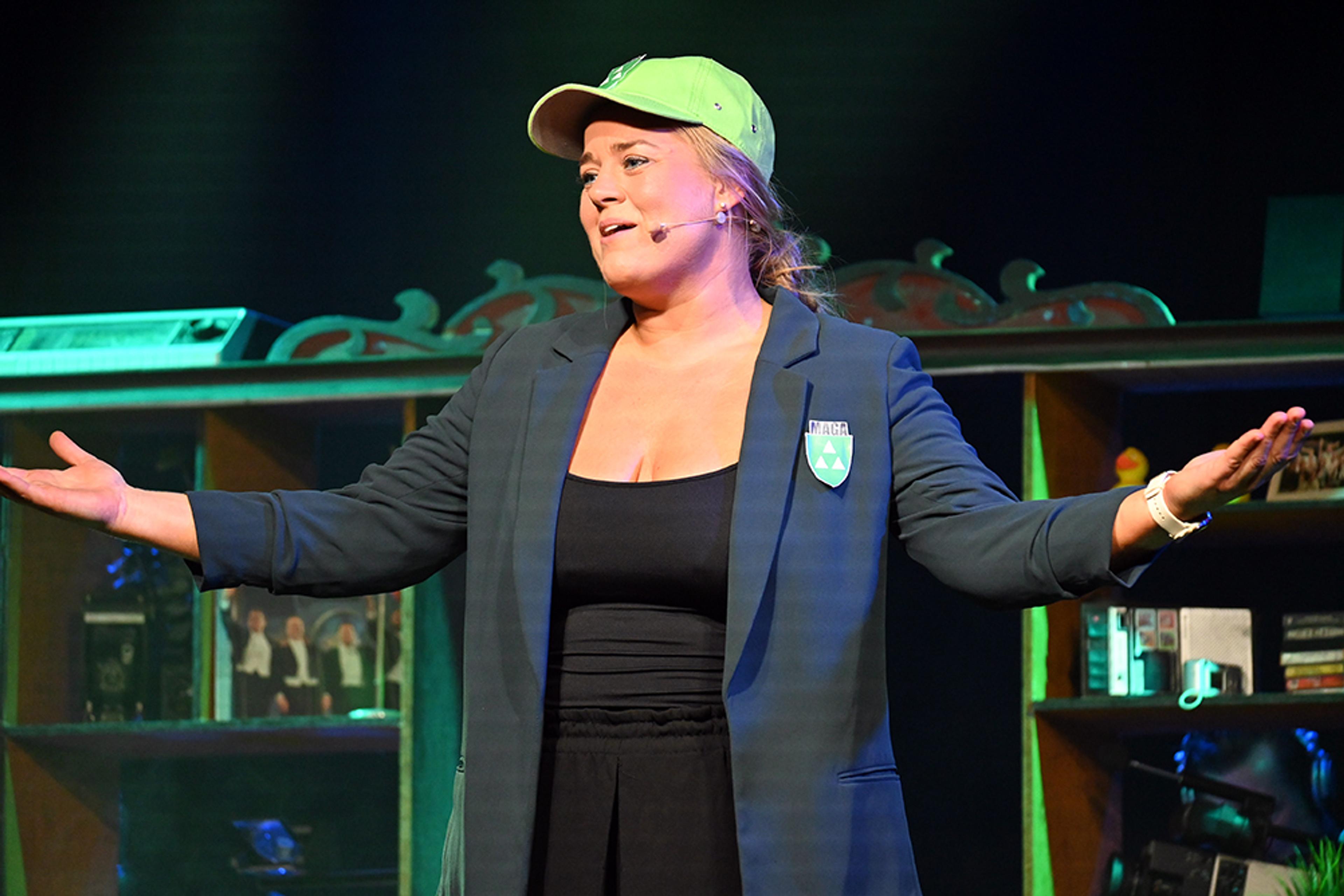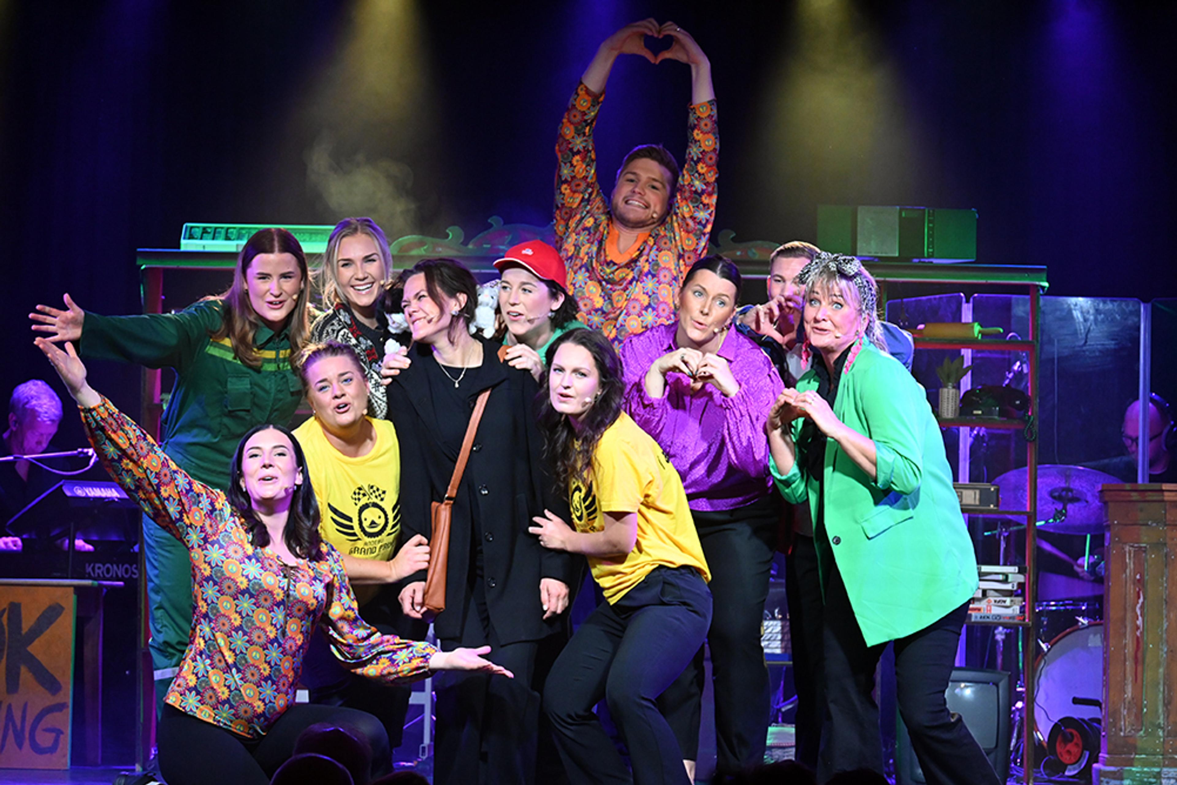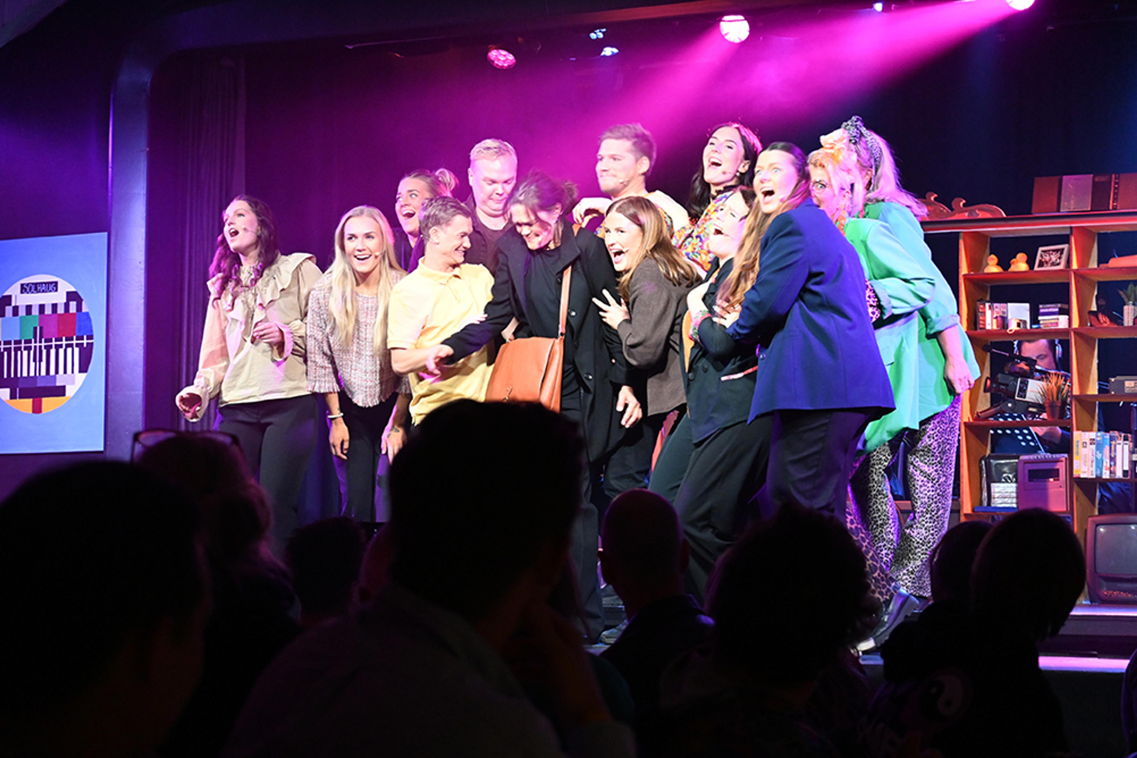 Og Ingeborg Haugan har ei venninne fra Fon. Dessuten, hele inngangspartiet er tapetsert med gamle utgaver av ReAvisa, som en del av et supert gjennomført «media-tema» i revylokalene.
