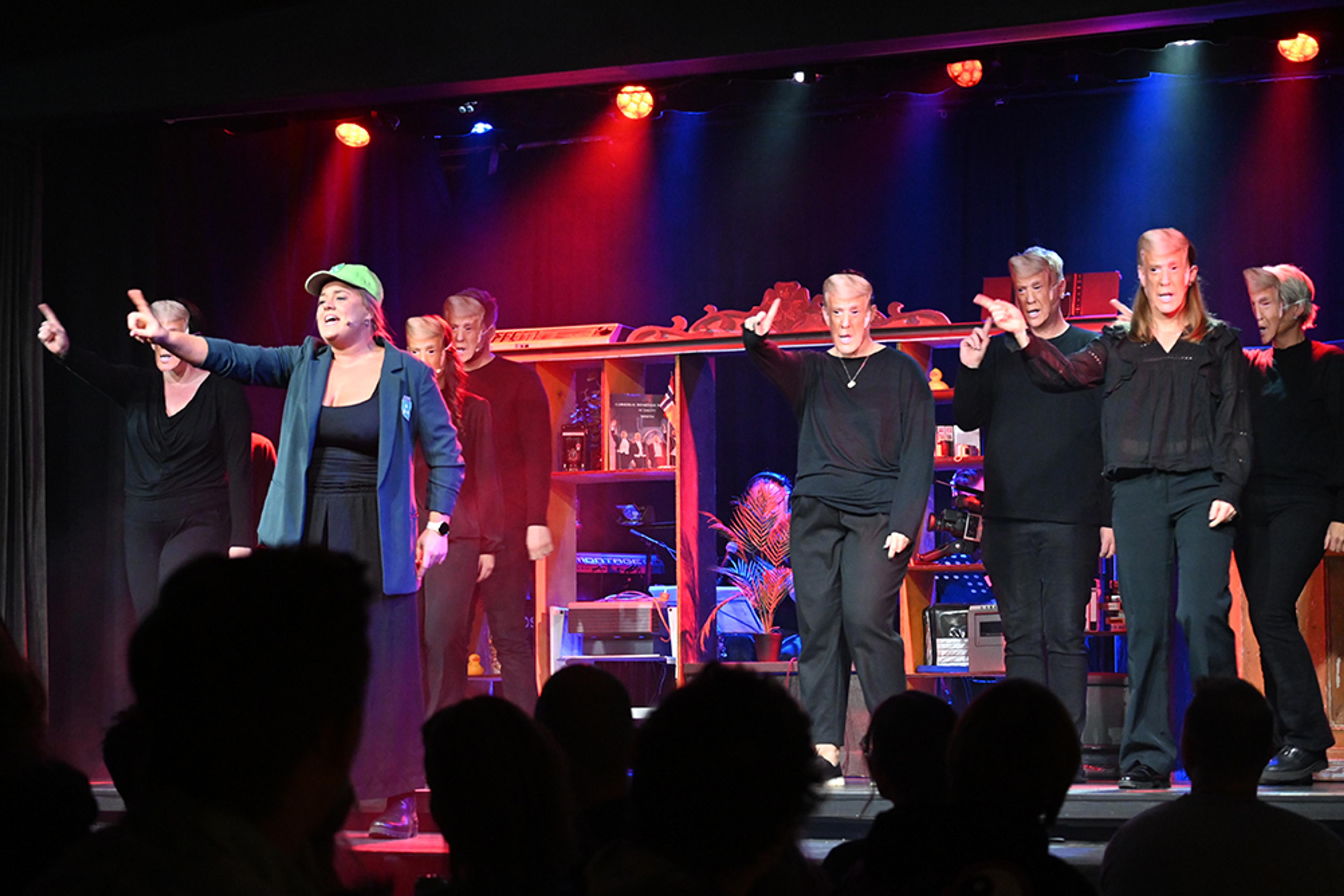 Vi får et gjensyn med Karen Marie Haraldsen, som tidligere har vært med på julebordshowene på Revetal. Hun får med seg et helt kor med Donald Trump-er på strofa «Make Andebu greit again».