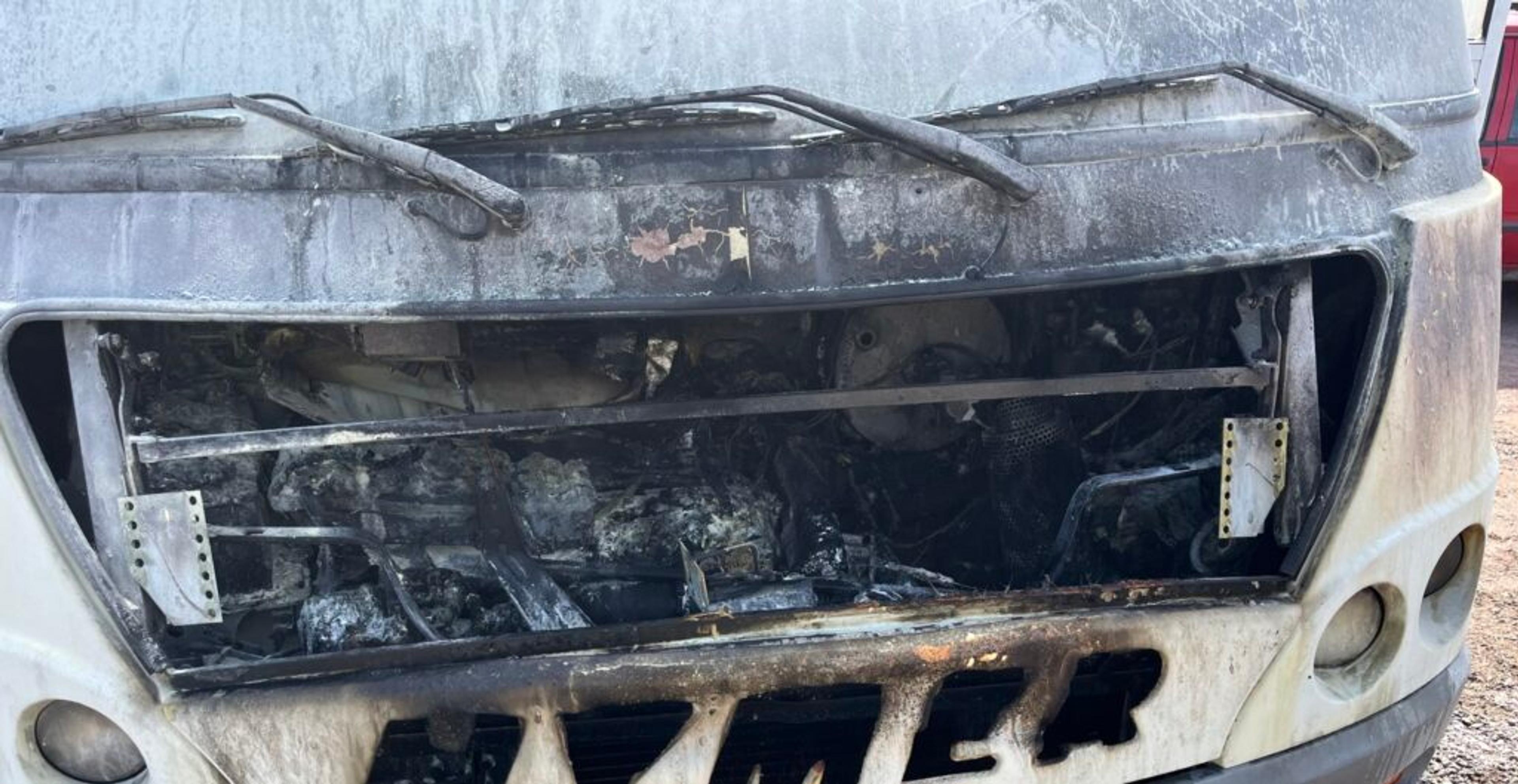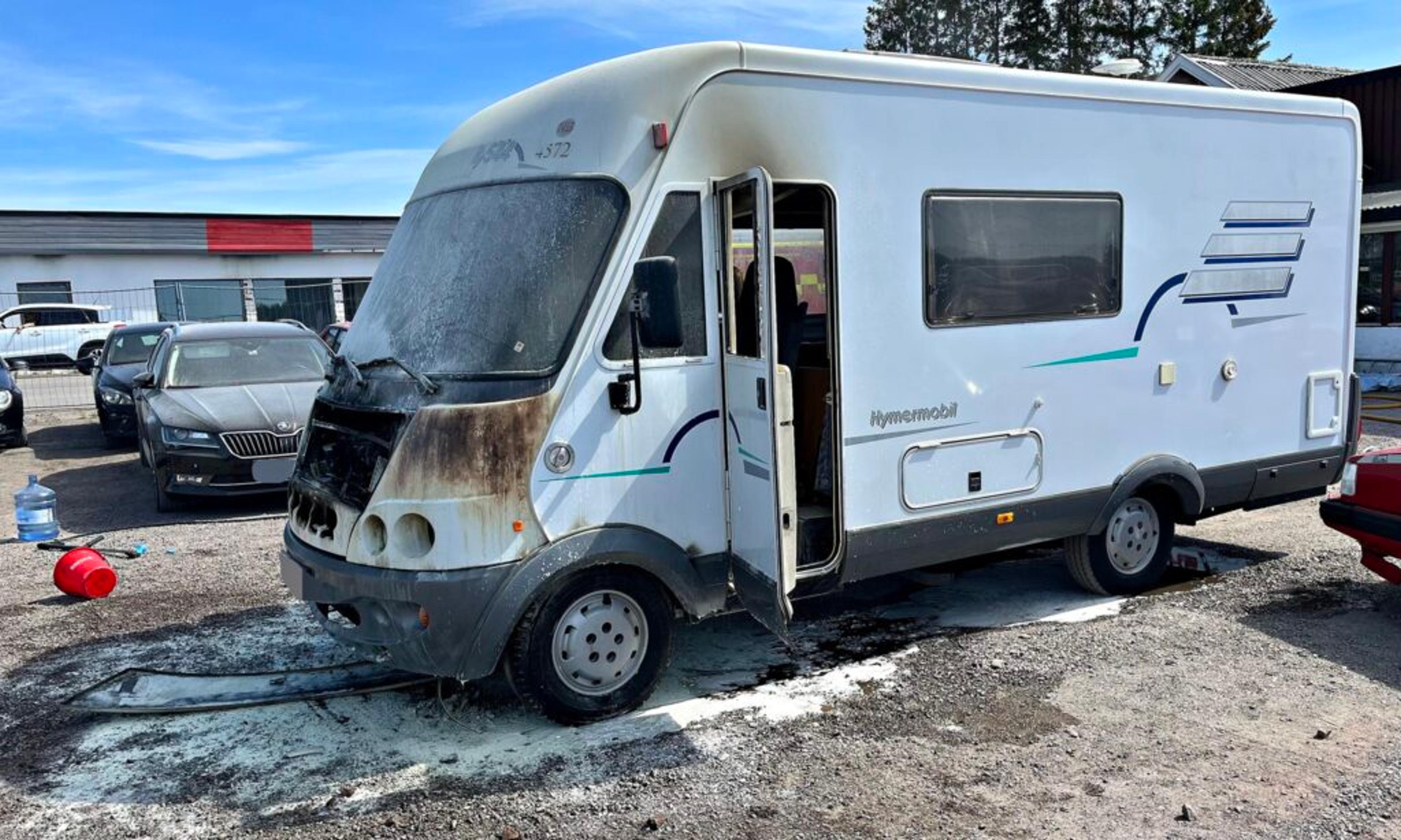STORE SKADER: Bobilen er prega av brannen som ser ut til å ha starta i motorrommet. Politiet forteller at det neppe er noen alvorlige personskader. Foto: VIB.