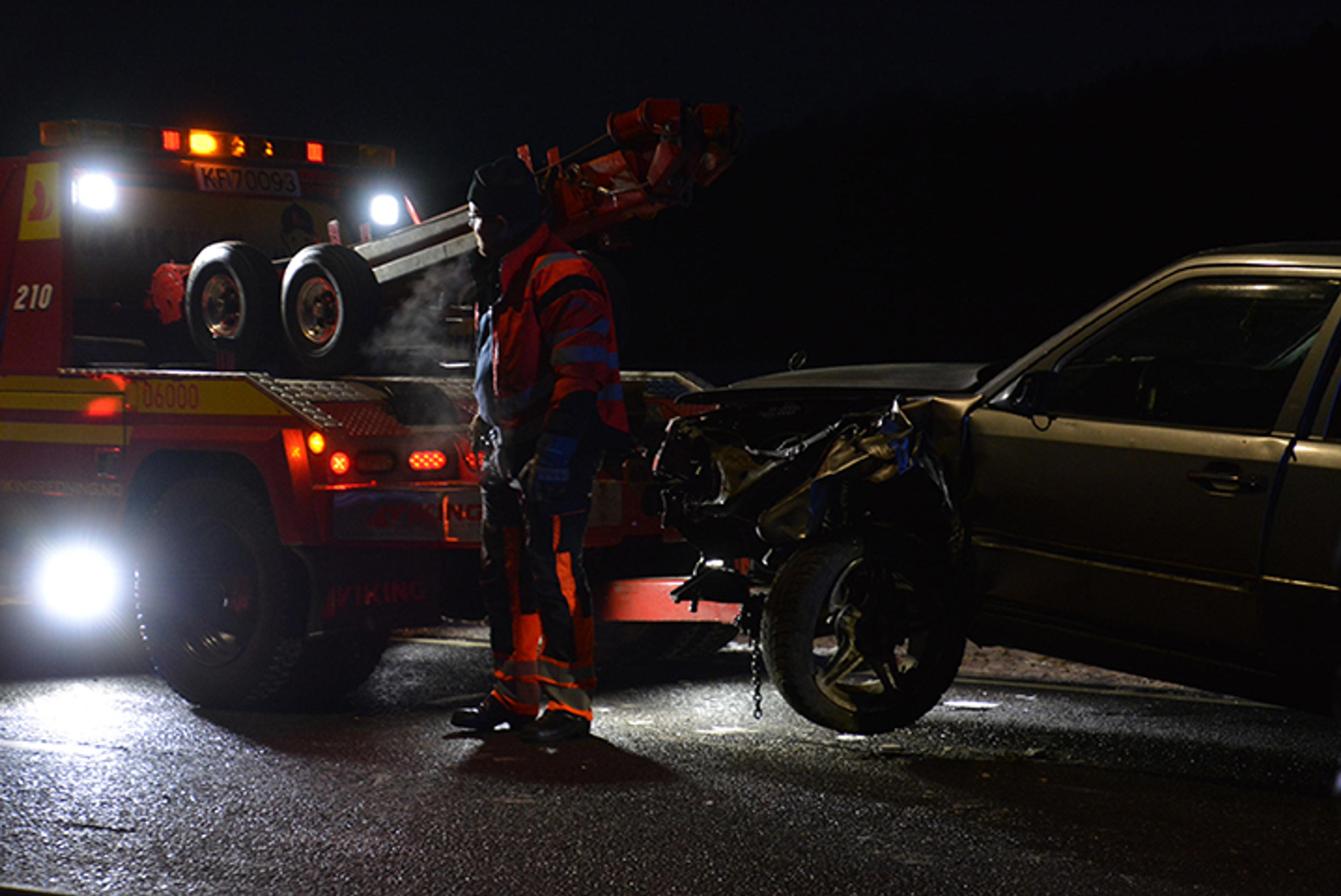 BERGNING: Tre biler var involvert i ulykken mandag kveld. To av de tre bilene måtte berges, og her berges den ene, med store materielle skader i fronten. Foto: Stian Ormestad.