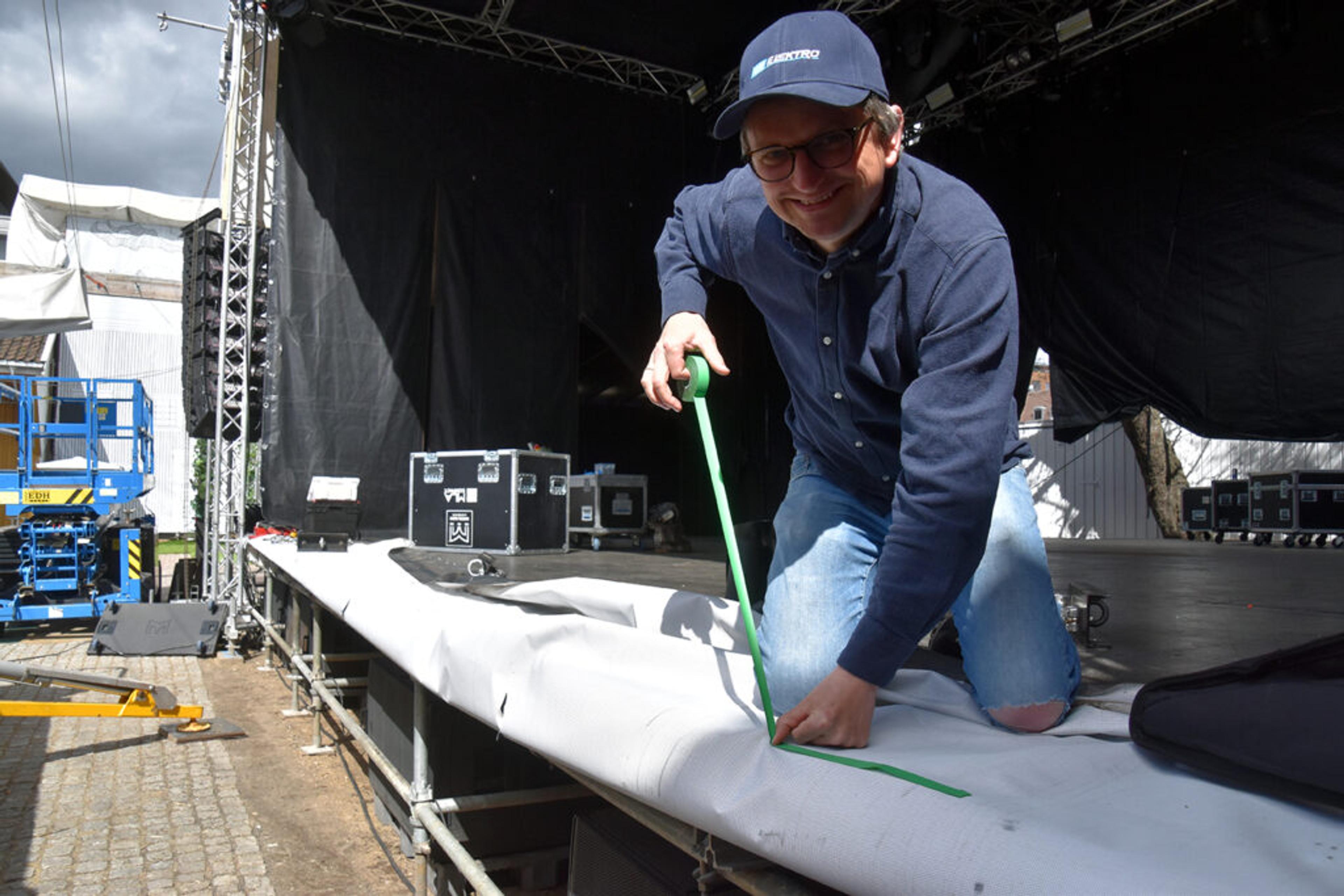 SISTE INNSPURT: PR-sjef Thomas Stange legger siste tapestripe på verket. Lørdag blir det stinn brakke. Foto: Stian Ormestad, ReAvisa.