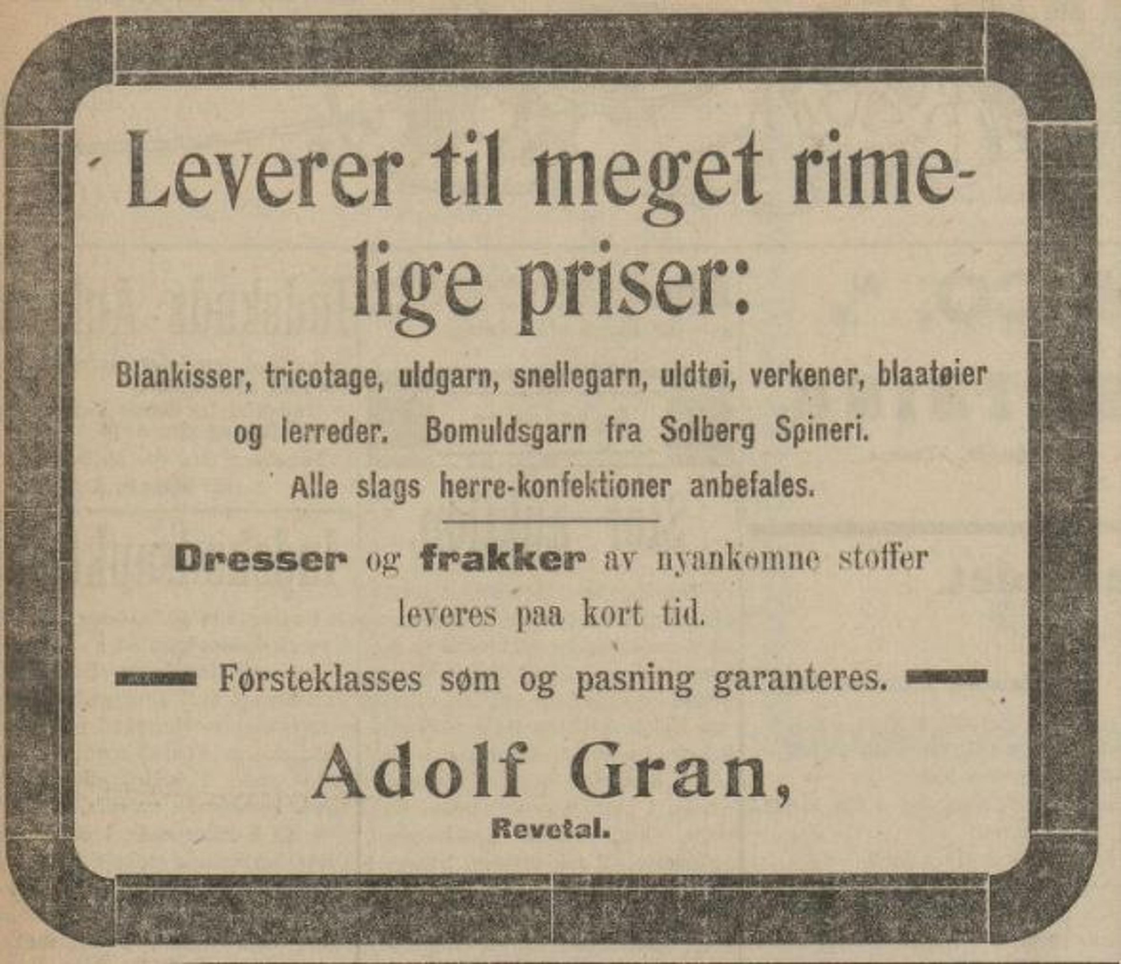 Adolf Gran kom til Revetal i 1910, og kjøpte Borgestad. Borgestad ligger ned mot elva, det sørligste av de to husa der. På Borgestad var det landhandel, allerede i folketellingen i 1900 finner vi Magnus Borge som huseier og landhandler.