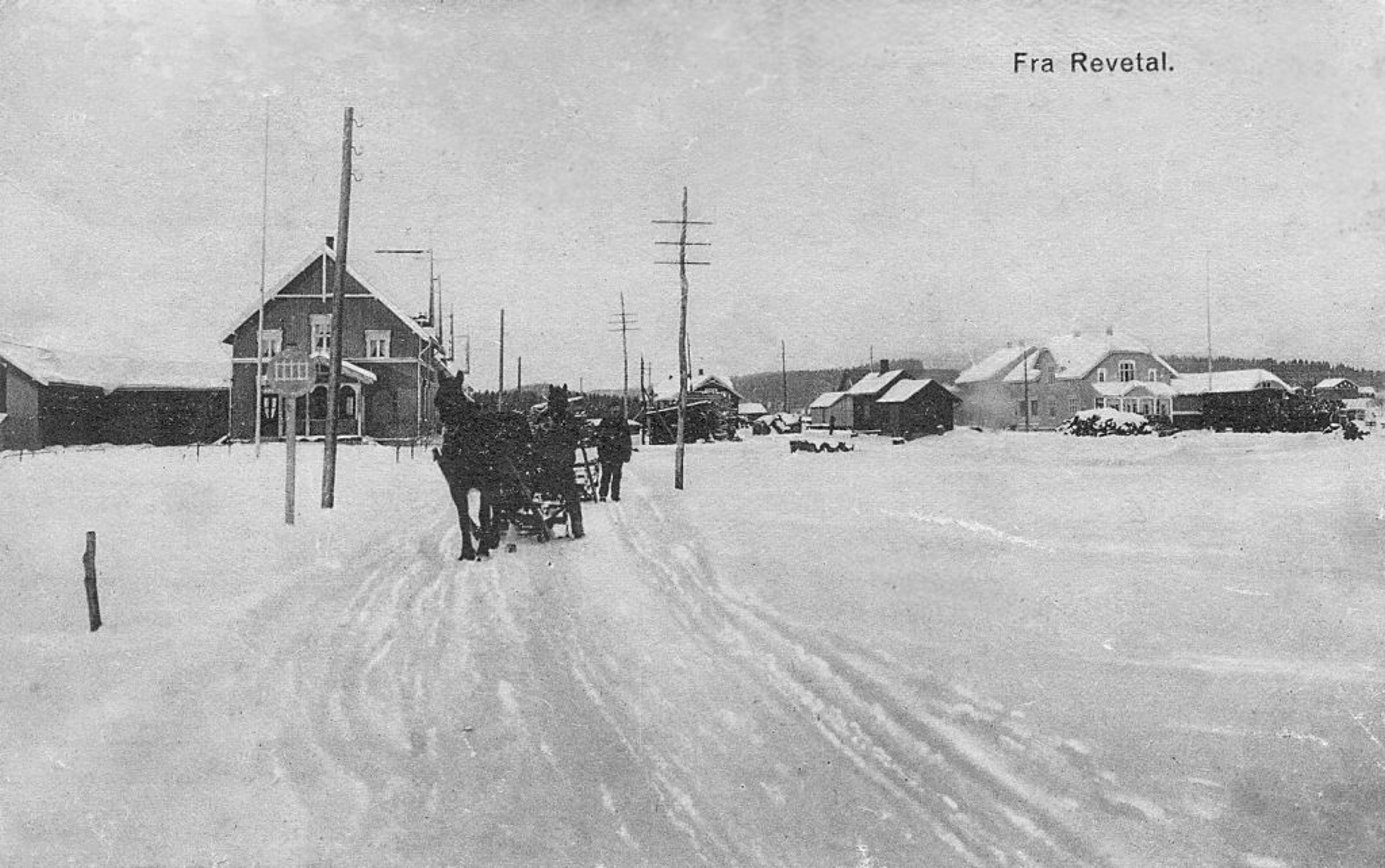 REVETAL FOR OVER 100 ÅR SIDEN: Her er vi i Gamleveien rundt 1915. Den gangen var det hovedveien gjennom Revetal. Til høyre i bildet ser vi Revetal stasjon. Helt til høyre Adolf Grans nye forretning og bolig, som sto ferdig i 1914. Foto: Ukjent.