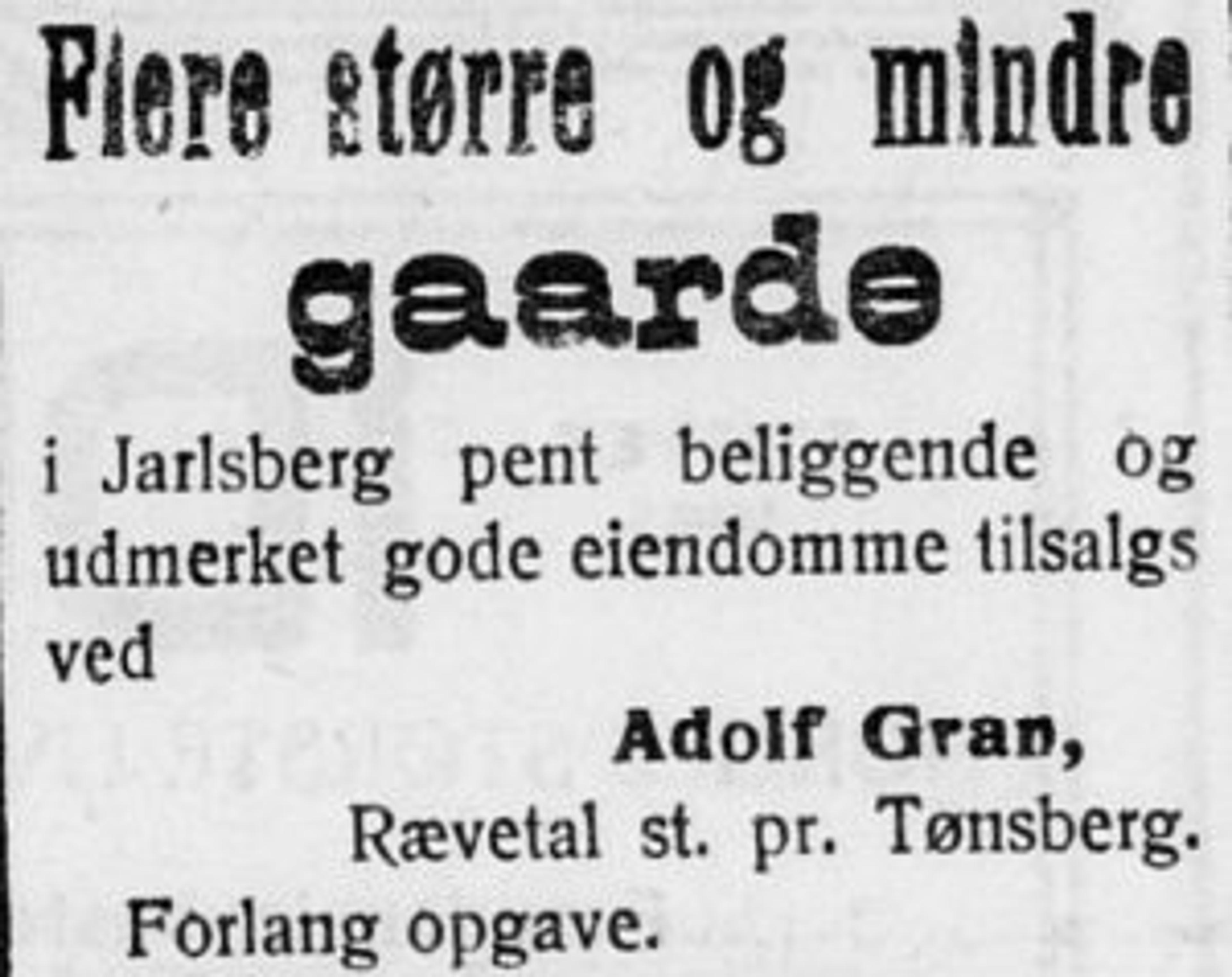ANNONSE: Adolf Gran handlet også med eiendom på Revetal, for hundre år siden. Faksimile avisannonse.