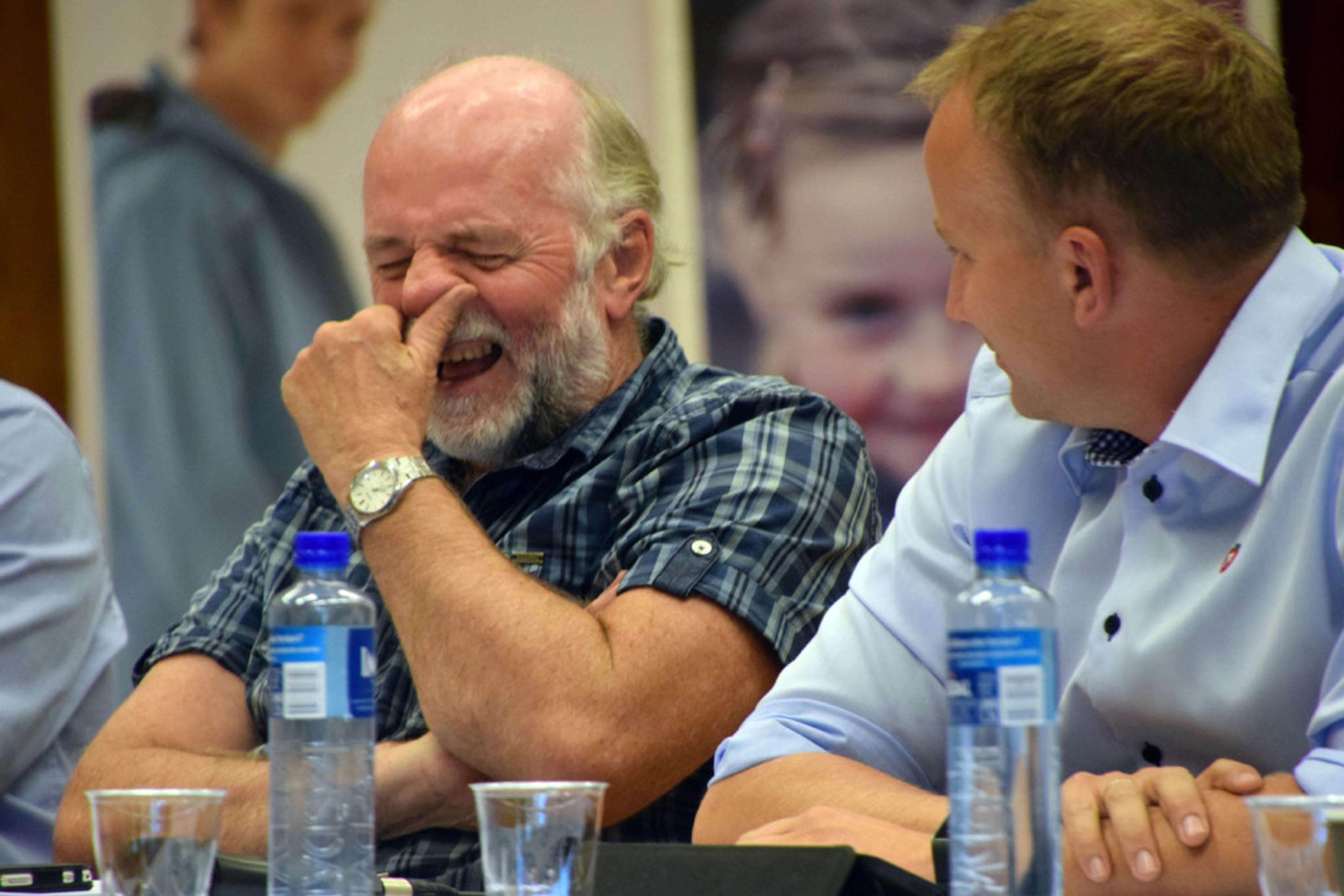 GODT POLITISK ARBEIDSKLIMA: I Re har det vært noe så sjeldent som flere fellesforslag fra SV og FrP. Det å holde barnetrygden utenfor beregning av sosialhjelp var et av disse fellesforslagene – som fikk enstemmig tilslutning i Re. På bildet ser vi Heming Olaussen (SV) og Frode G. Hestnes (FrP). Foto: Stian Ormestad.