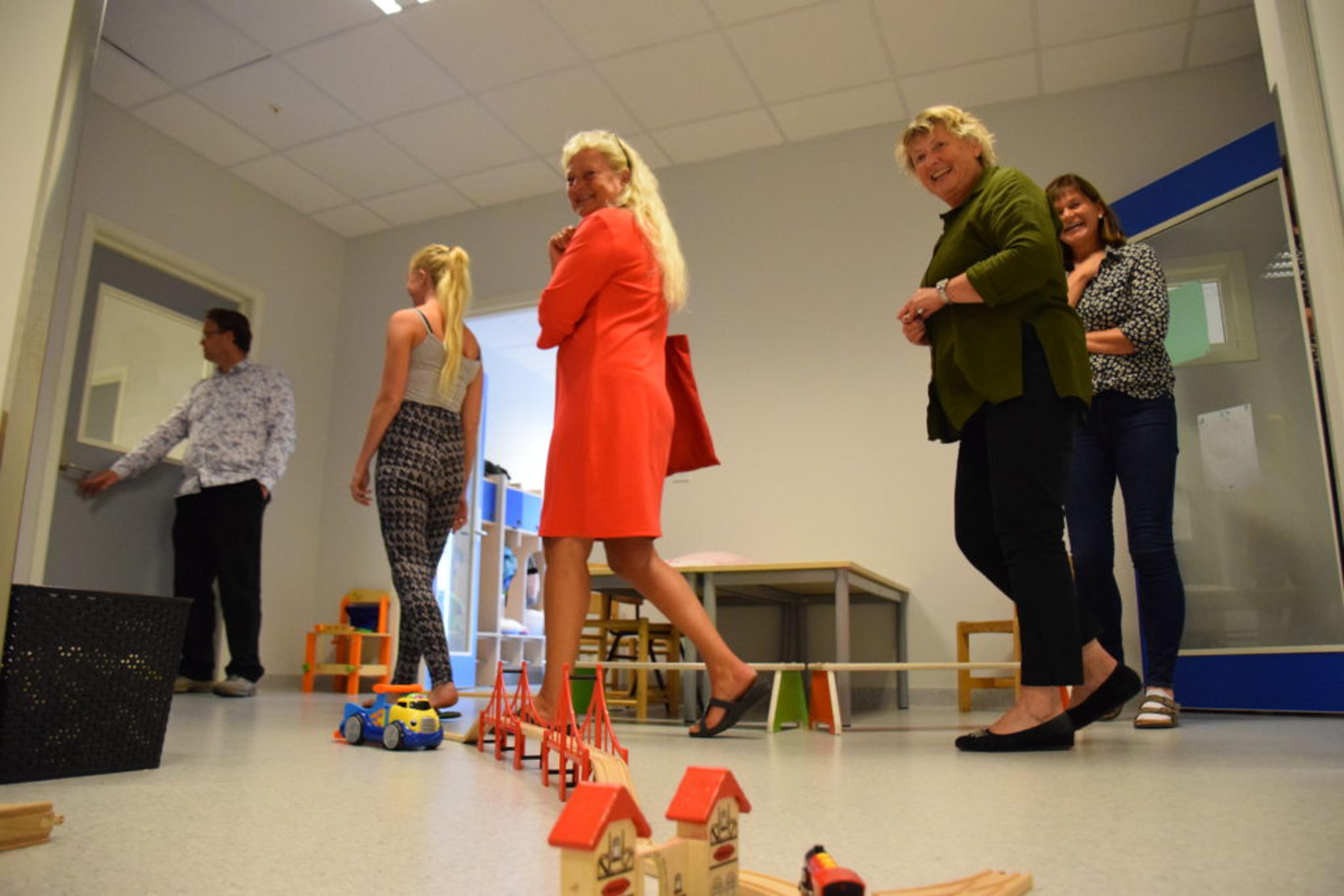TØFFER INN I ORDFØRERSTOLEN: Anne Rygh Pedersen (Ap) besøkte Skjeggestadåsen barnehage i lokalvalgkampen, der hun ble vist rundt av ledelse og tillitsvalgte over jernbaneskinner, tog og leker. Foto: Stian Ormestad,