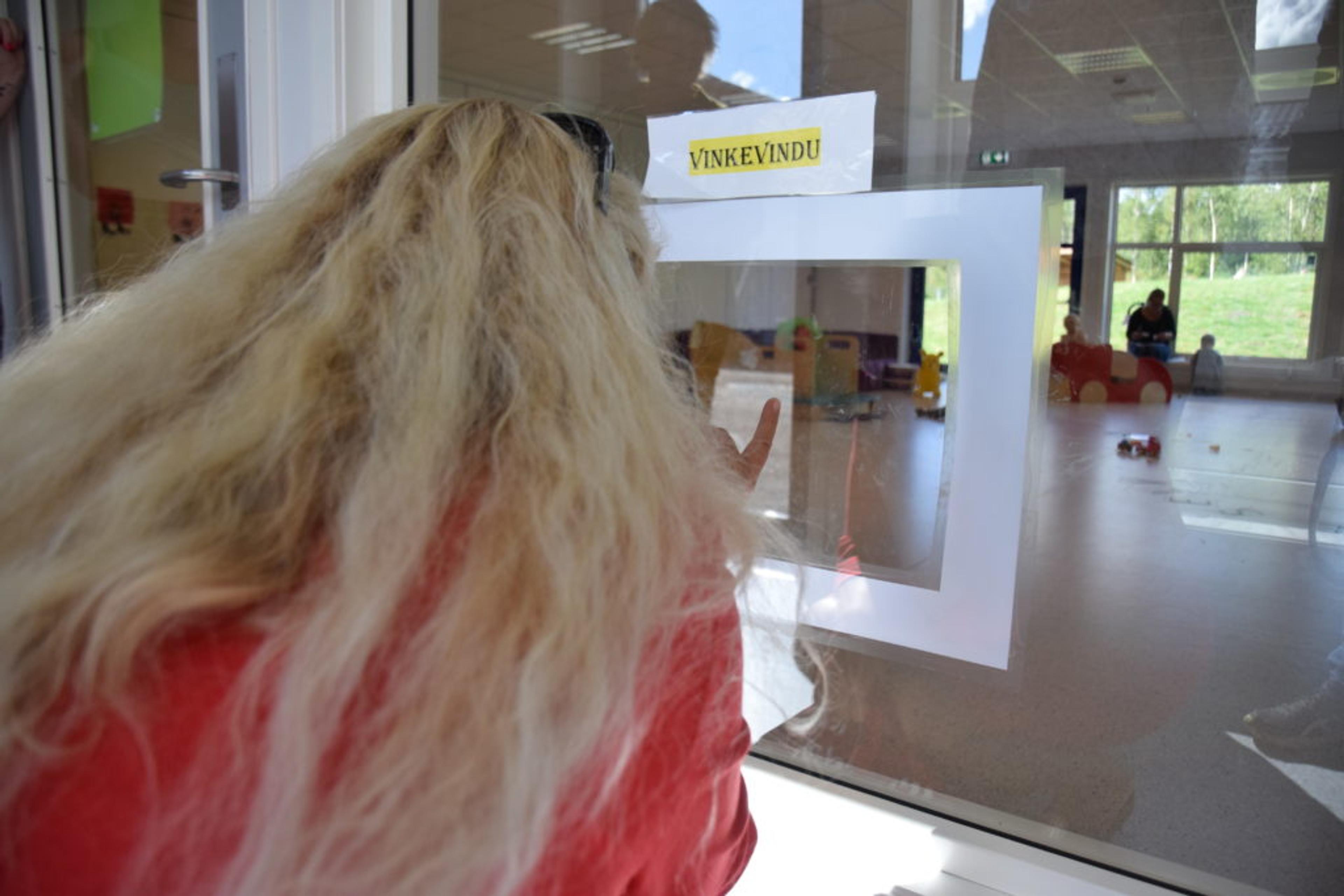 KIKKEHULL: Kanskje kikka Anne Rygh Pedersen (Ap) inn i framtida som ordfører for nye Tønsberg kommune, da hun sjekka ut vinkevinduet på Skjeggestadåsen barnehage i lokalvalgkampen i Re. Foto: Stian Ormestad,