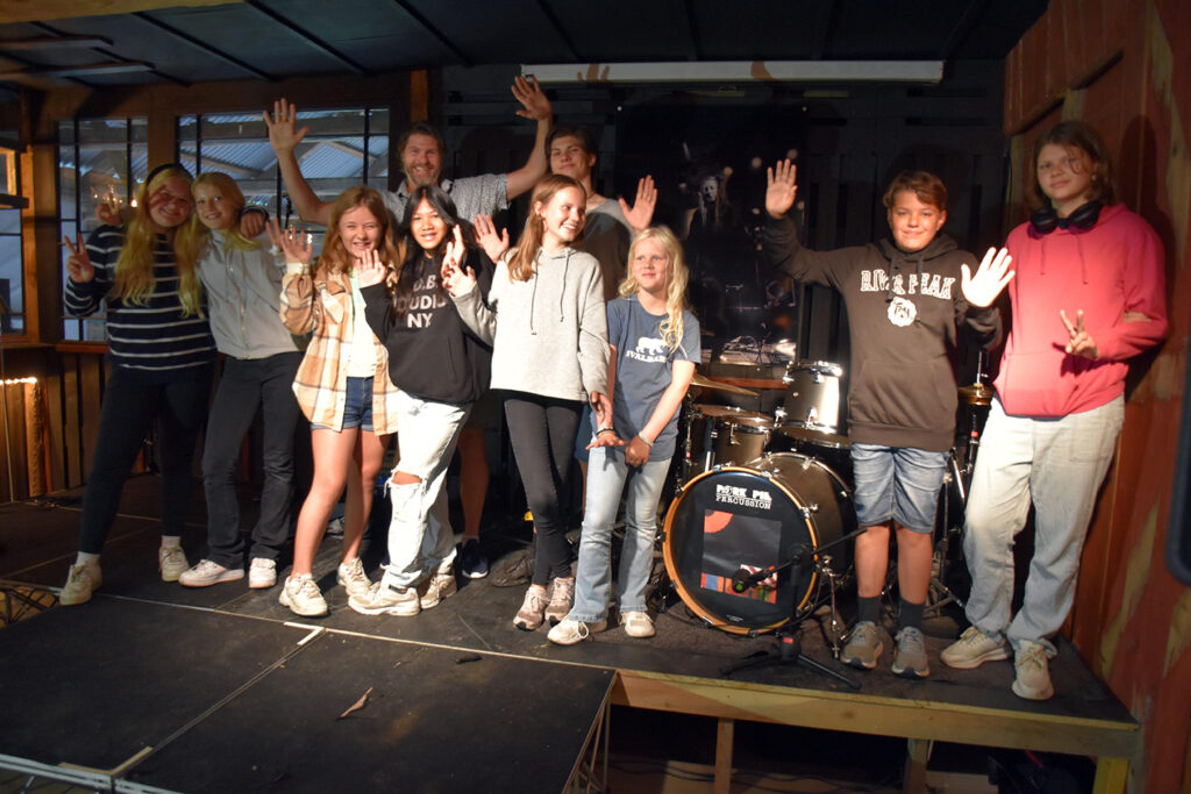 KLARE FOR LÅVESCENEN: Foran fra venstre Sofie S. Karlsson (12), Aurora Kalleberg (12), Ingrid Bøe Røste (11), Rea Rose Nasalo (12), Silje Theiste Gjersøe (13), Maja Larssen Østlie (9), Simon Bryme (11), Hannah H. Hansen (15). Bak fra venstre Thor-Morten Hansen (46) og Håkon H. Hansen (17). Foto: Stian Ormestad.