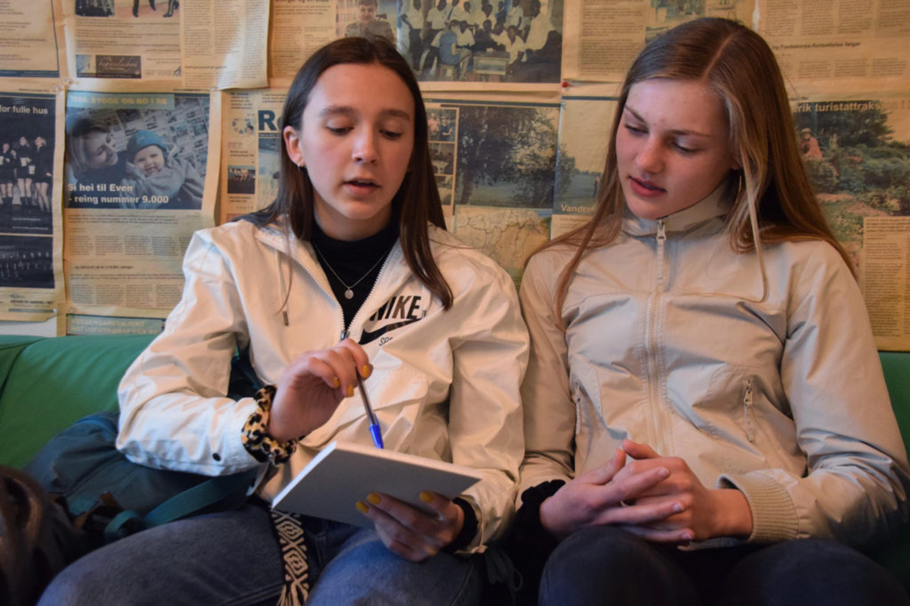 FORBEREDELSER: Hva kan vi spørre om?, planlegger Lovis og Lykke. Både spørsmål og svar kan du lese i ReAvisa torsdag denne uka. 9. klassingene står for hele saken sjøl, med både tekst og bilder. Foto: Stian Ormestad.