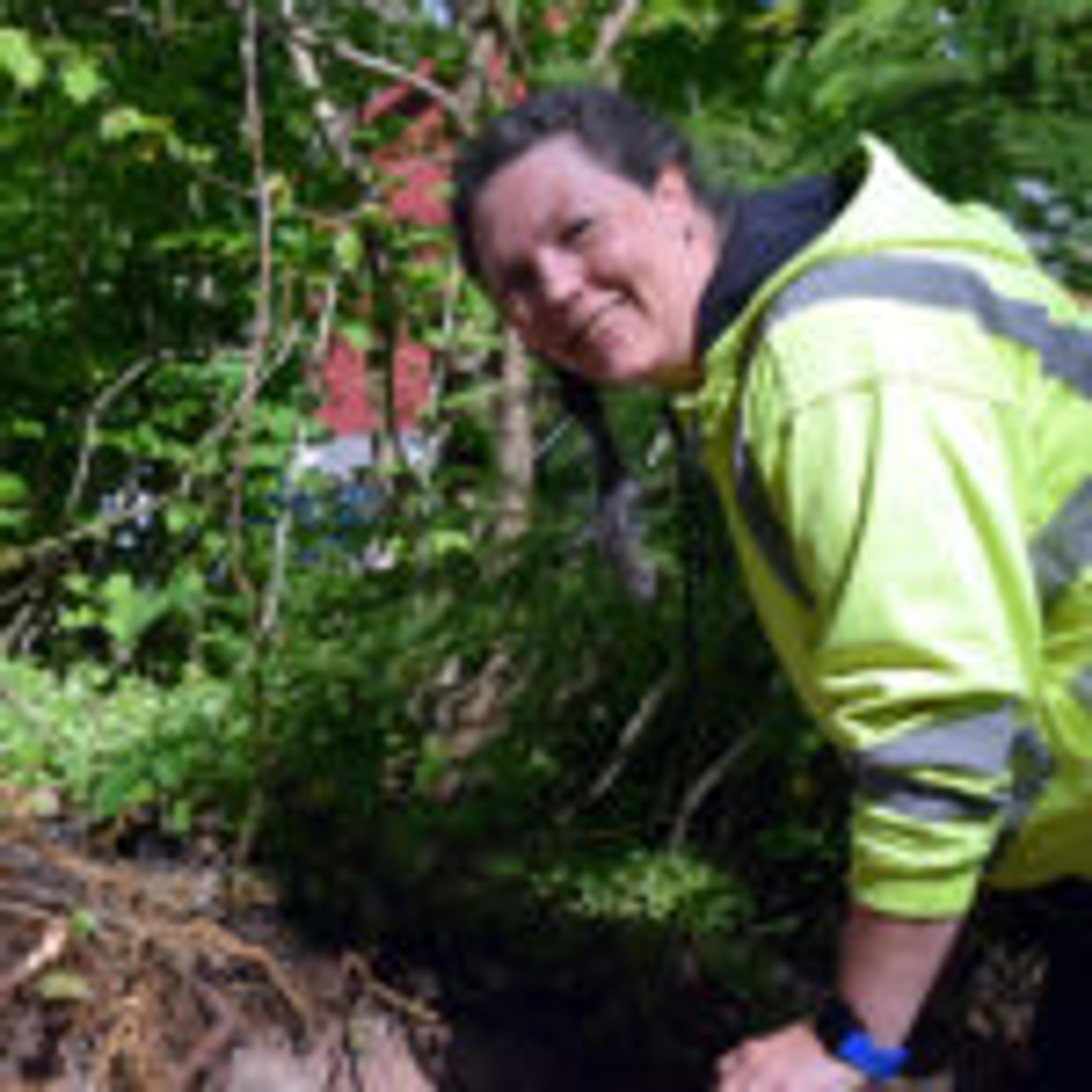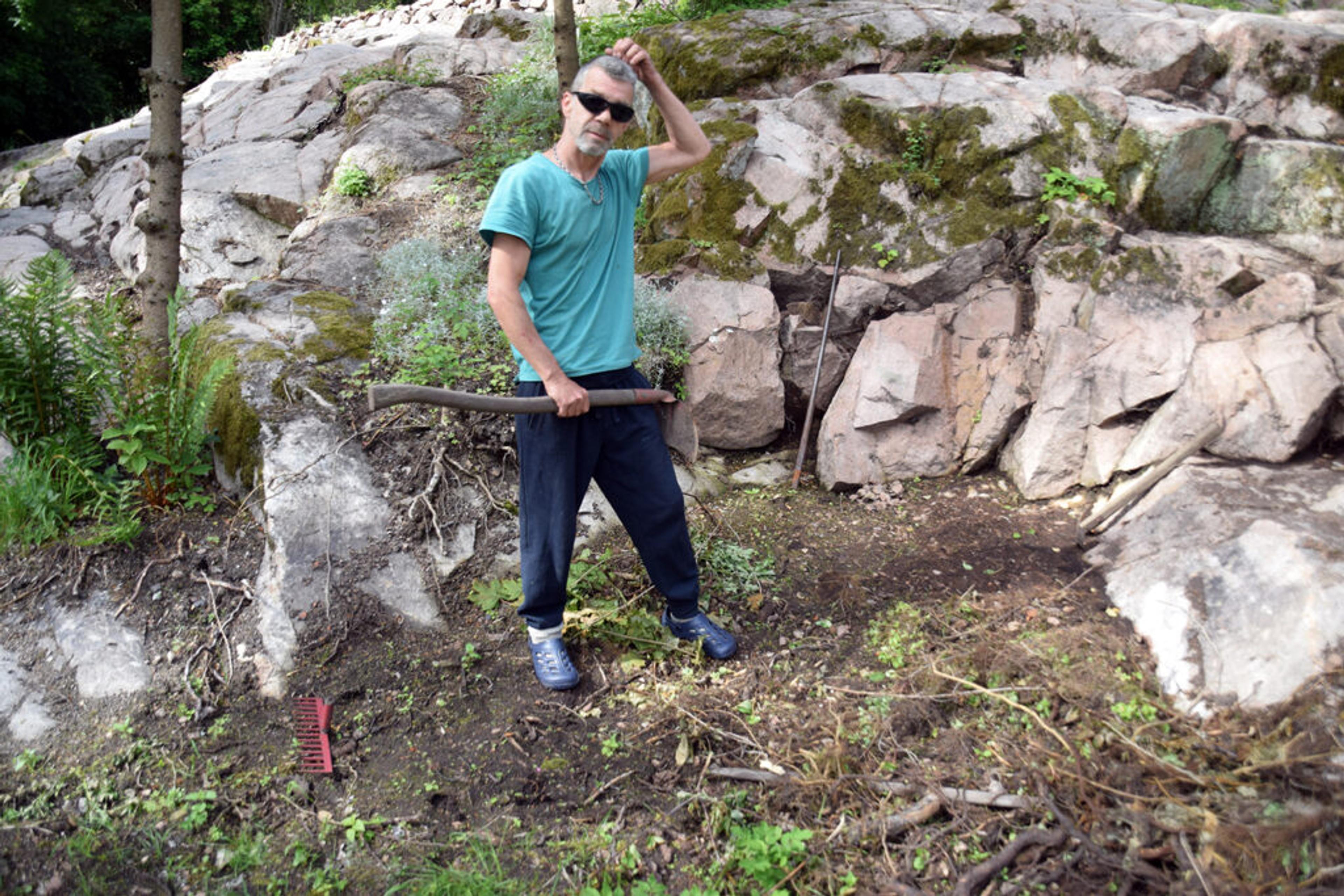 Stig Bakke Larsen (48) driver på nedi fjellskrenten ved barndomshjemmet sitt på Lundteigen om dagen. Her rensker han fjell og planerer plen.