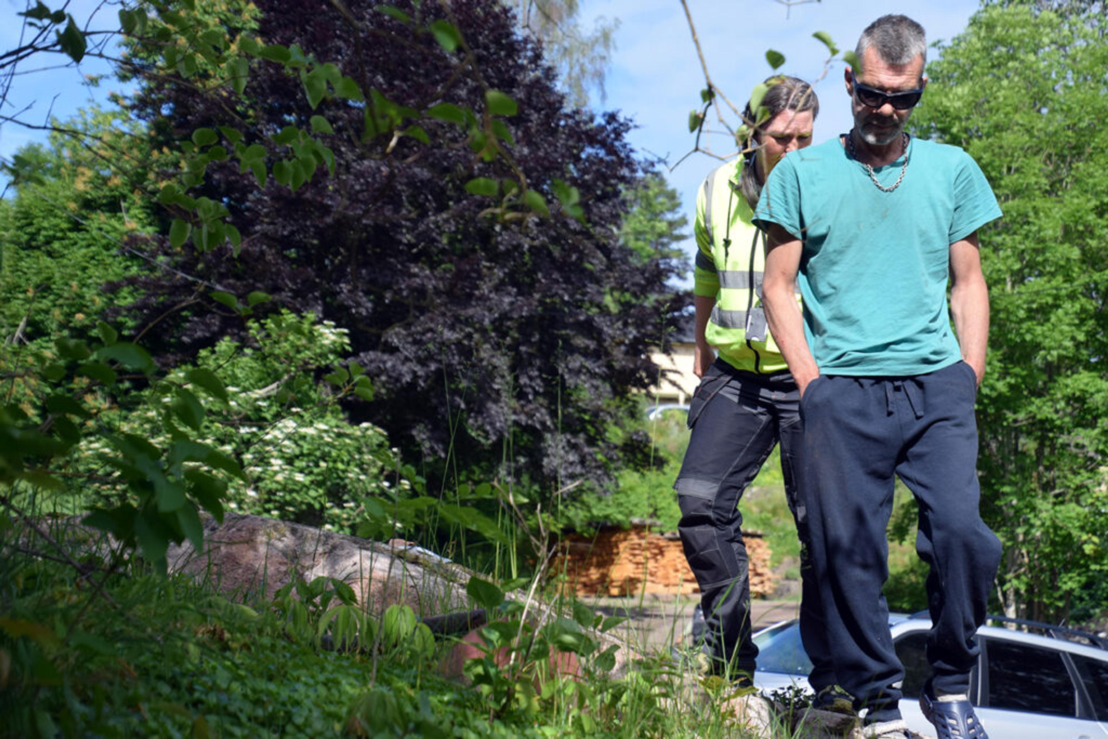 SJELDENT FUNN: Stig Bakke Larsen viser funnstedet på tomta til barndomshjemmet på Lundteigen til arkeolog Julie Askjem. Foto: Stian Ormestad.