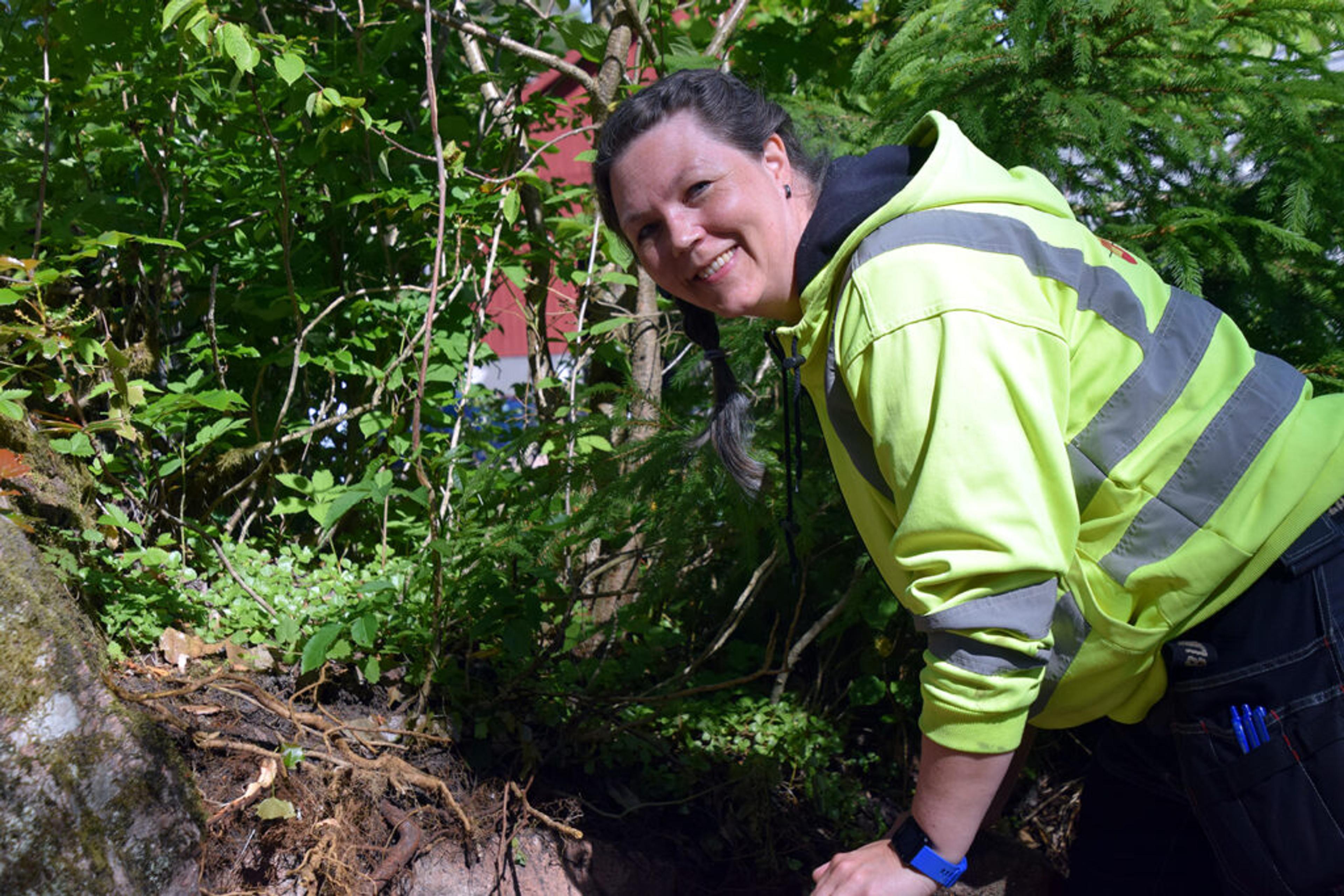 SØKER GJENNOM OMRÅDET: Julie Askjem, arkeolog i Kulturarv i Vestfold og Telemark fylkeskommune, ble på Lundteigen en god stund onsdag forrige uke for å kartlegge området enda mer nøyaktig. Foto: Stian Ormestad.