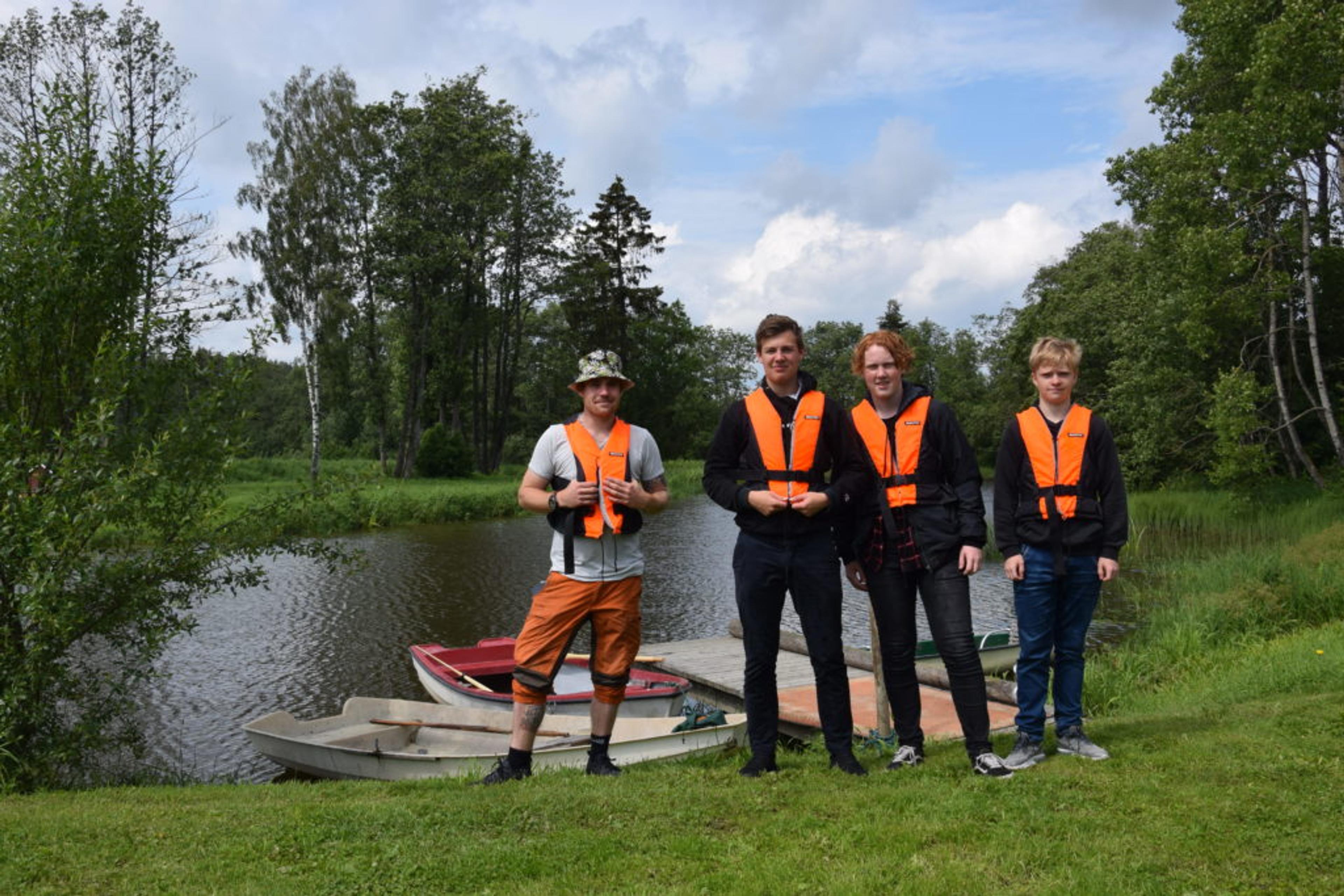 UT PÅ STORELVA: Lars Jensen, assistent, og 9. klassingene Theodor Larsen, Henry Mortensholm og Eirik Nyvoll er klare for en rotur langs Storelva. Foto: Håkon Westby.