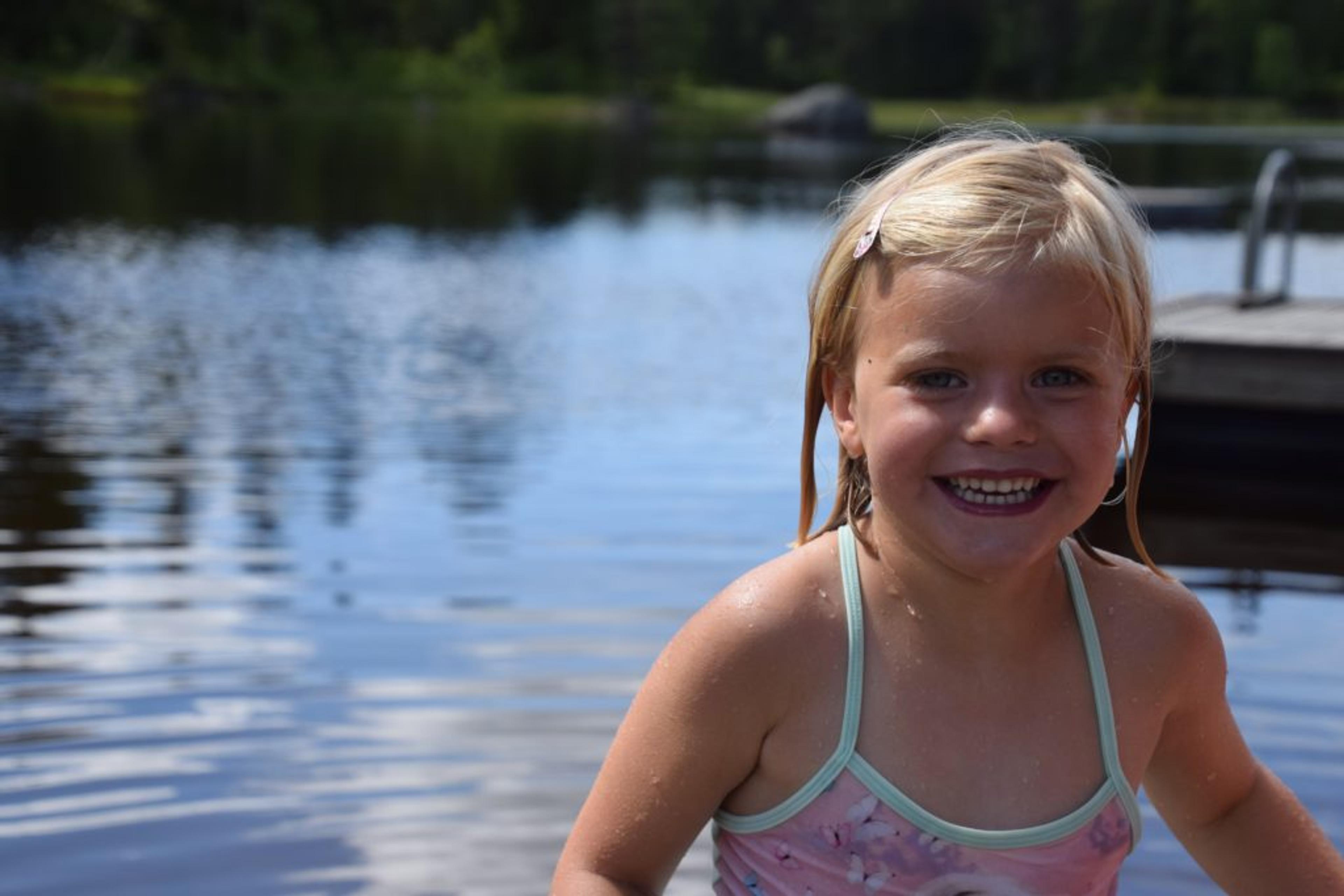 BADEGJESTER FRA TØNSBERG: Amelia Klemo (5) fra Husvik i Tønsberg koser seg på Merkedammen i Vivestad sammen med storebror, mamma og mormor. Les mer om det flotte Merkedammen-området i august-avisa! Foto: Stian Ormestad.