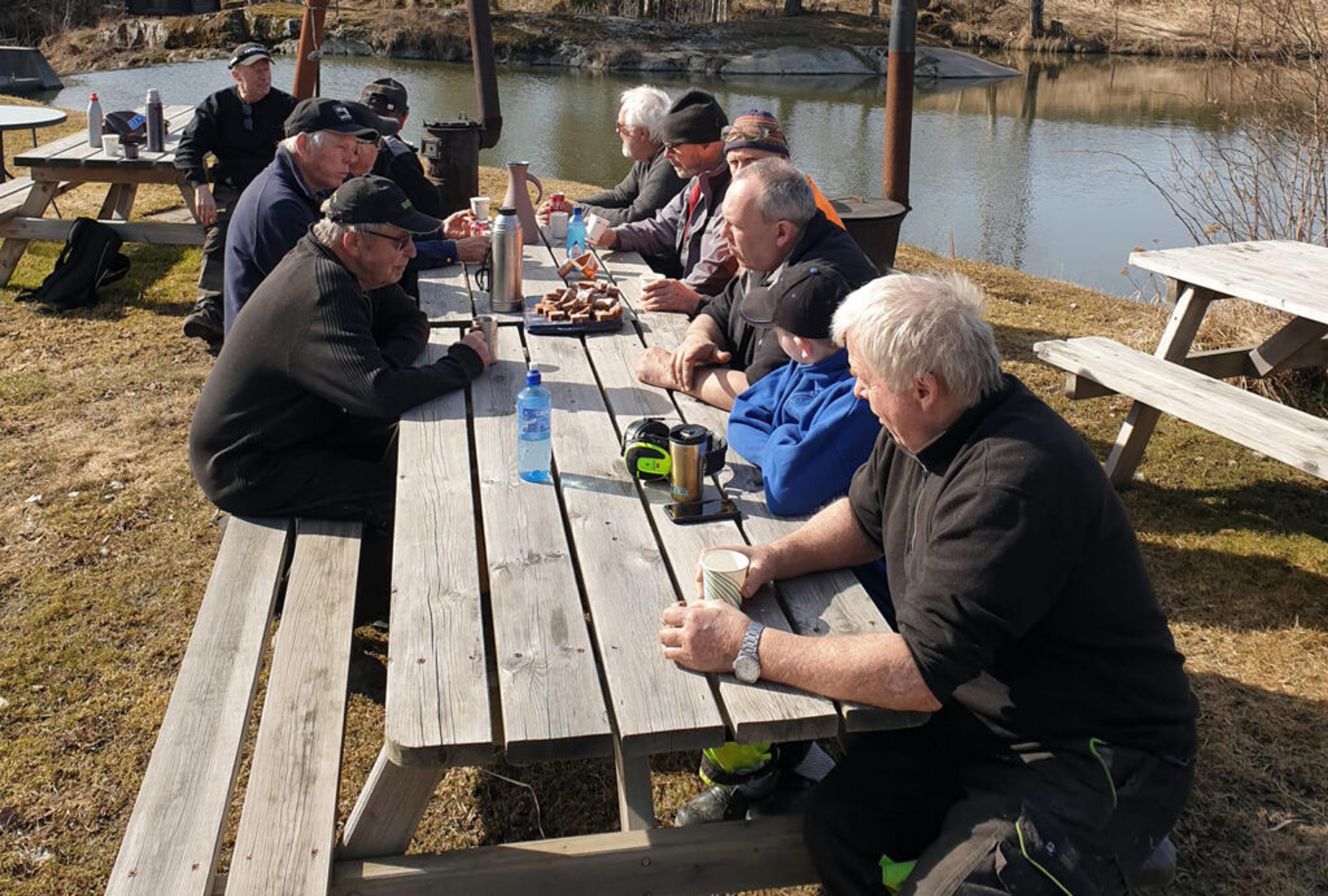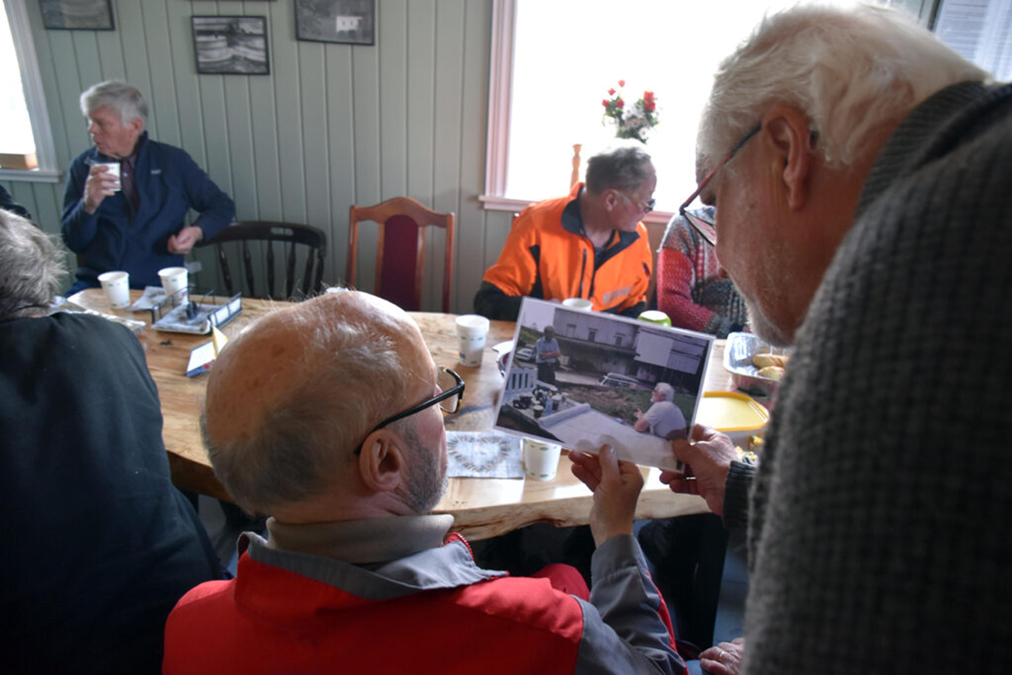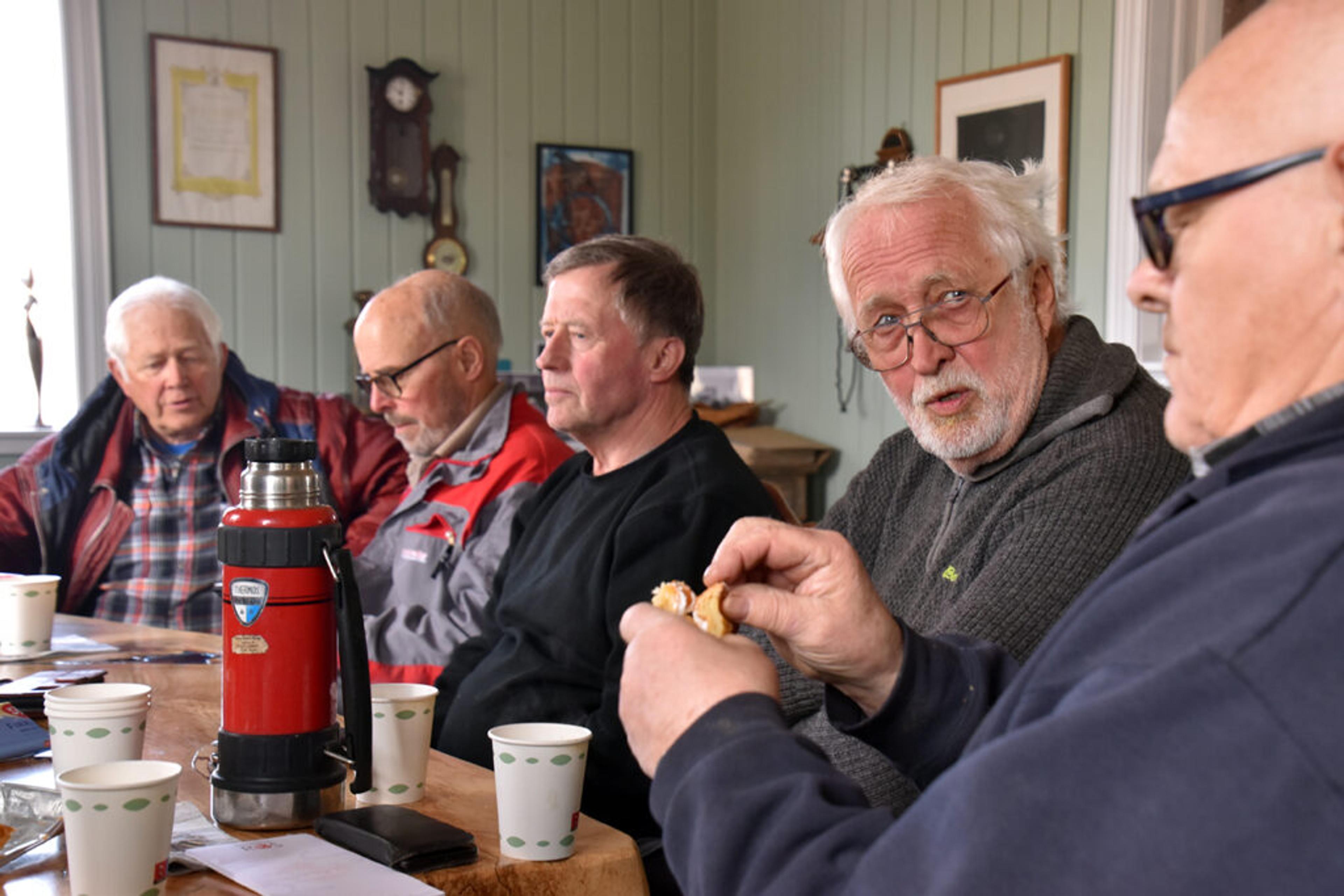 TRIVELIG TREFF: Praten går om Øivind, om et vrient svinghjul på dampmaskinen, vannstanden i mølledammen, eventuell åpning av toalettanlegget før eller etter påske, og mye, mye mer, på den aller første kaffitorsdagen på Bakke mølle etter at ildsjelen Øivind Skjeggerød gikk bort .Foto: Stian Ormestad.