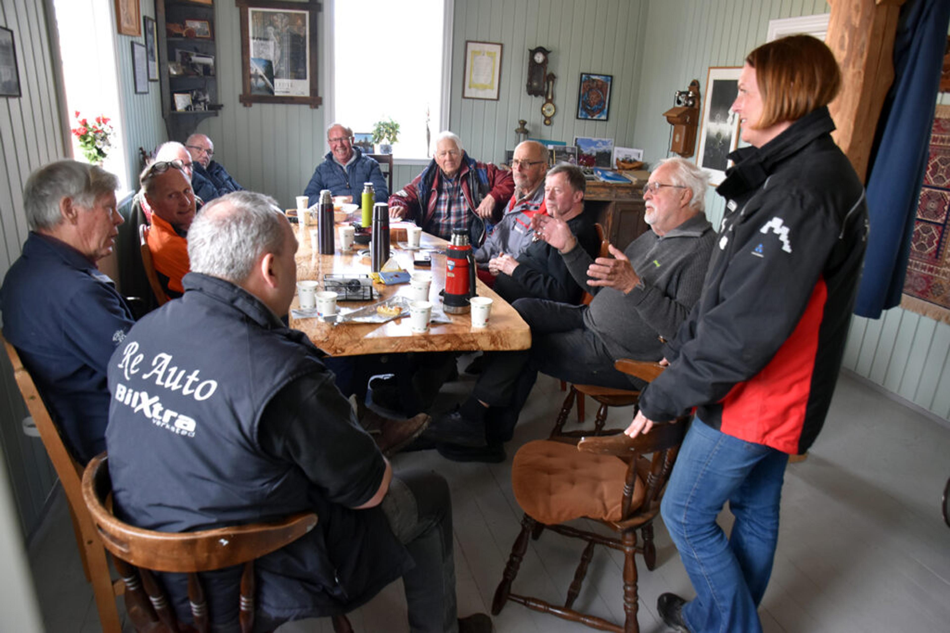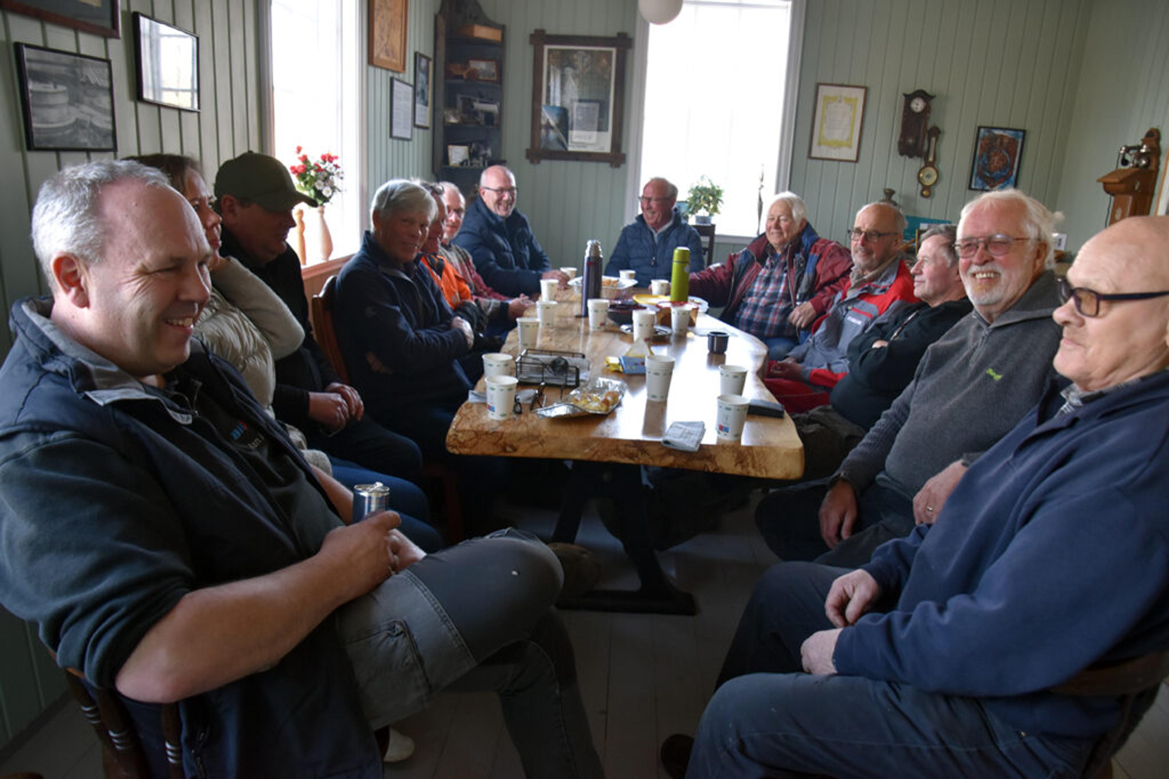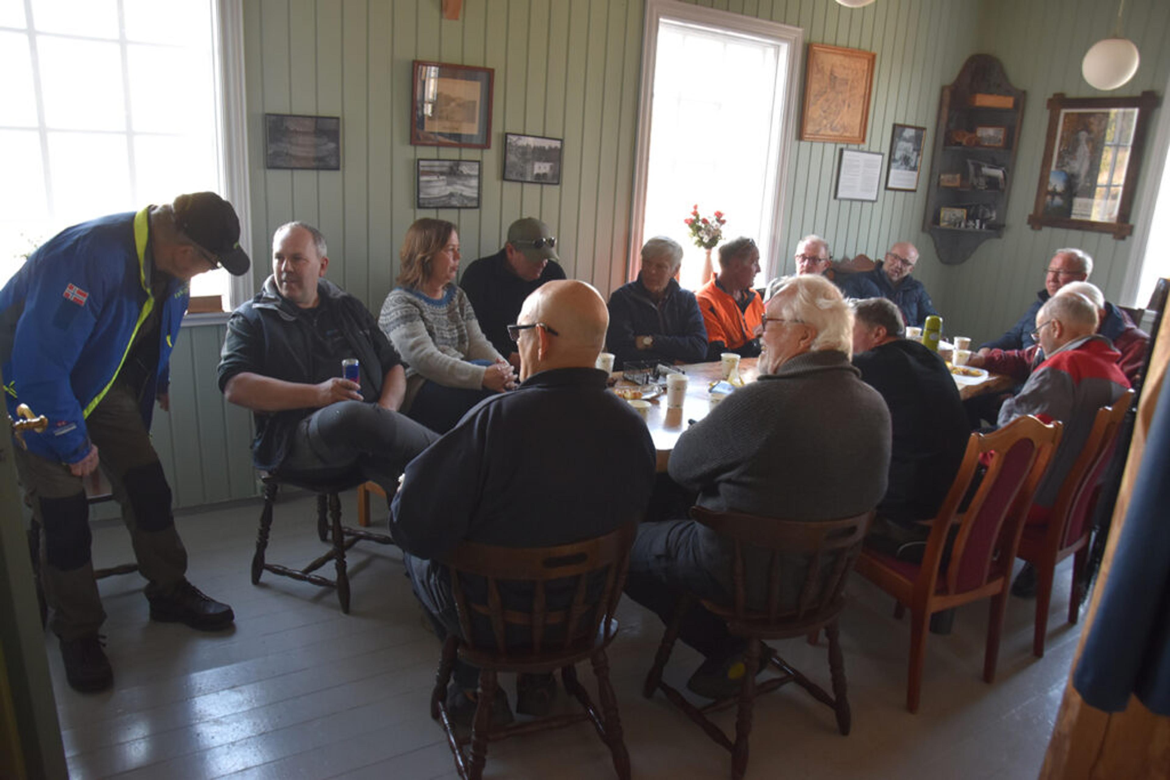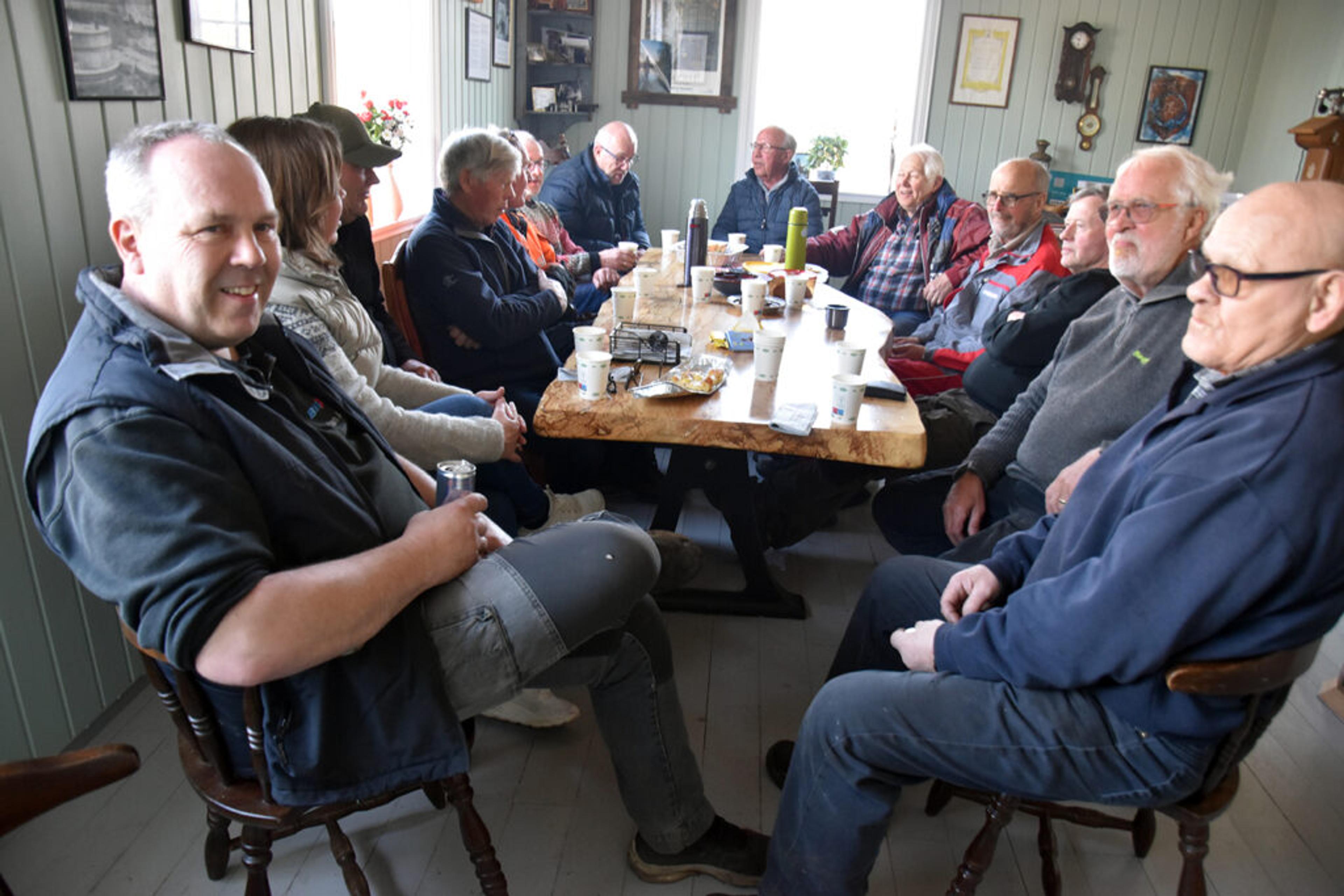 KLARE FOR DUGNAD: – Det er dette Øivind hadde ønska, er alle rundt kaffibordet enige om. – At mølla skal bli brukt, at folk kommer hit og bruker treprammene og det fantastisk flotte området her. Og at mølla lever videre er det mange som vil bidra til. Foto: Stian Ormestad.