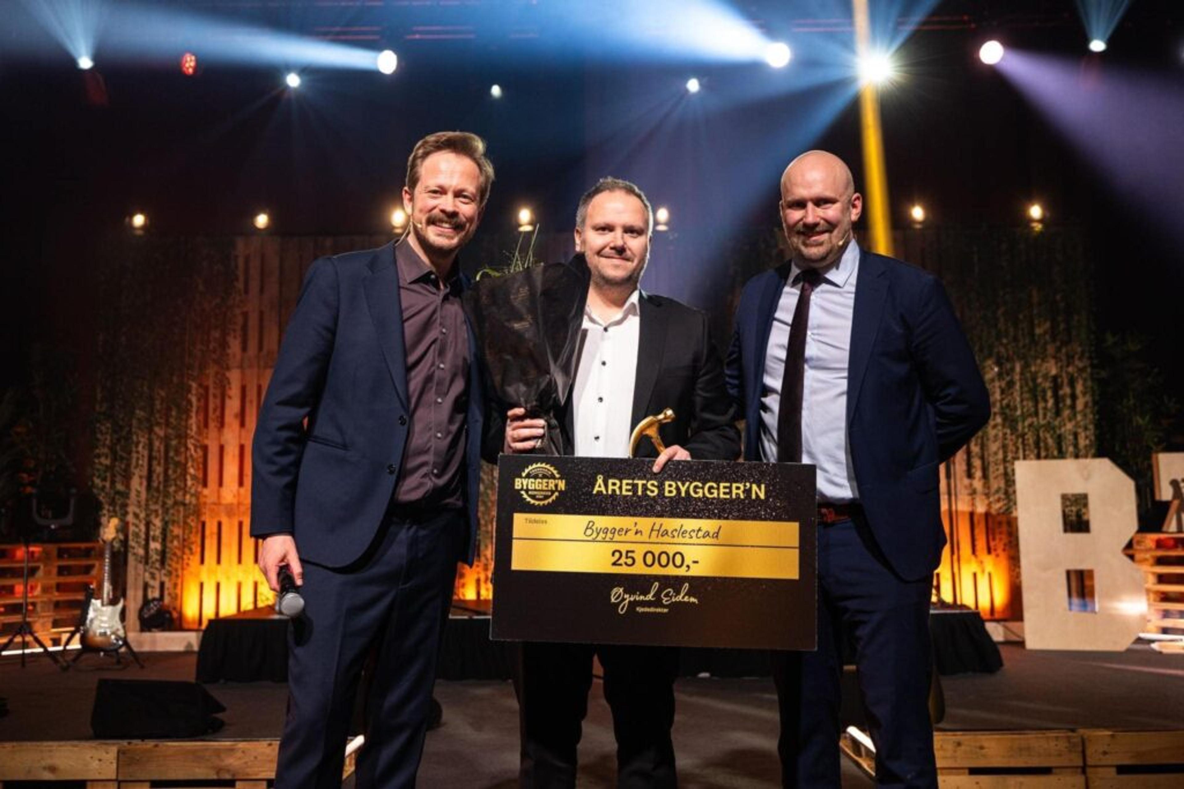 PRISBELØNT: Daglig leder Bård Solberg fra Re kunne sist helg motta beviset for at Bygger’n Haslestad i Hof er Årets butikk i landet. Her sammen med konferansier Einar Tørnquist og kjededirektør Øyvind Eidem. Foto: Bygger’n.