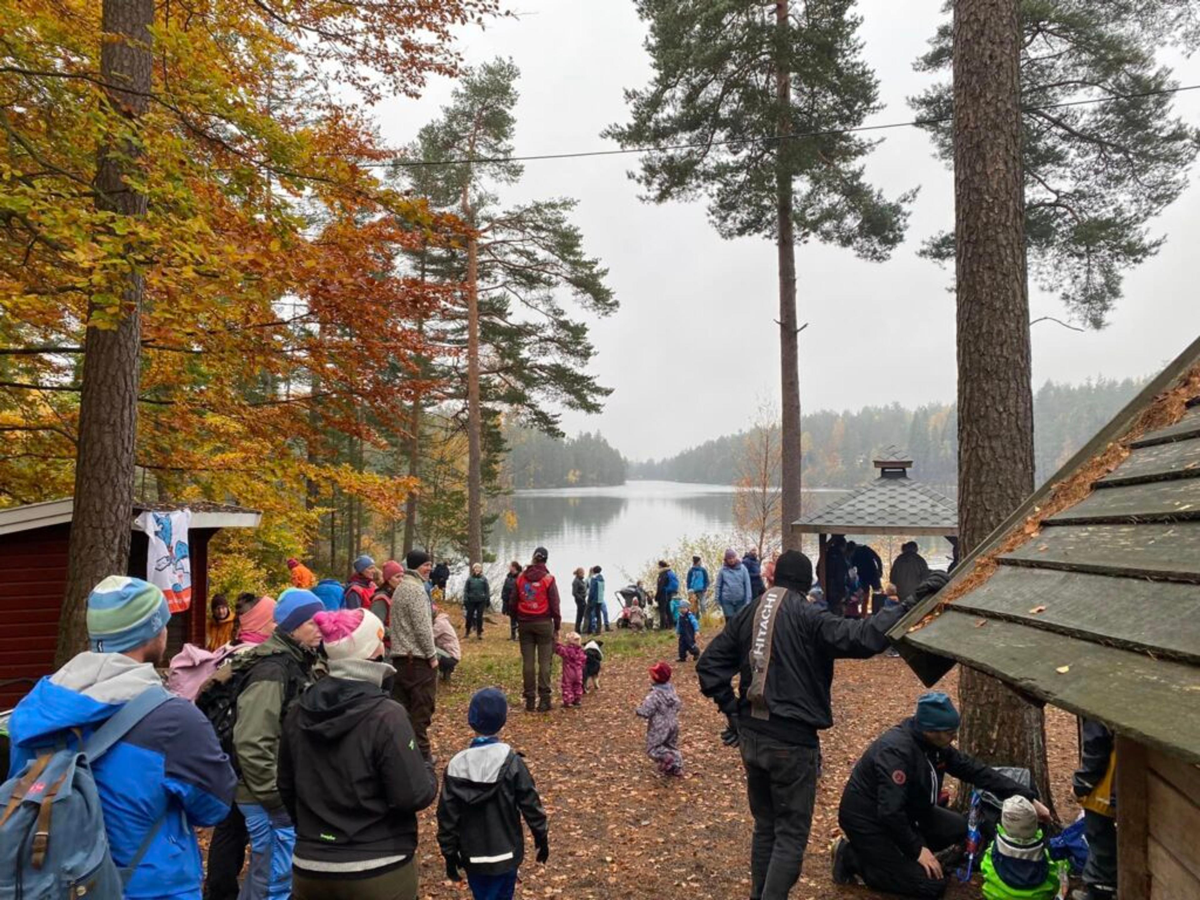 FOLKSOMT: Langevann er det fint turmål, året rundt. Spesielt folksomt var det da Barnas turlag i Re la sin aller første tur hit søndag 23. oktober 2022. Foto: Privat.