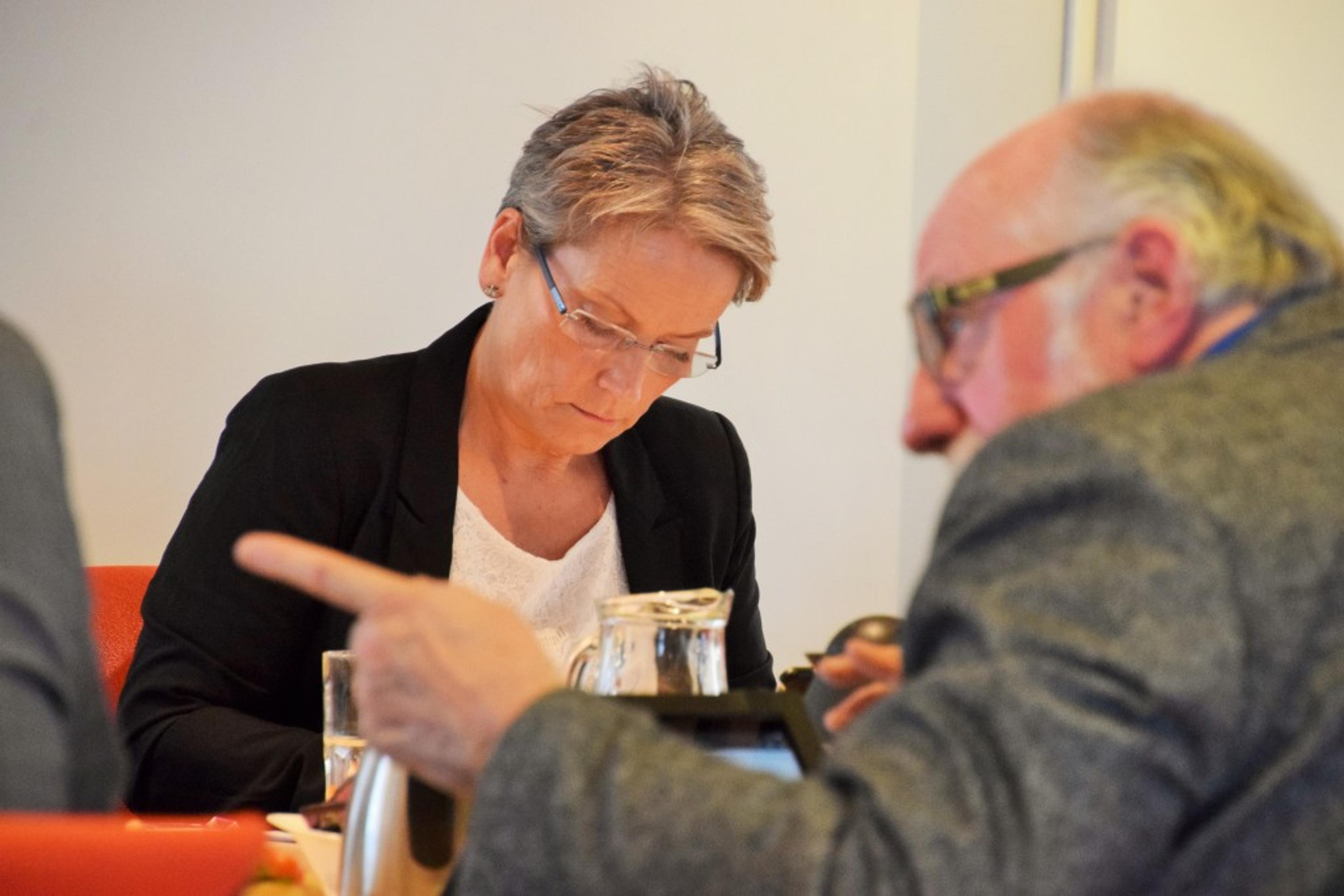 IKKE ENIG: Tove Øygarden (H) mener en slik stilling først som sist burde samordnes med Tønsberg. Heming Olaussen (SV) er ikke enig: – Dette er viktig å få på plass før vi er en del av Tønsberg. Foto: Stian Ormestad.