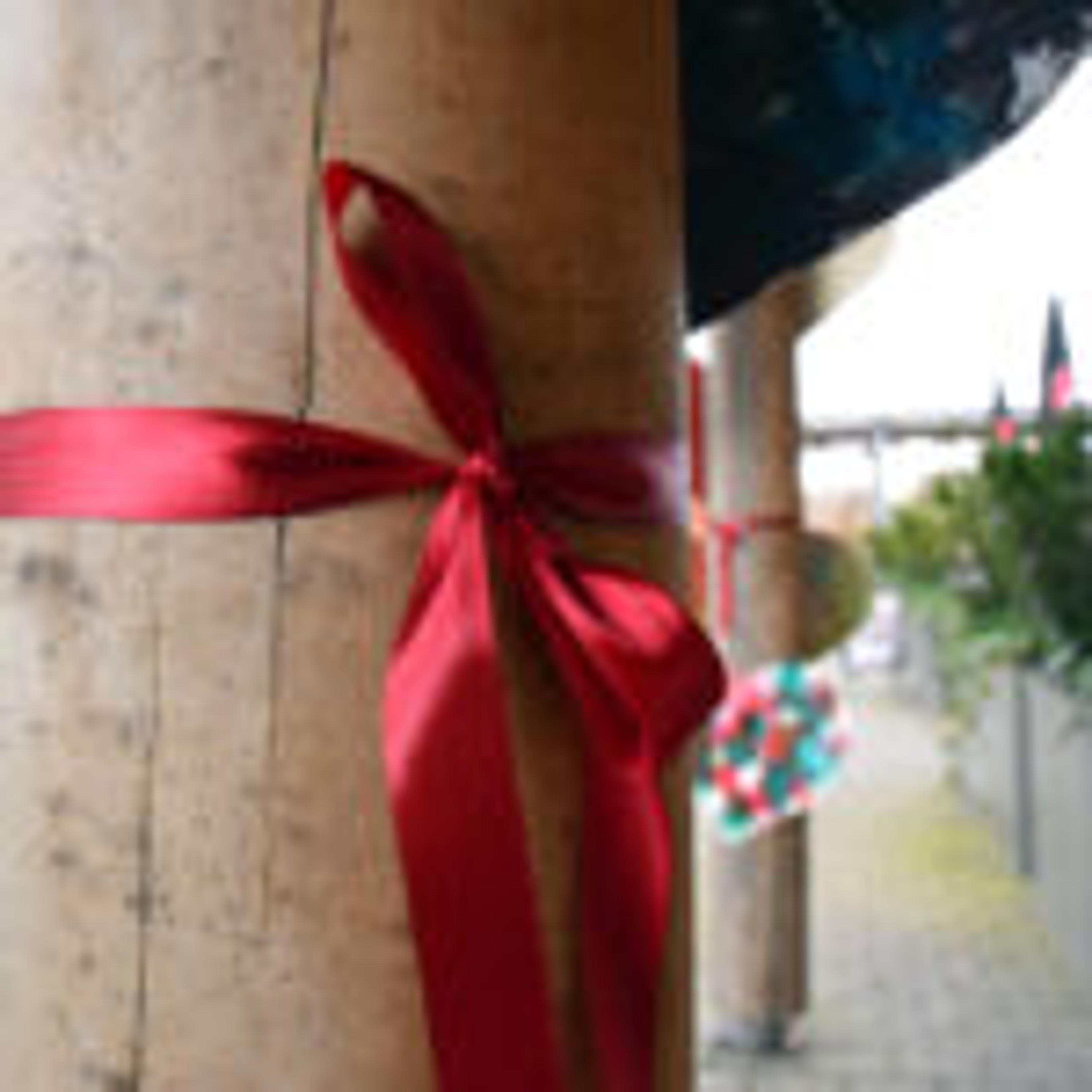 JULEMONTASJE: Med lekre sløyfer rundt søylene foran kommunehuset skal den flotte julepynten henge trygt gjennom førjulstida her i Re. Foto: Stian Ormestad.
