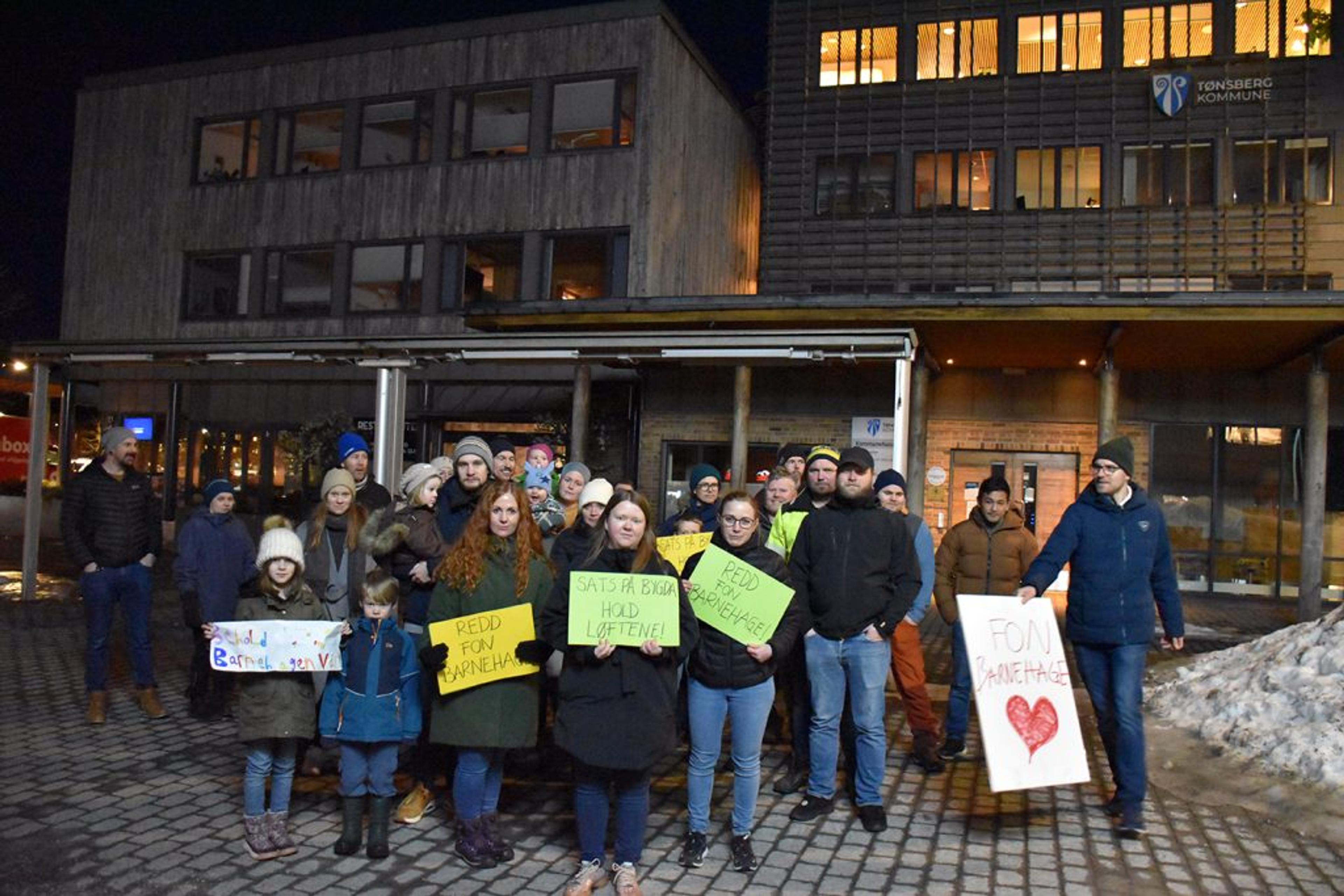DEMONSTRERTE: Folk fra flere kanter av Re kom til markeringa utafor kommunehuset på Revetal, da barnehagenedleggelse sto på agendaen for utvalgsmøte tidligere denne måneden. Foto: Stian Ormestad, ReAvisa.