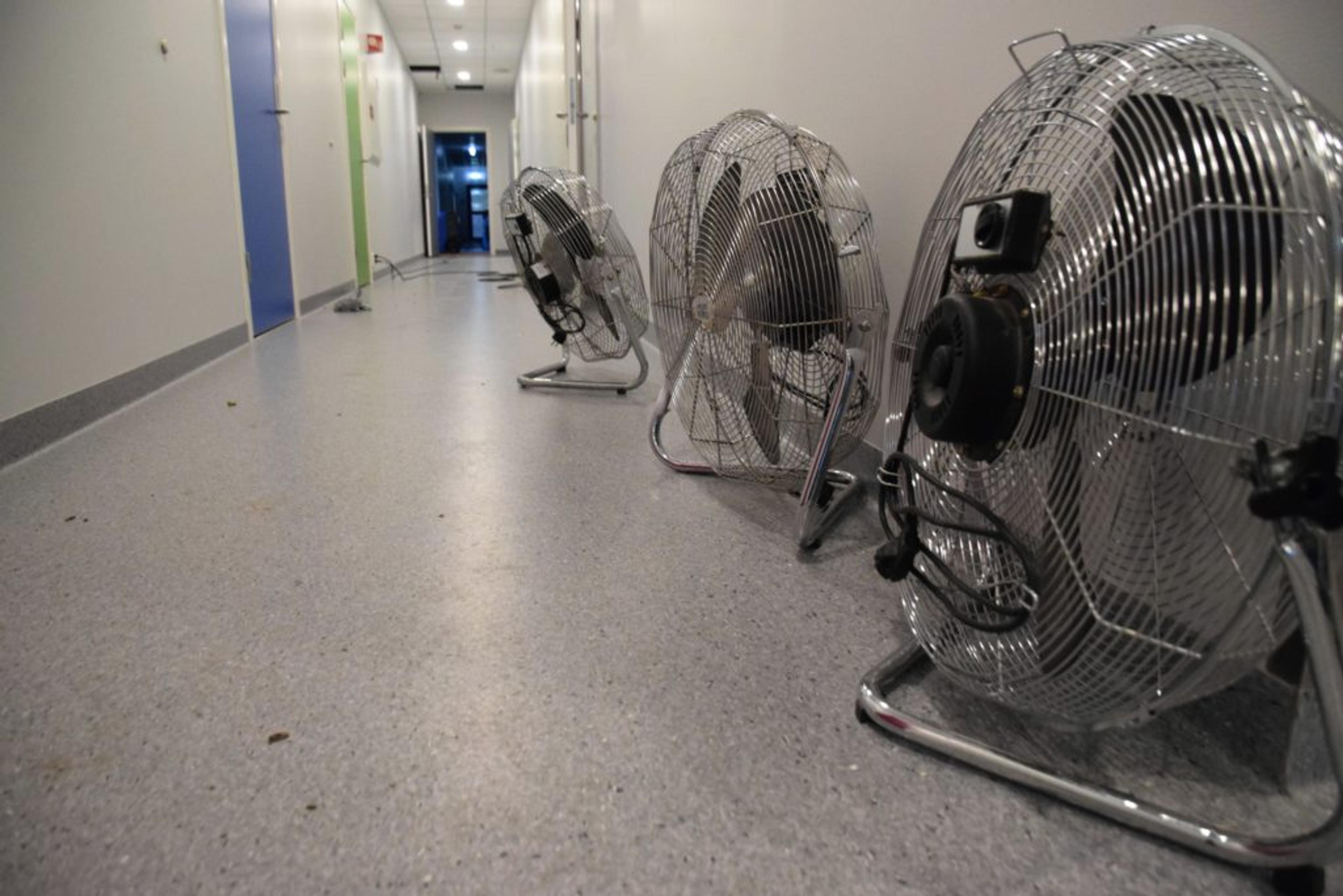 VIFTER OVERALT: Bygget tørkes med vifter og maskiner rundt om i hele bygget. Foto: Stian Ormestad.