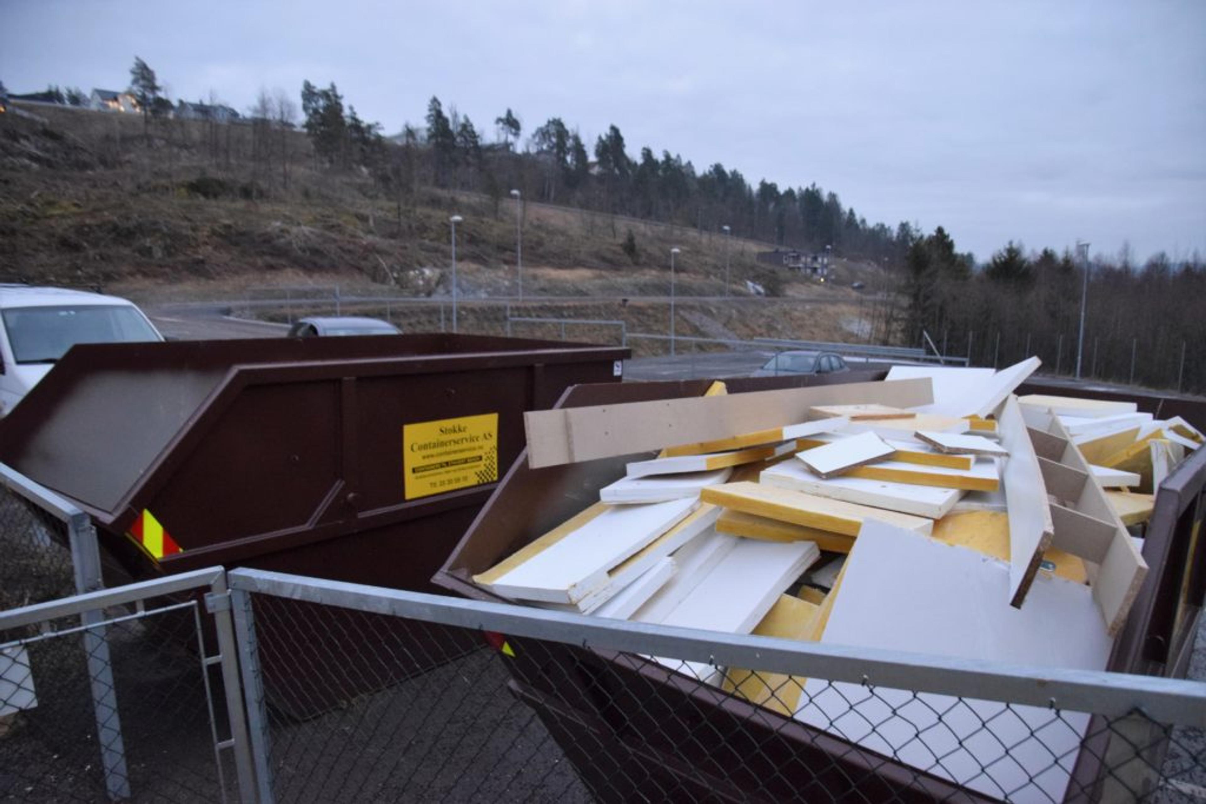 AVFALL: Kontainere fylles med bygningsavfall utenfor barnehagen. Takplatene rakk å henge i litt over ett år før de må byttes ut på grunn av vannskader. Foto: Stian Ormestad.
