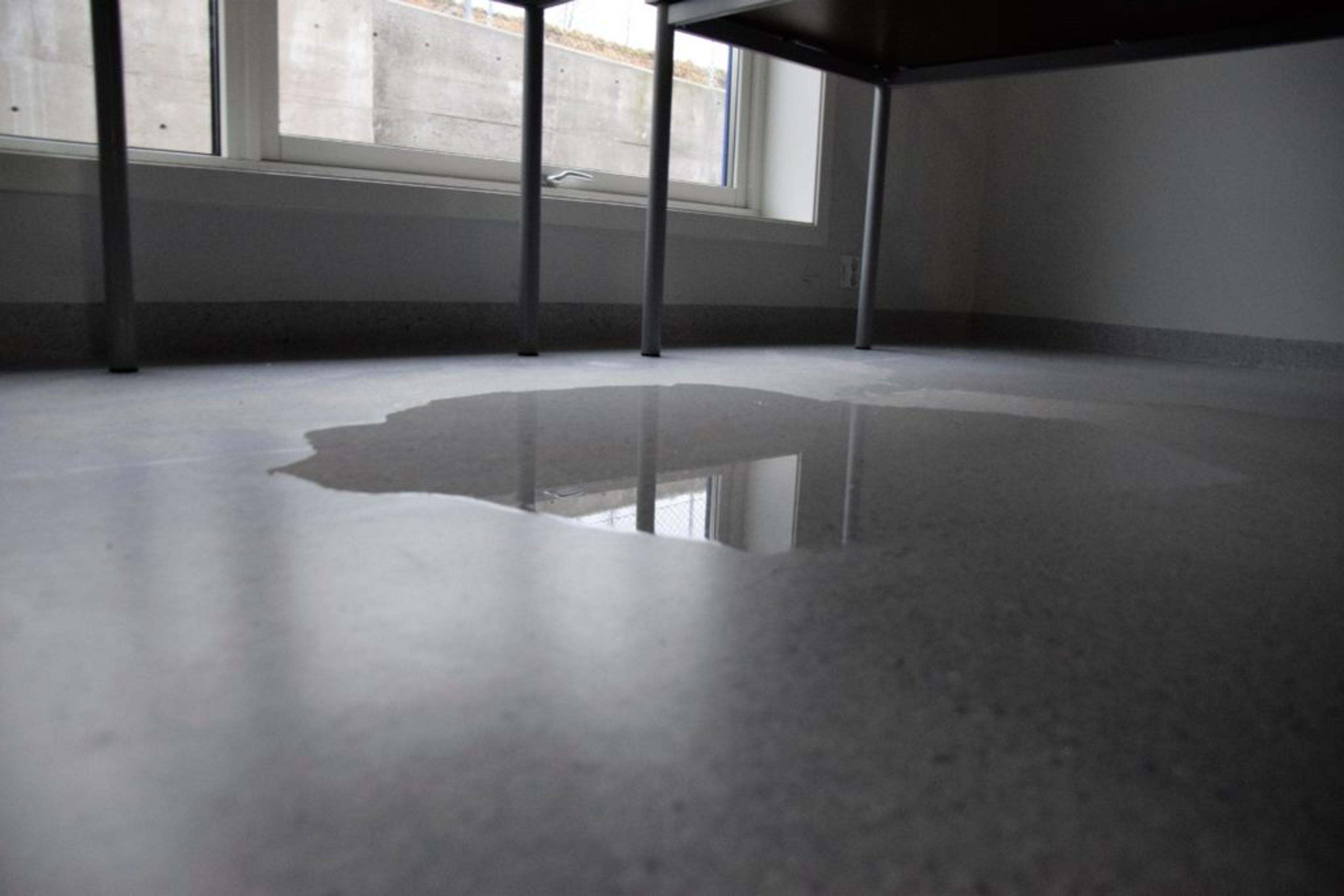 FORTSATT VANN PÅ GULVET: Flere dager etter vannlekkasjen finnes det fortsatt flekker med vann på gulvet. Foto: Stian Ormestad.