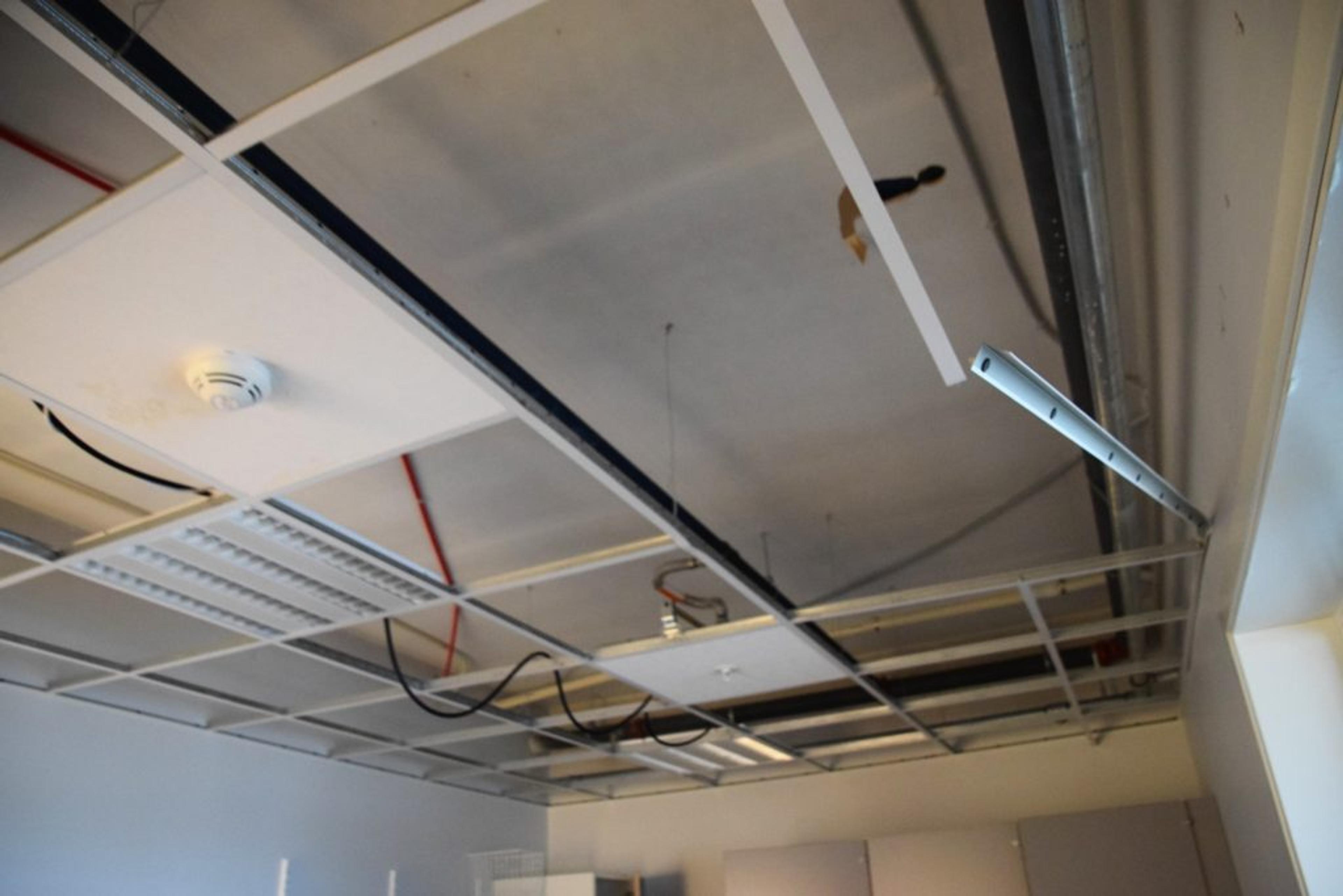 TAKPLATER: Vannet har rivi med seg takplater på sin vei ned fra sprinkelanlegget i taket. Foto: Stian Ormestad.