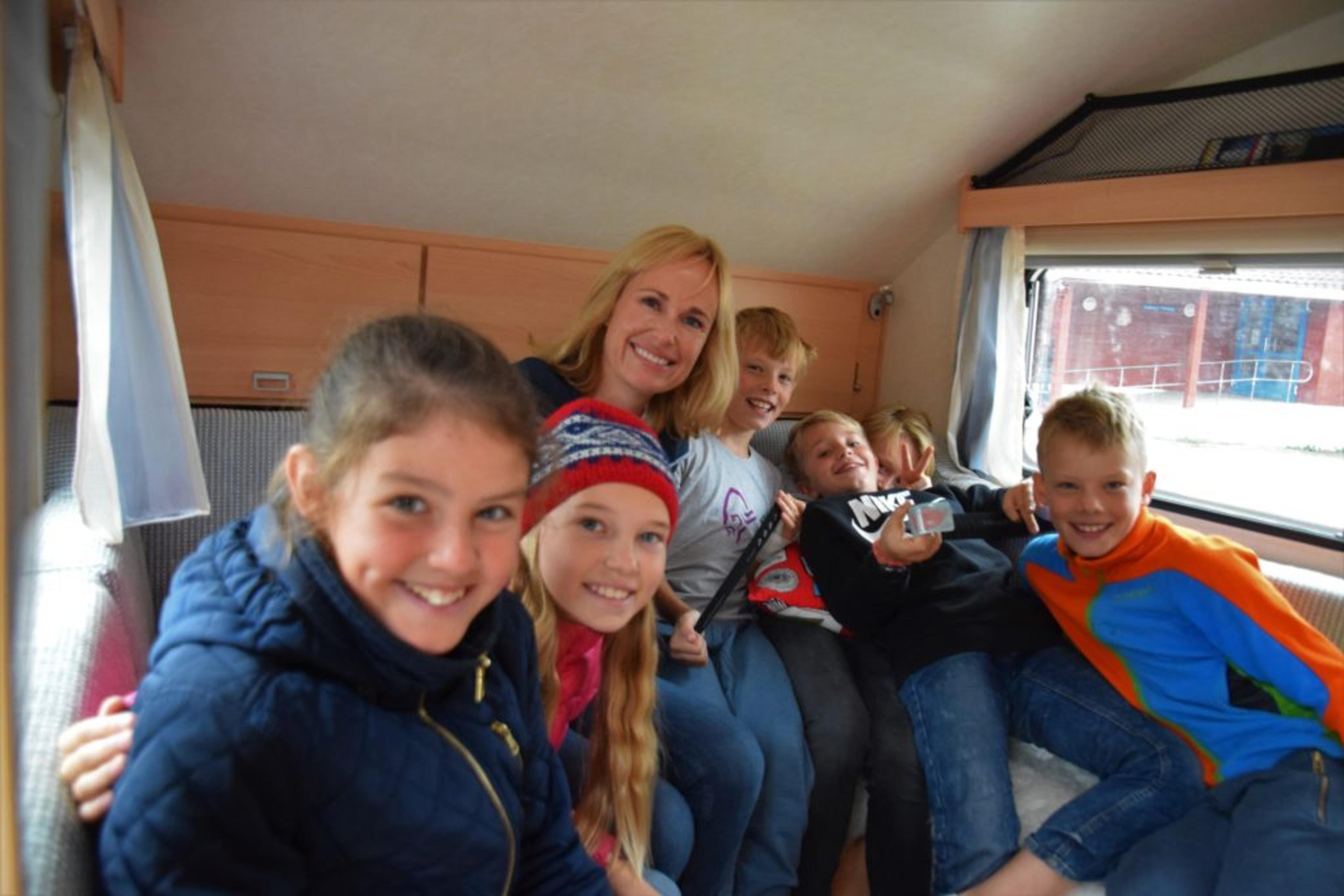 I CAMPINGVOGNA: Julie Tveiten (11), Natalie Fiskerstrand (10), barneombud Anne Lindboe (46), Eirik Nordli Heierstad (10), Bror Langklep (10), Noah Bræmli (10) og Gjermund Nordli Heierstad (10). Foto: Stian Ormestad.
