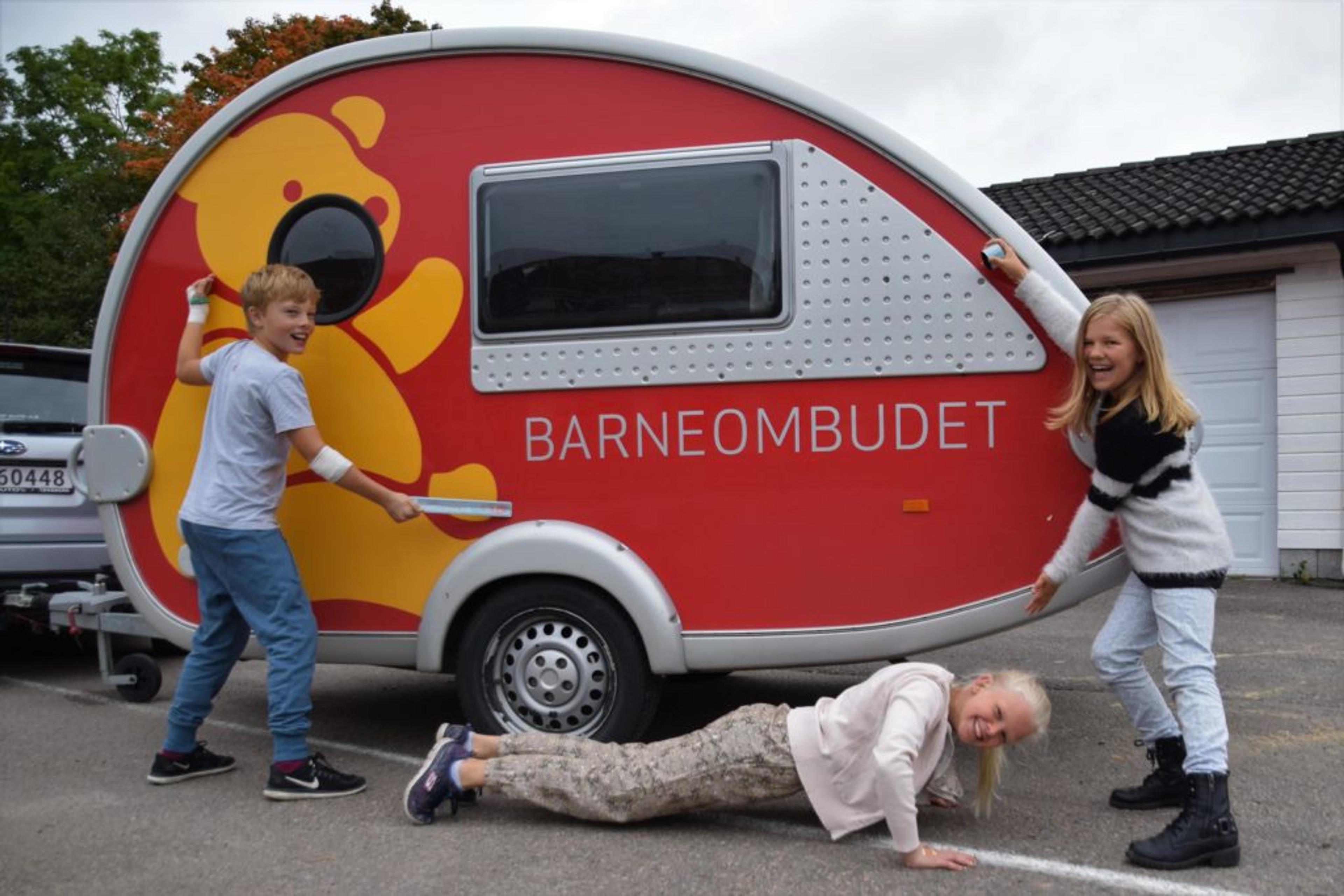 KUL CAMPINGVOGN: Eirik Nordli Heierstad (10), Lovise Horn (10) og Maja Røren Bommen (9) digger barnevogna til barneombudet, som har vært hele landet rundt. Barneombud Anne Lindboe avslutter norgesturneen på sin egen barneskole i Re. Foto: Stian Ormestad.