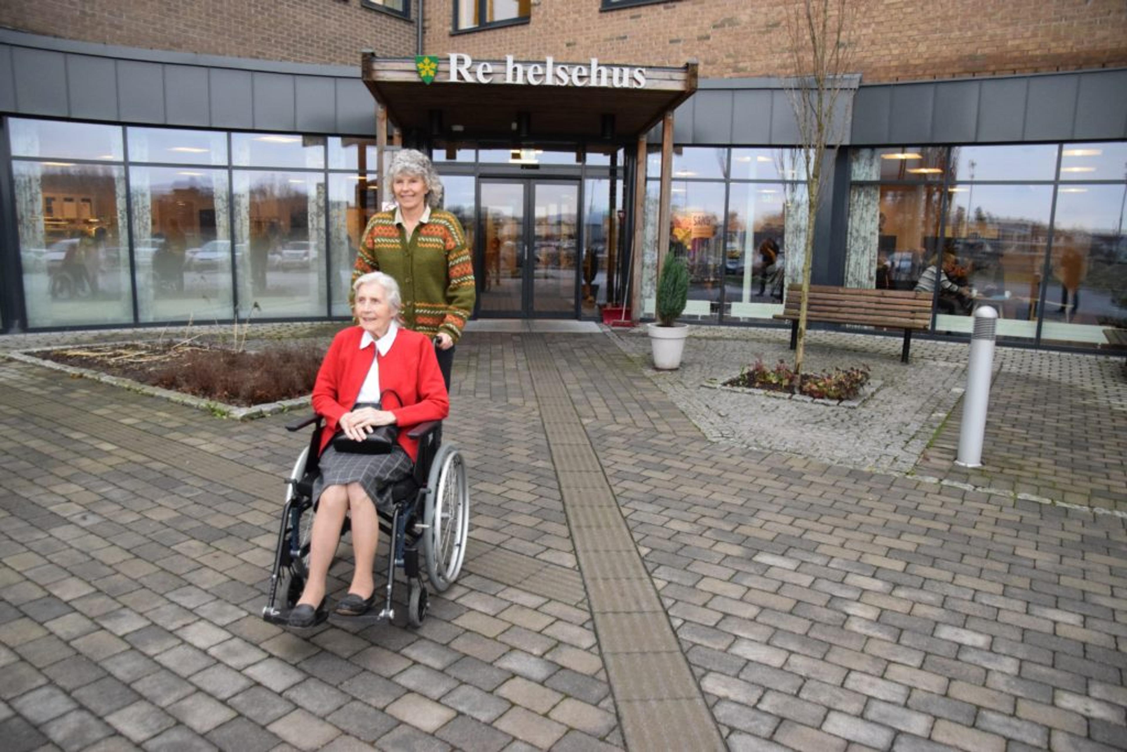 FULL FART: Gudrun Lien (88) bor på Re helsehus, og får besøk av en besøksvenn hver mandag ettermiddag. Da er det ut å få lufta seg litt, og henge på Re-torvet. Foto: Stian Ormestad.