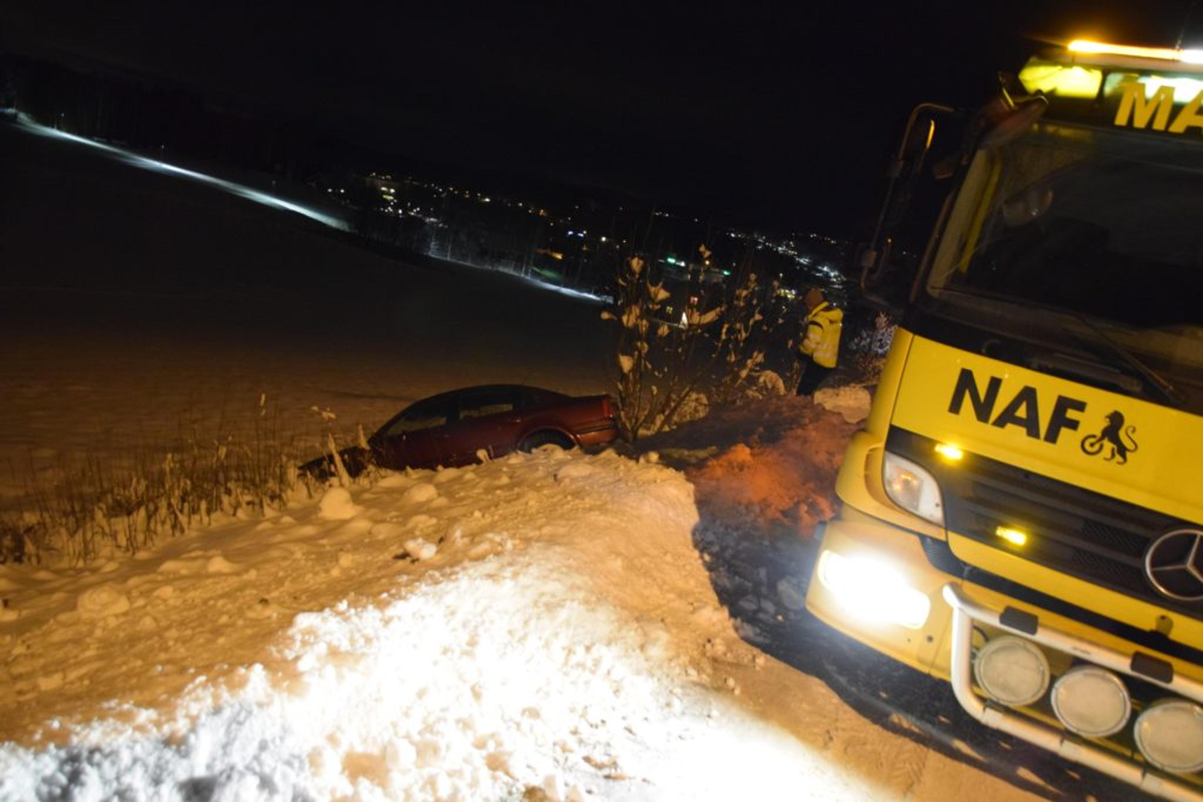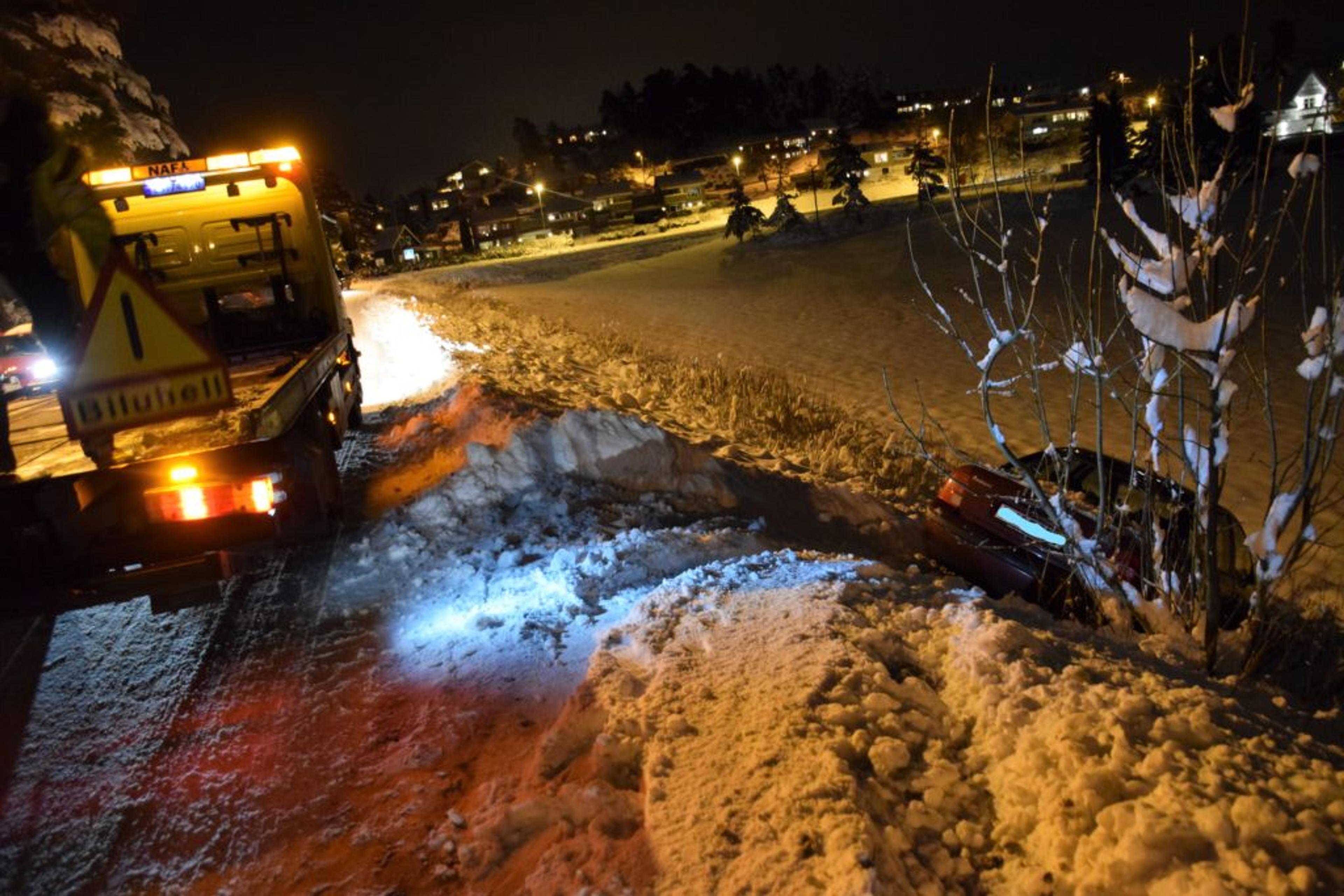 Utforkjøringen skjedde onsdag kveld 29. november, og ved 19-tida var bergningen av bilen langt nedi skråningen i gang.
